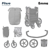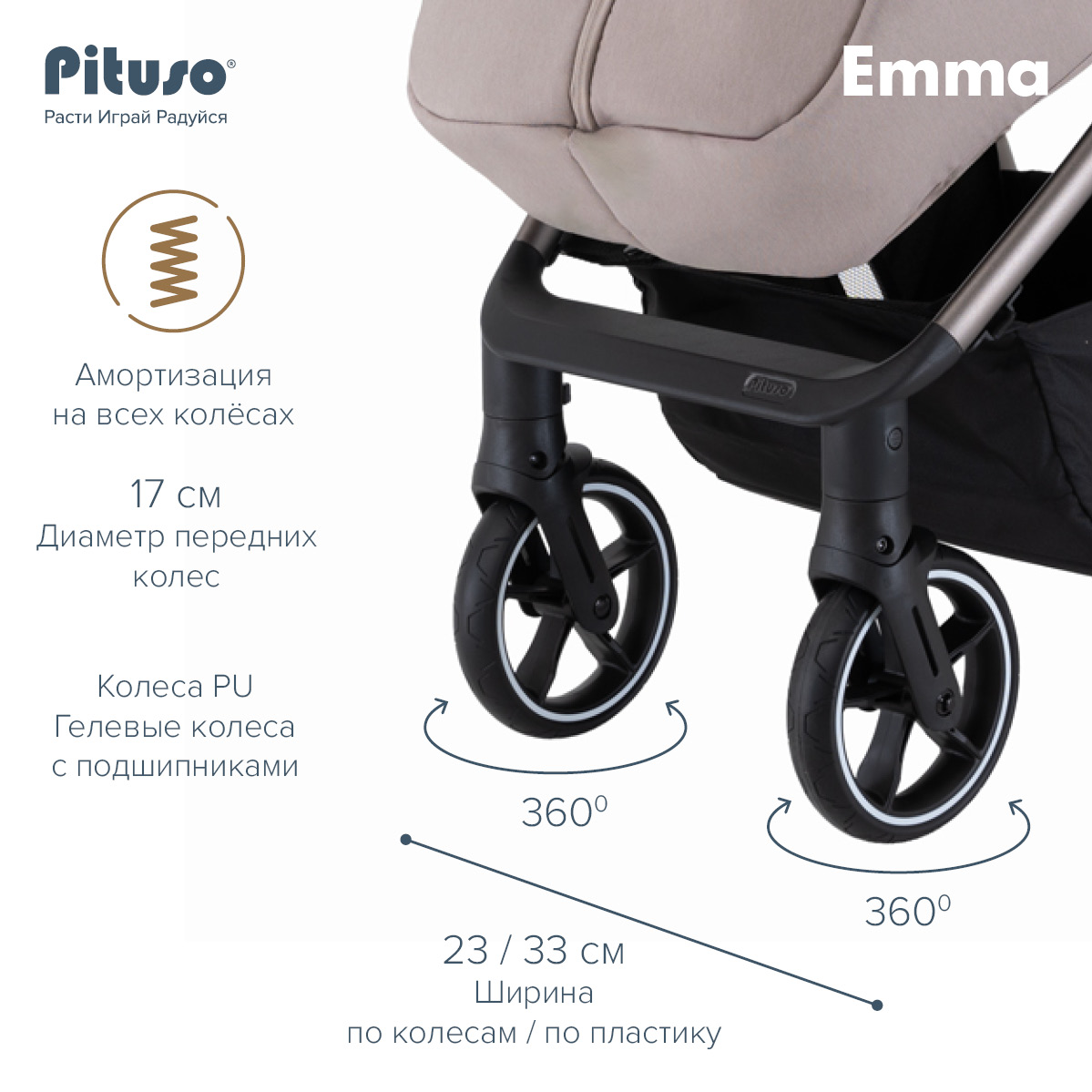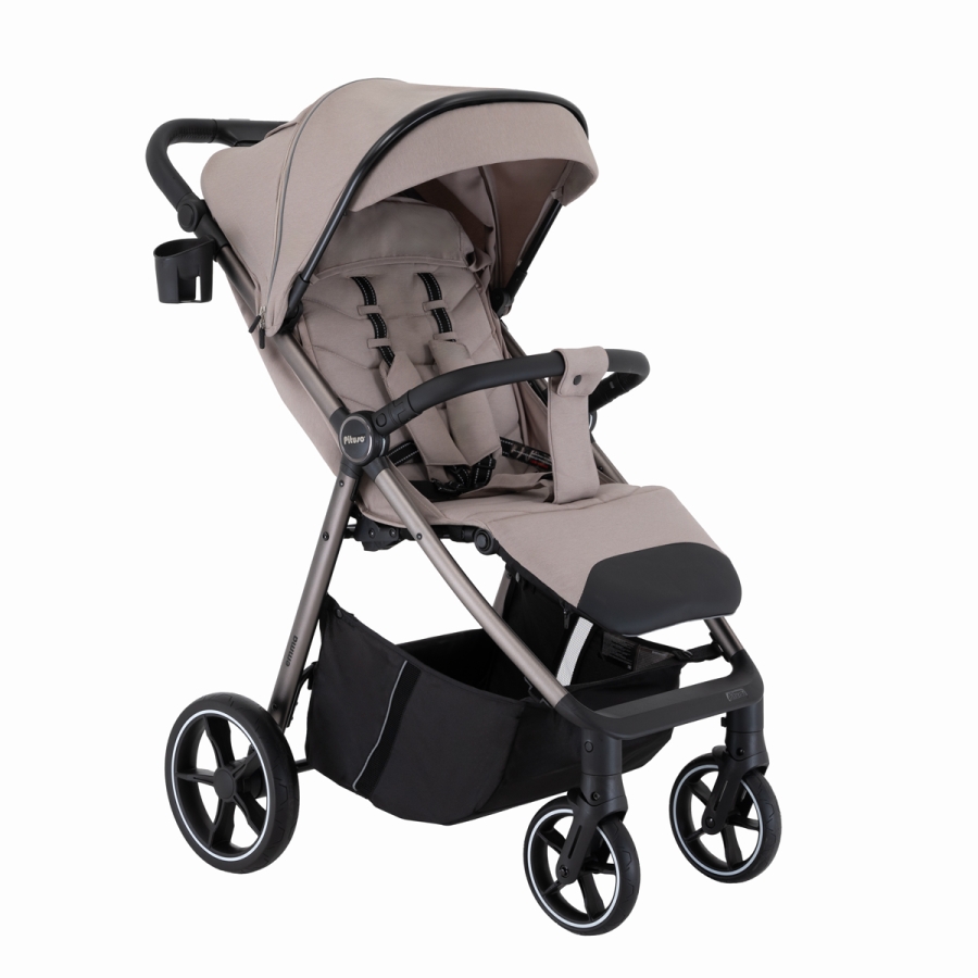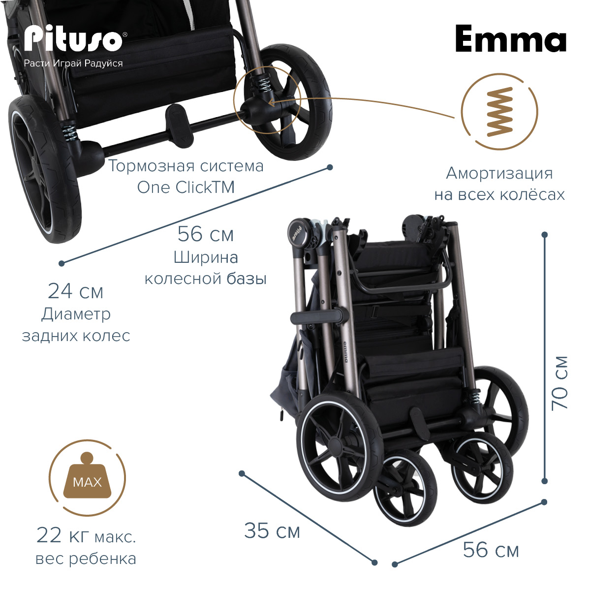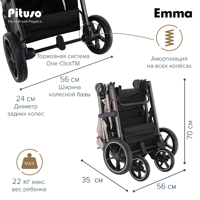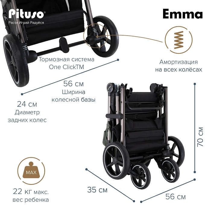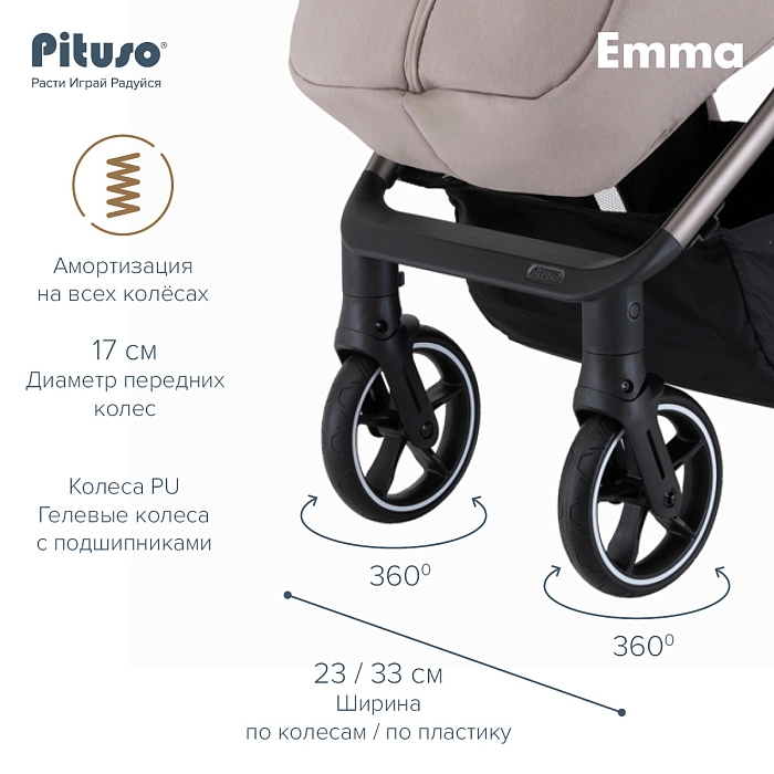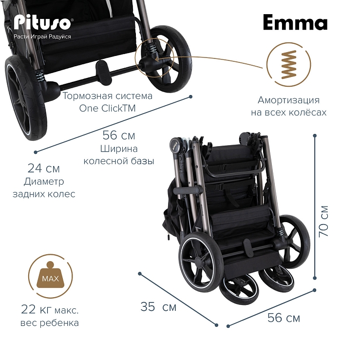 Во всех колёсах Pituso Emma предусмотрена амортизация, за счёт чего коляска мягче проходит неровности и бордюры. Большие PU‑колёса на подшипниках улучшают плавность хода, а тормозная система One ClickTM позволяет одним нажатием надёжно зафиксировать коляску.