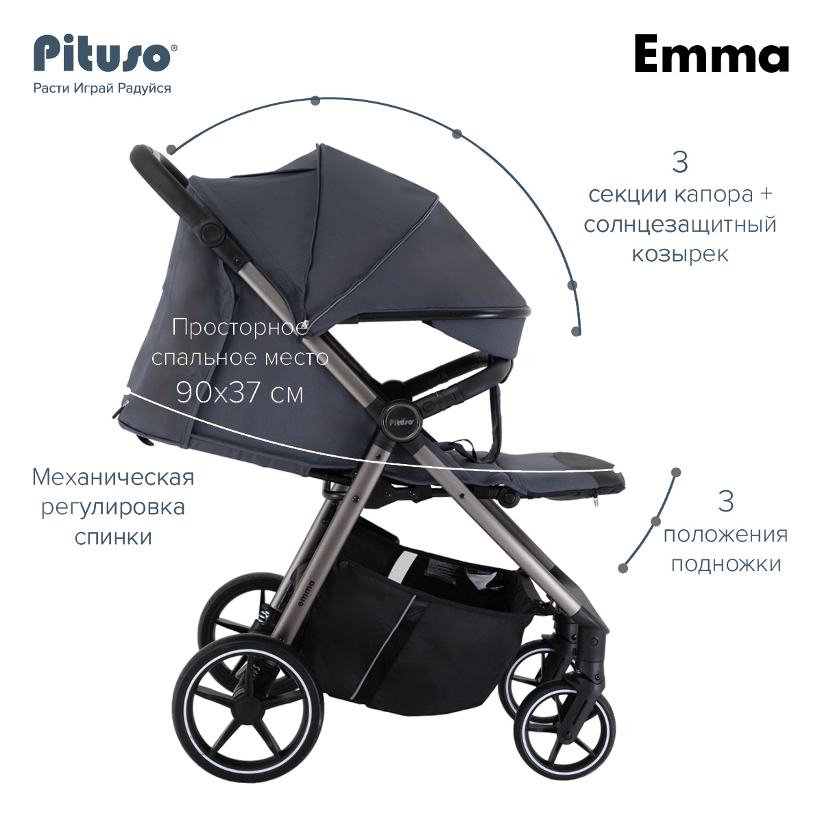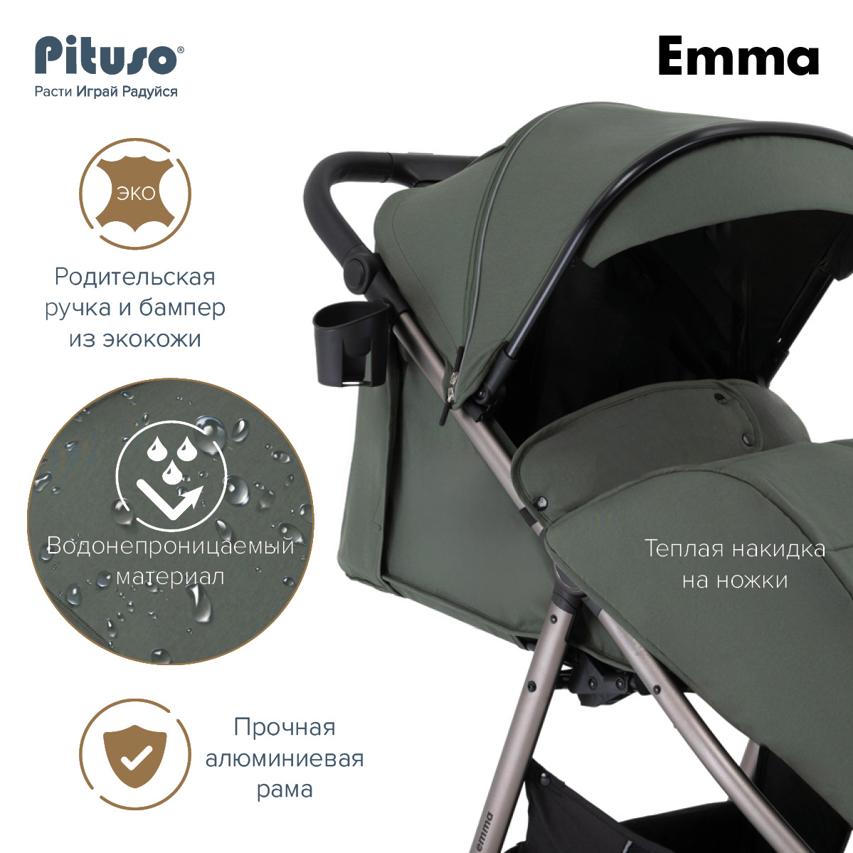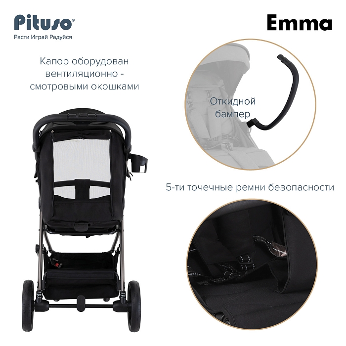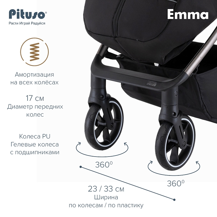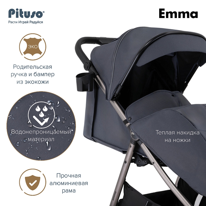 Прогулочная коляска Pituso Emma выполнена в современном, лаконичном дизайне и представлена в нескольких актуальных расцветках: тёмно‑синий, чёрный, зелёный, капучино и графит, что прекрасно подходит как для мальчиков, так и для девочек. Такие цвета хорошо сочетаются с зимней и демисезонной одеждой и подходят как для мам, так и для пап.