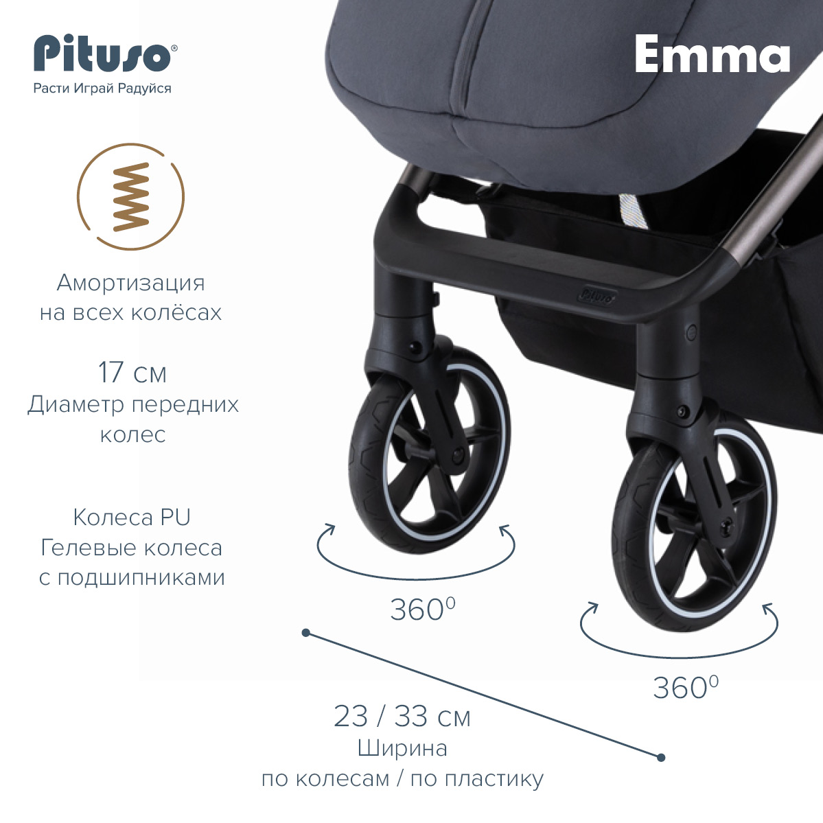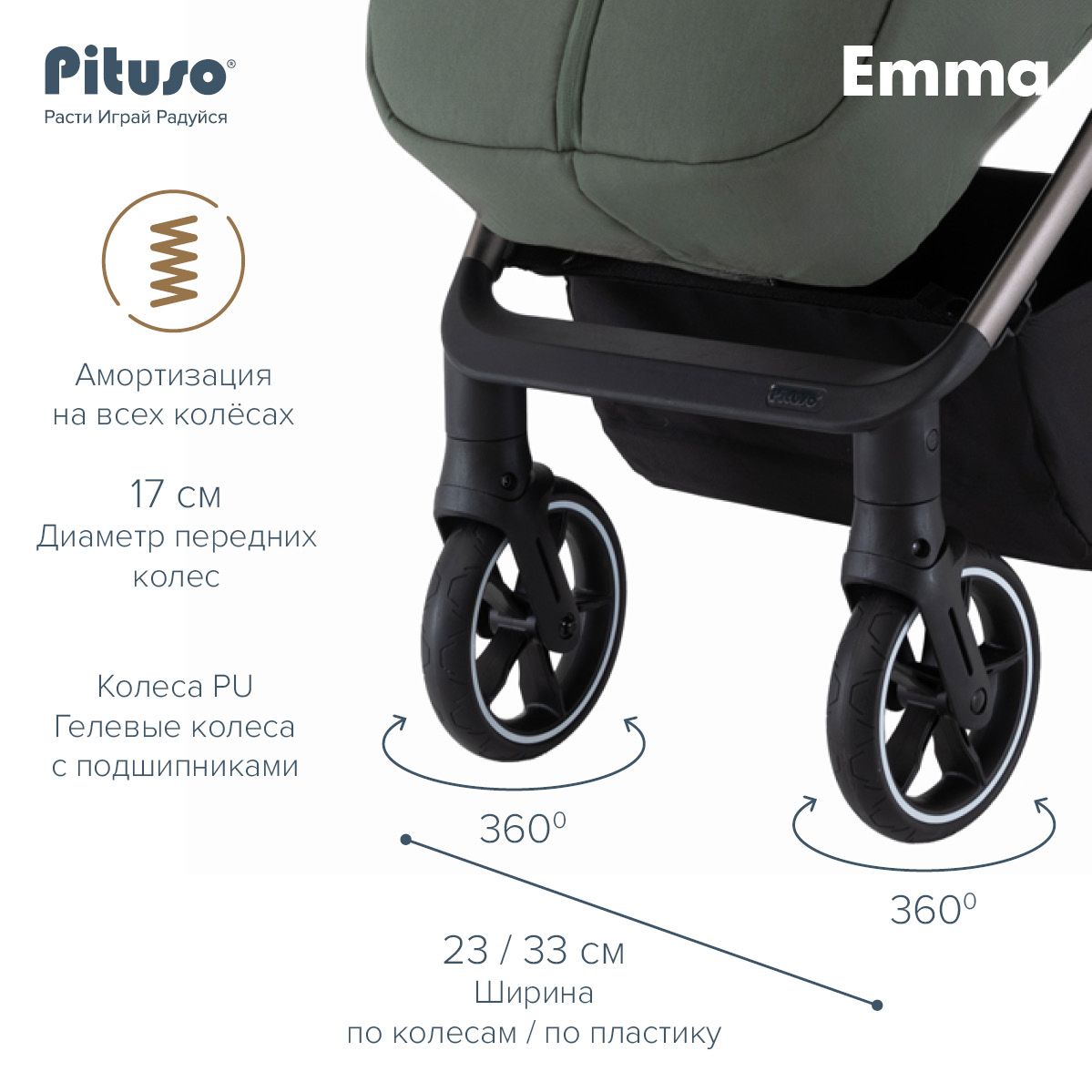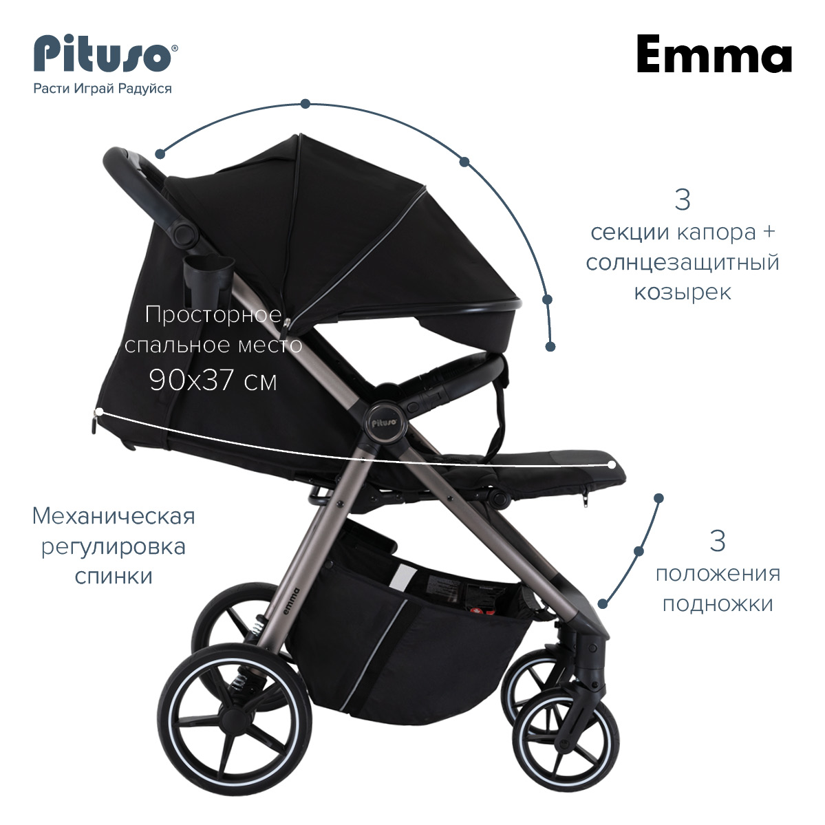 Прогулочная коляска Pituso Emma выполнена в современном, лаконичном дизайне и представлена в нескольких актуальных расцветках: тёмно‑синий, чёрный, зелёный, капучино и графит, что прекрасно подходит как для мальчиков, так и для девочек. Такие цвета хорошо сочетаются с зимней и демисезонной одеждой и подходят как для мам, так и для пап.