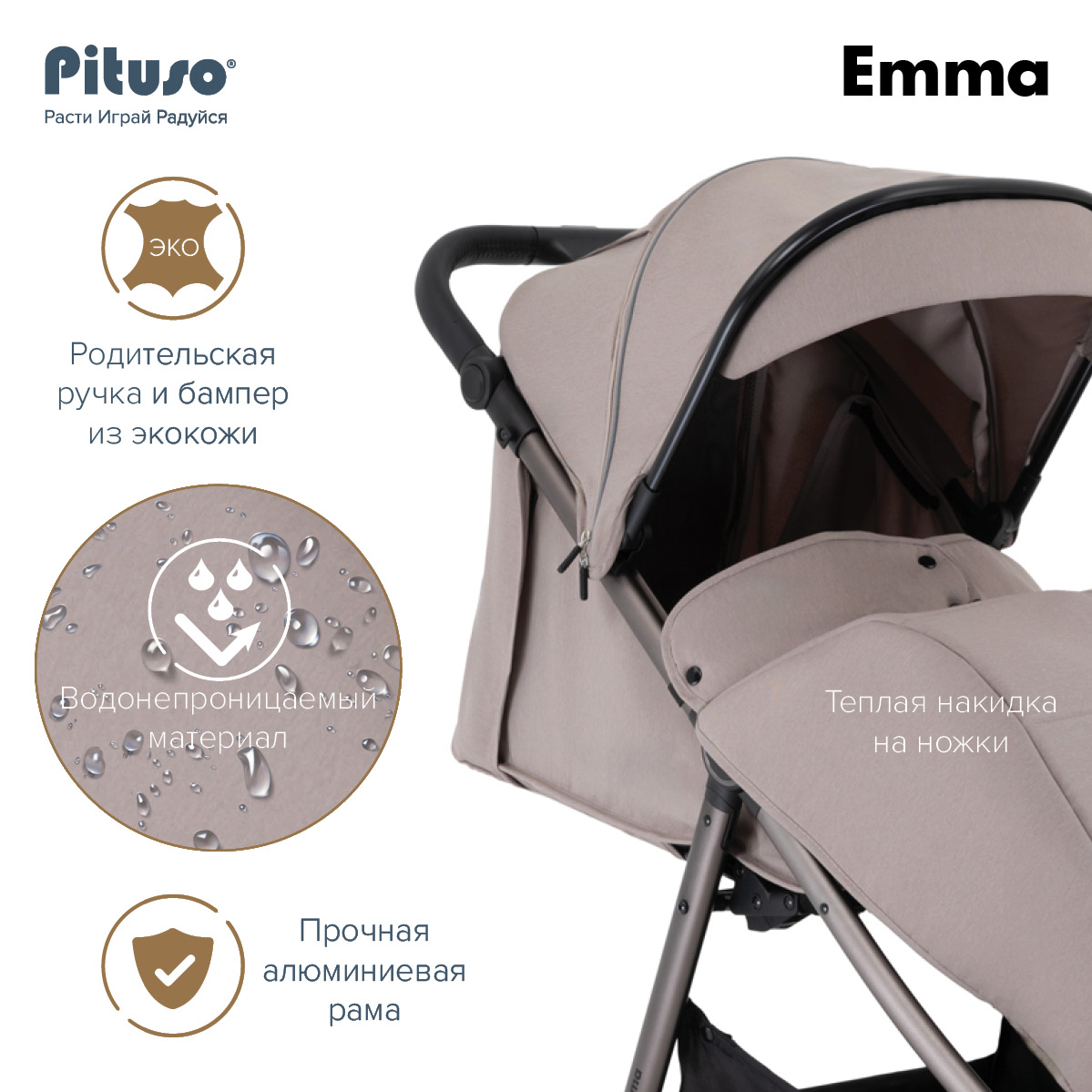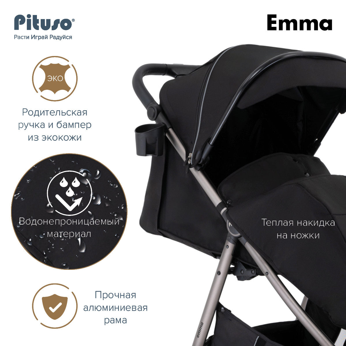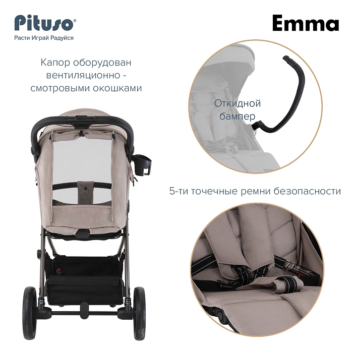 Универсальная прогулочная коляска Pituso Emma - качественная и стильная всесезонная модель с прочной конструкцией, рассчитанная на ежедневные прогулки, в том числе в холодное время года. Коляска сочетает удобный для ребёнка прогулочный блок, надёжную систему безопасности и комфортное управление для родителей.
