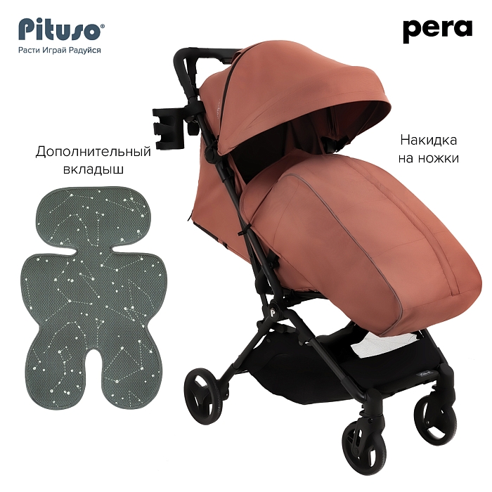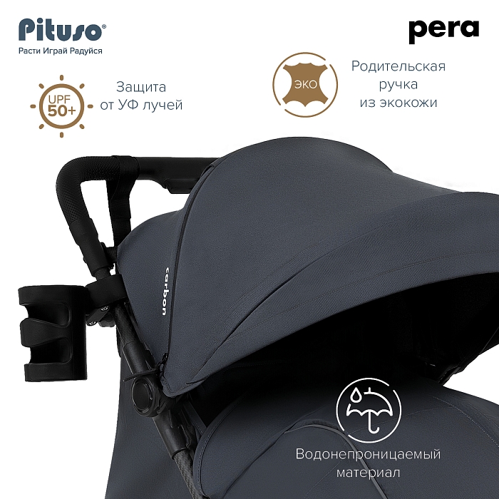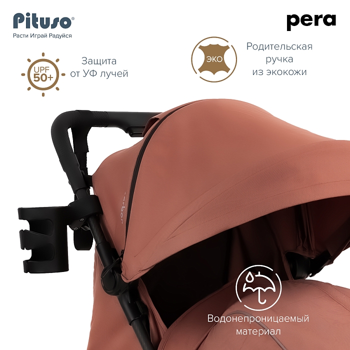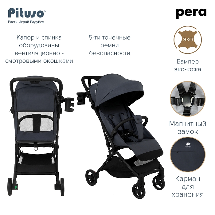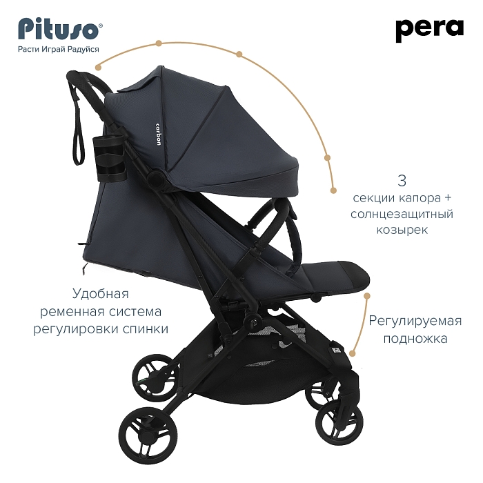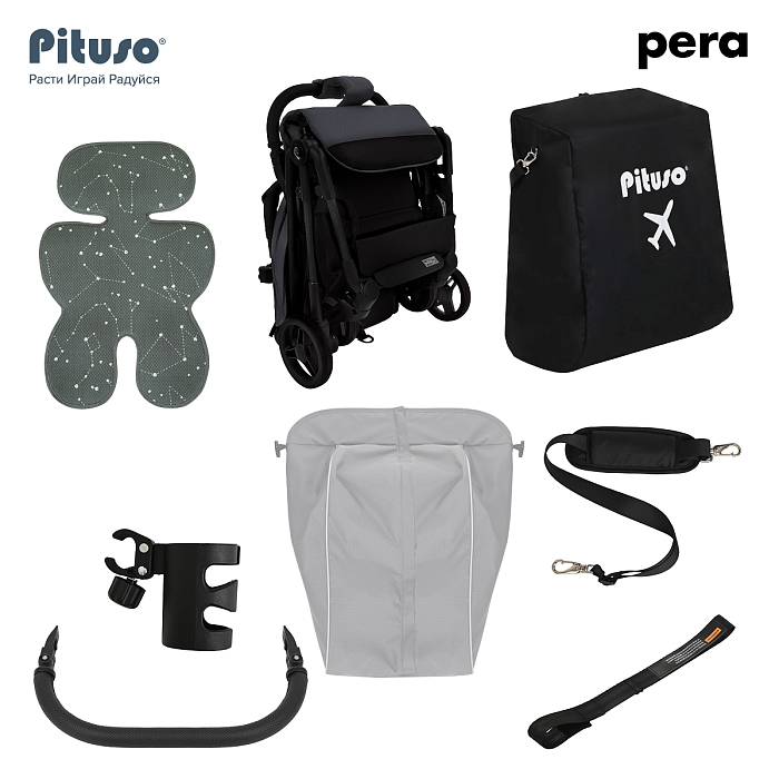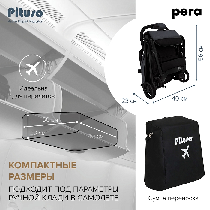 Новая версия стильной, маневренной и легкой (5.7 кг) прогулочной коляски Pituso Pera идеально подходит не только для прогулок, но и путешествий. Складываясь одной рукой до очень компактных размеров, коляска подходит под параметры ручной клади в самолете.