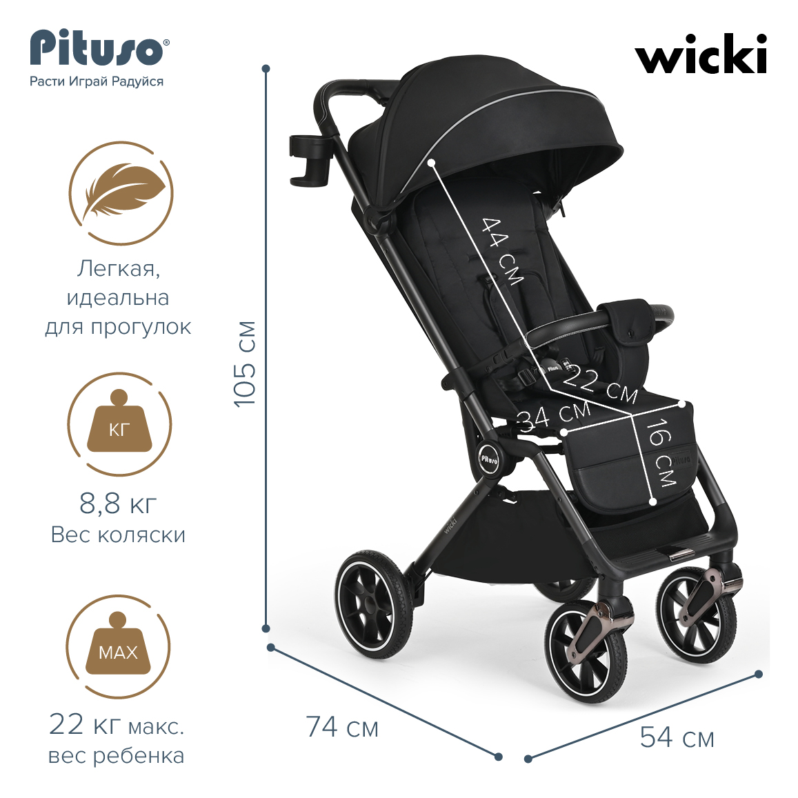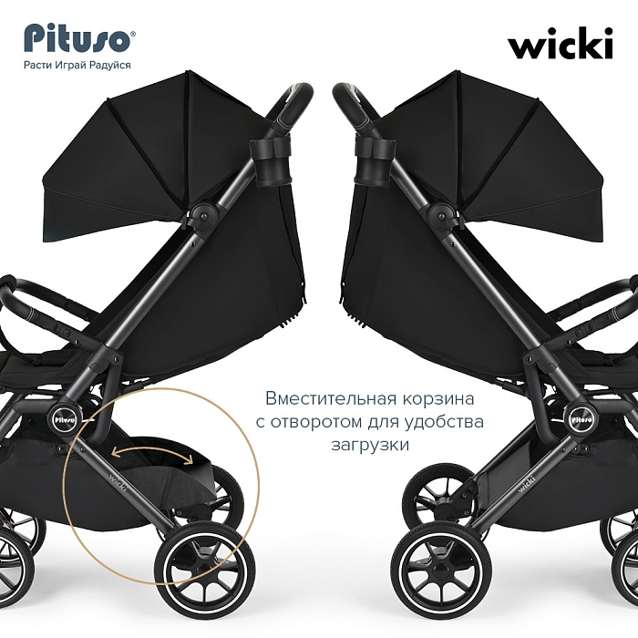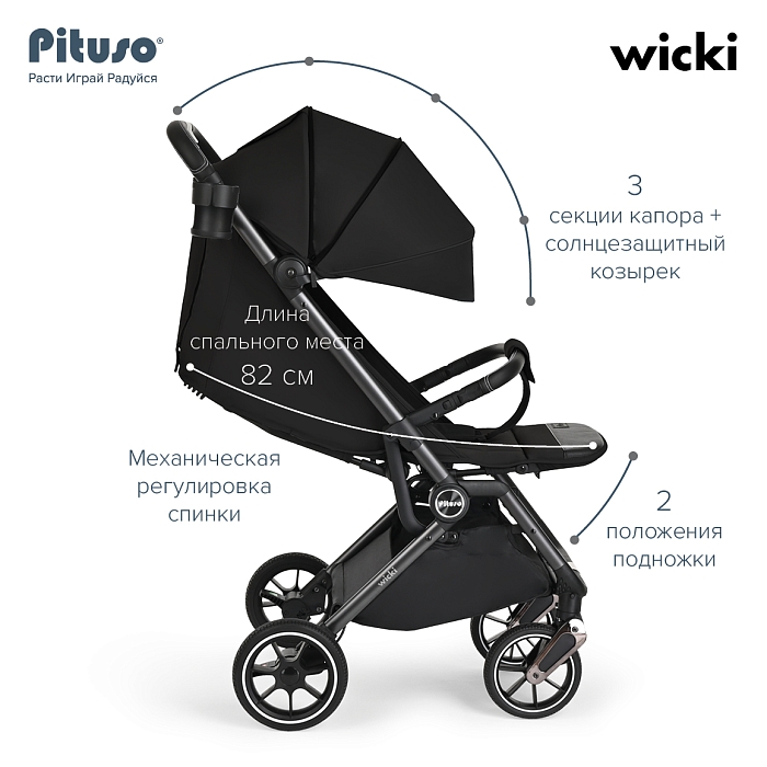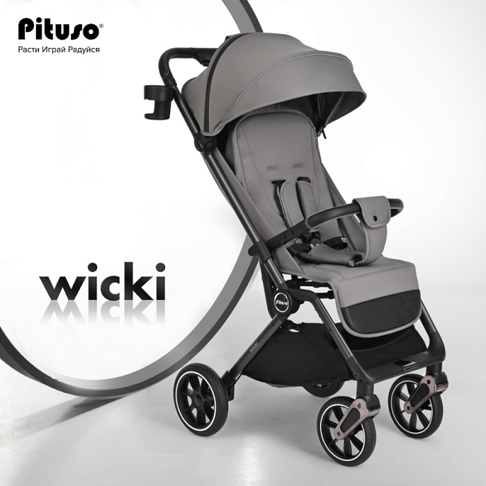 Детская прогулочная коляска Pituso Wicki – стильная, маневренная и лёгкая модель весом всего 8,8 кг, которая подойдёт и для повседневных прогулок по городу, и для путешествий. Коляска складывается до очень компактных размеров и ориентирована на параметры ручной клади в самолёте (проверьте на сайте авиакомпании), поэтому её удобно брать с собой в поездки.