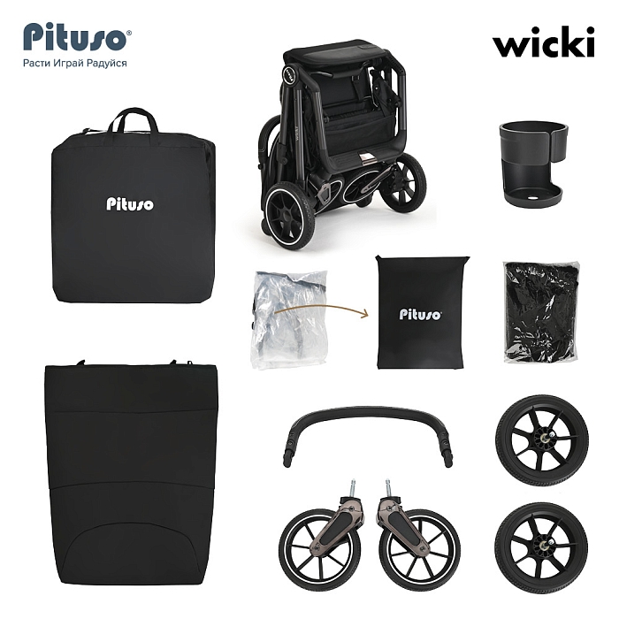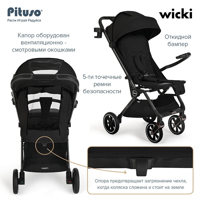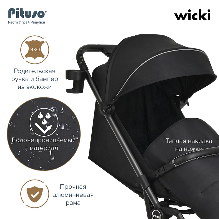 Pituso Wicki оснащена откидным бампером из экокожи и удобной родительской ручкой с практичной отделкой, которая приятно лежит в руке и легко очищается от загрязнений. В комплекте предусмотрены дождевик, москитная сетка, подстаканник и сумка‑чехол для переноски.