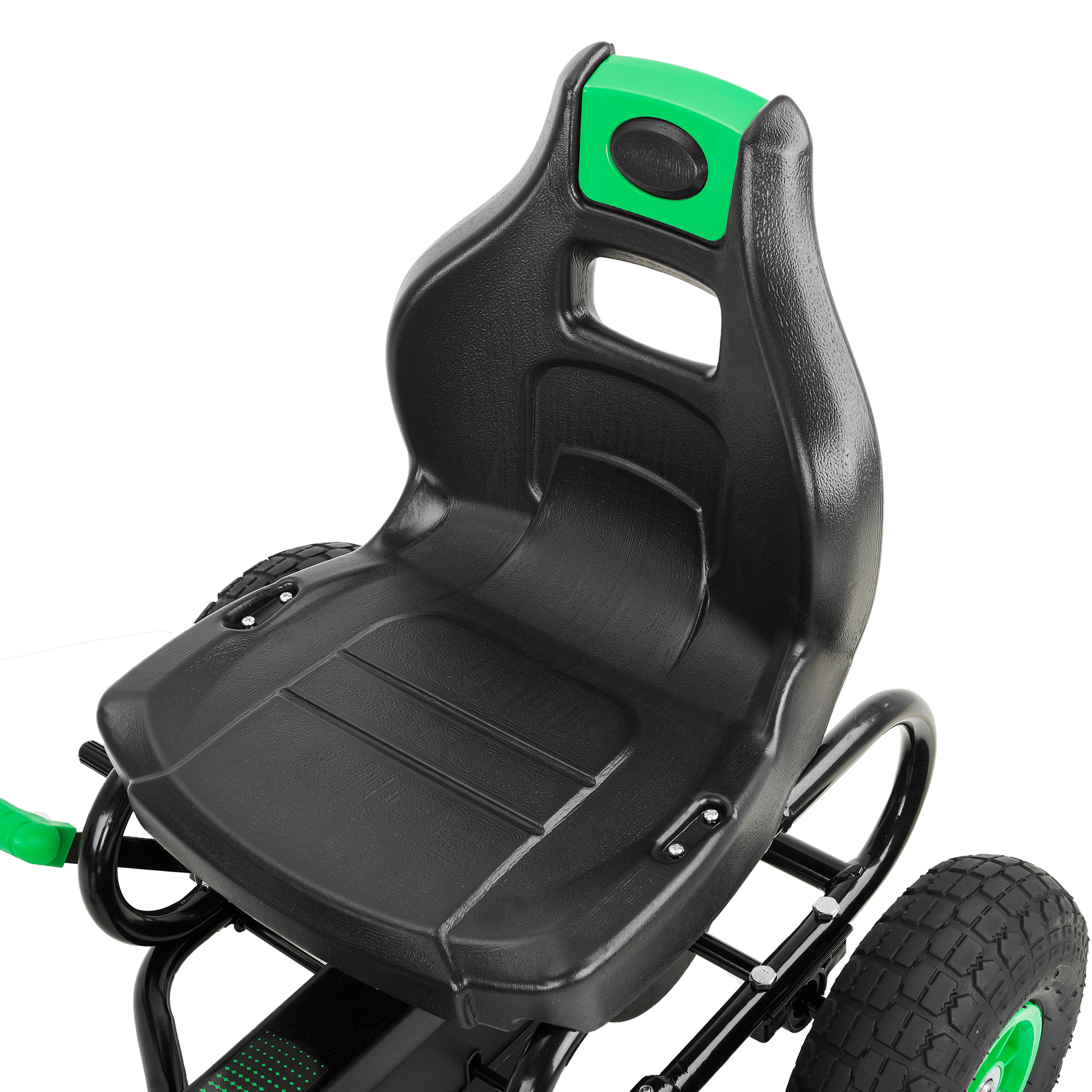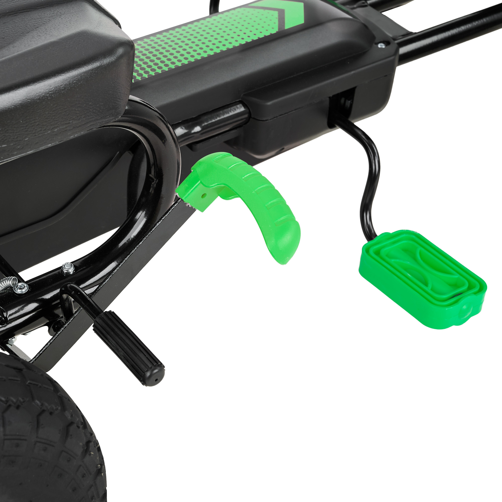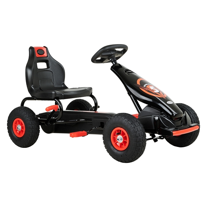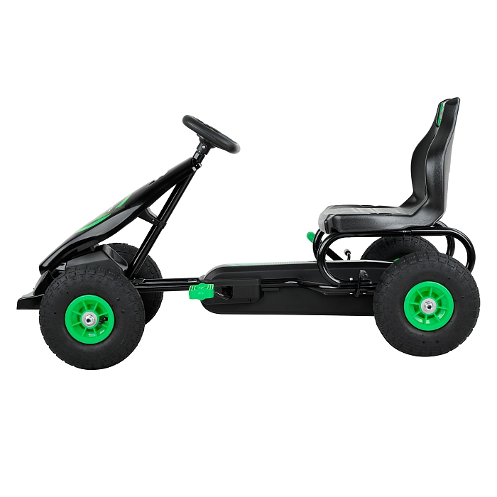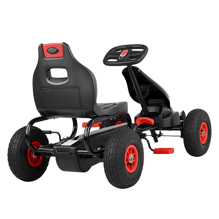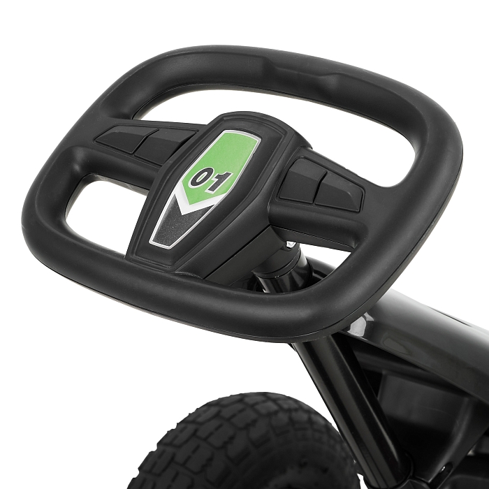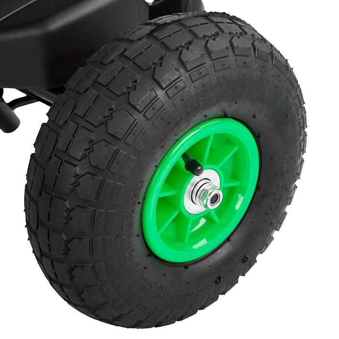 Пневматические надувные колёса диаметром около 24 см дают более мягкий ход и лучшее сцепление с поверхностью по сравнению с полностью пластиковыми колесами. Металлические рулевая и колесные оси повышают надежность конструкции и устойчивость при поворотах. Такая компоновка делает картинг подходящим для катания по ровному асфальту, тротуарной плитке и утоптанным дорожкам.