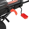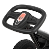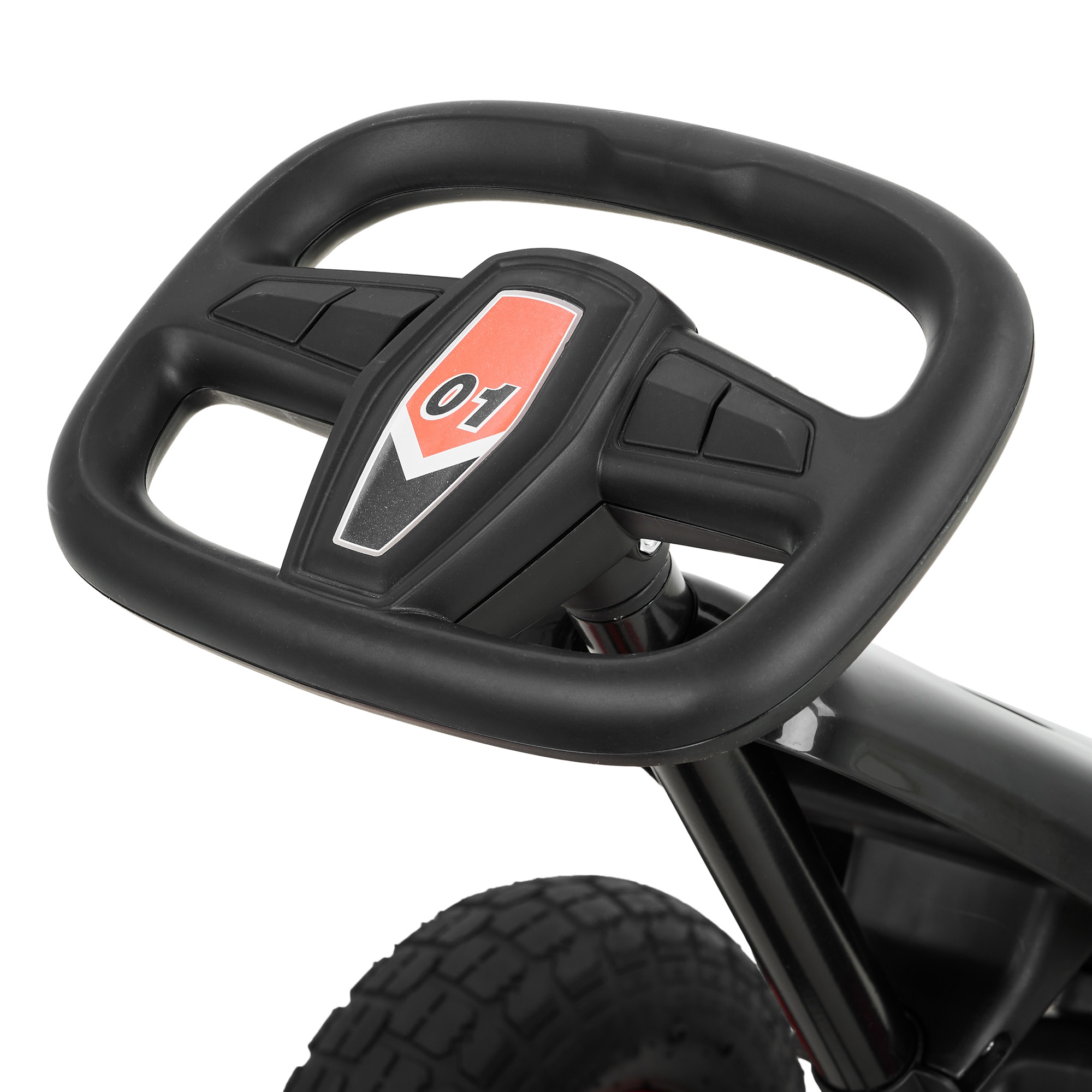 Модель выполнена на железной раме, что повышает общую прочность и ресурс при активной эксплуатации. Педальный привод с цепной передачей обеспечивает ровное движение и помогает ребенку лучше чувствовать транспорт. Рулевое колесо размером примерно 23×1,65 см удобно лежит в руках, а ручной тормоз позволяет быстро снижать скорость и останавливаться при необходимости.