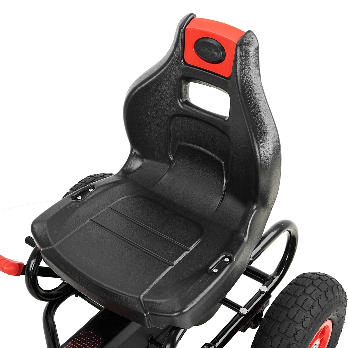 Удобное регулируемое сиденье имеет два положения: расстояние от сиденья до педали в нижнем положении составляет примерно 32 см (I положение) и 29 см (II положение). Это позволяет подстроить посадку под рост ребенка и продлить срок использования картинга. Посадочное место имеет ширину около 22 см, глубину 33 см, высота спинки сиденья 32 см, высота от пола до сиденья 35 см - такая геометрия подходит детям старше 5 лет с разным ростом.
