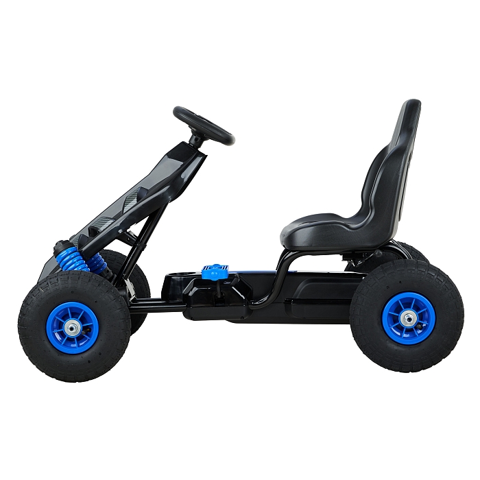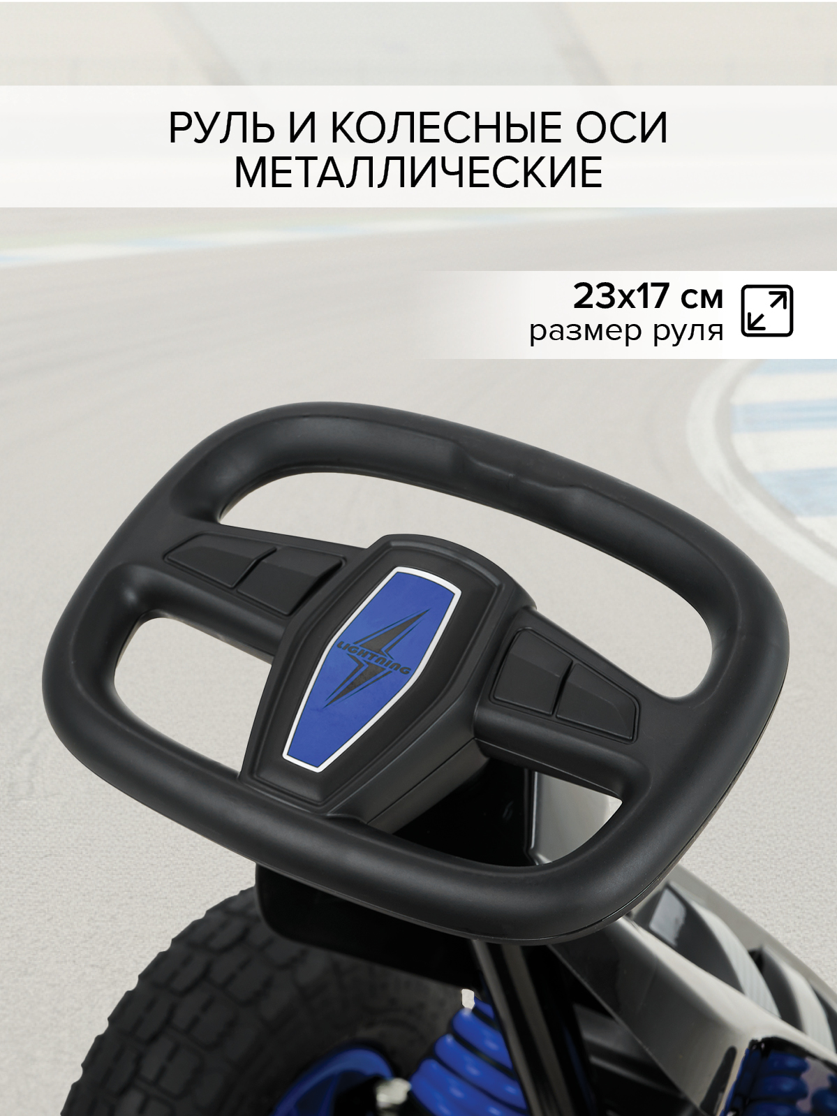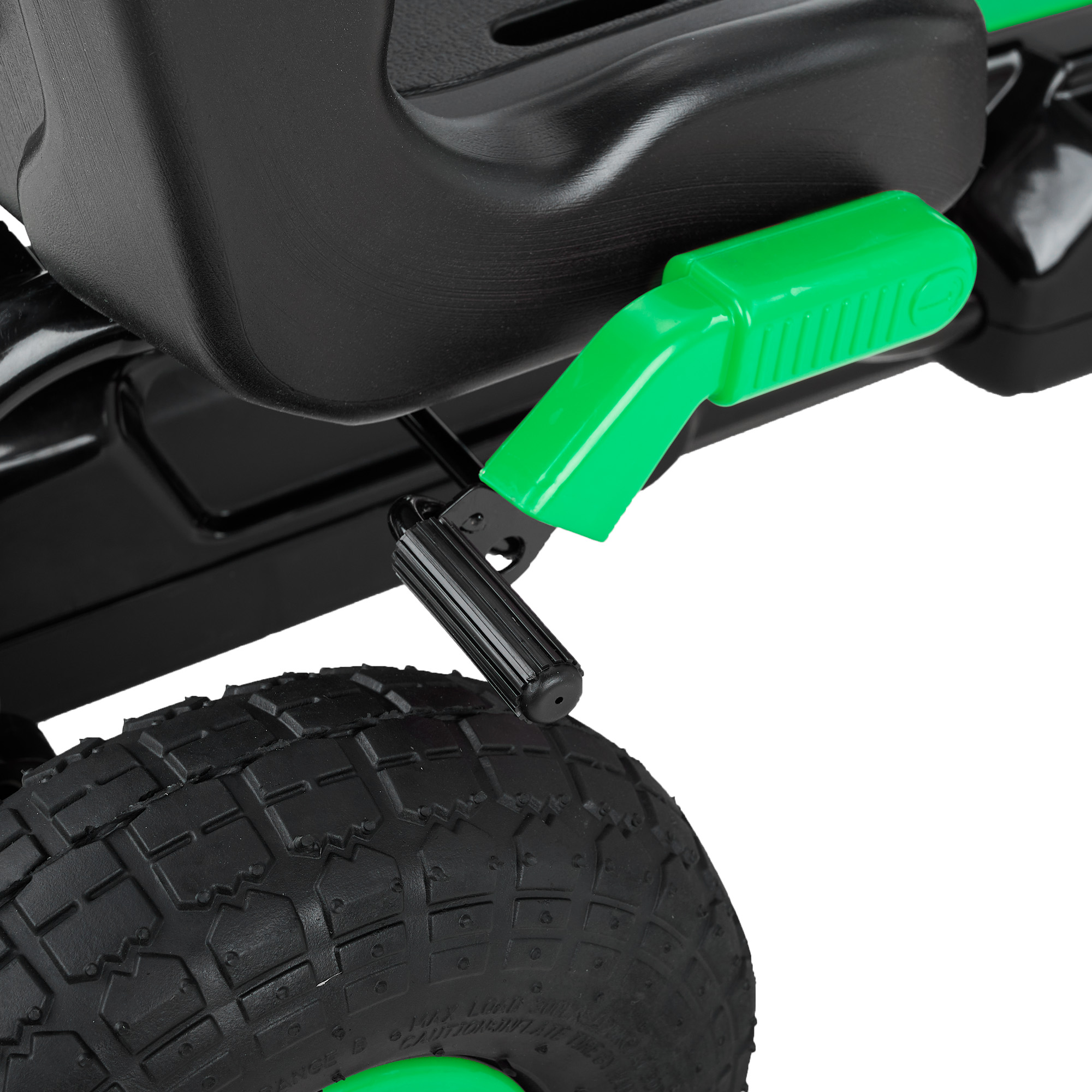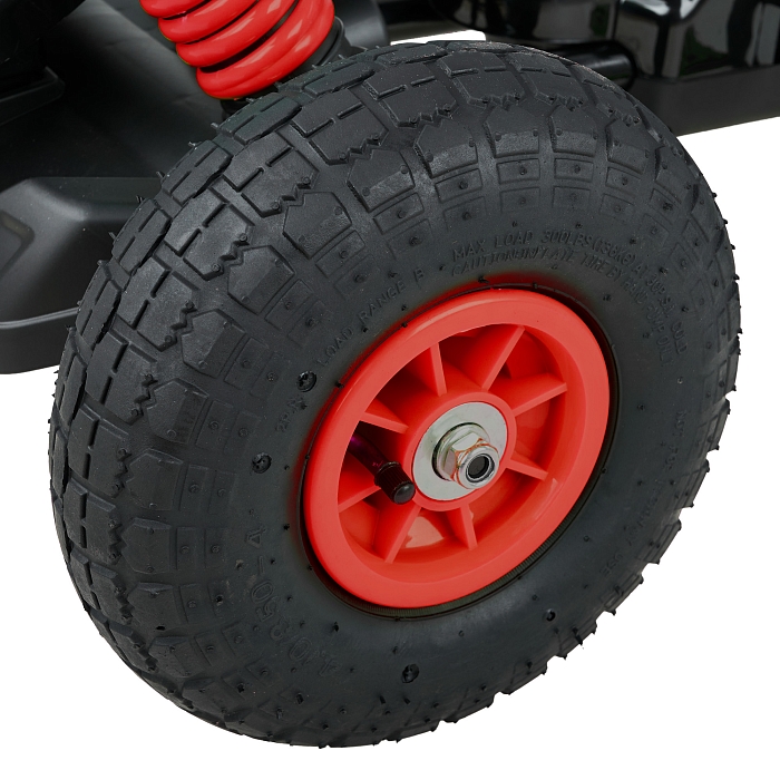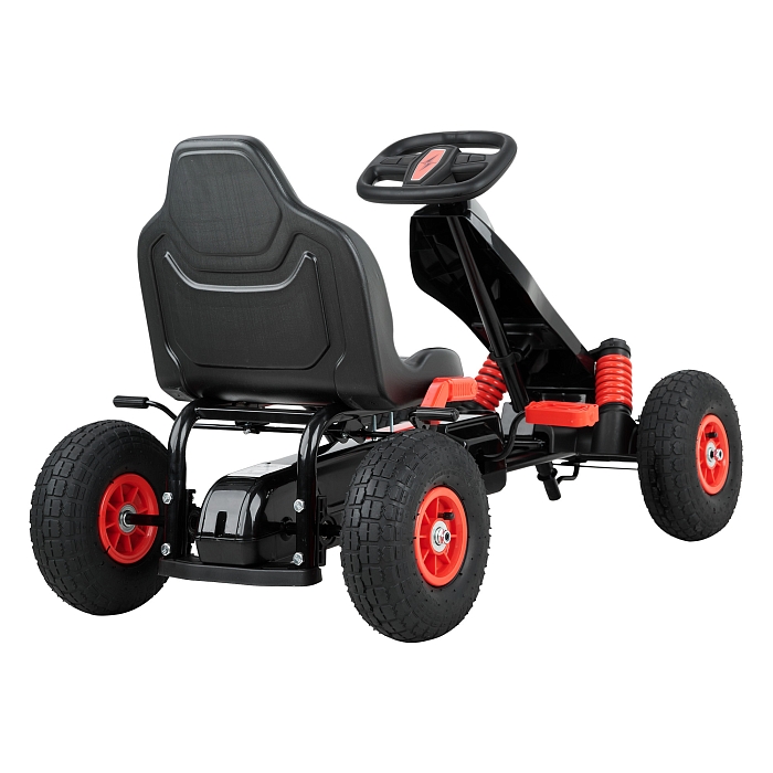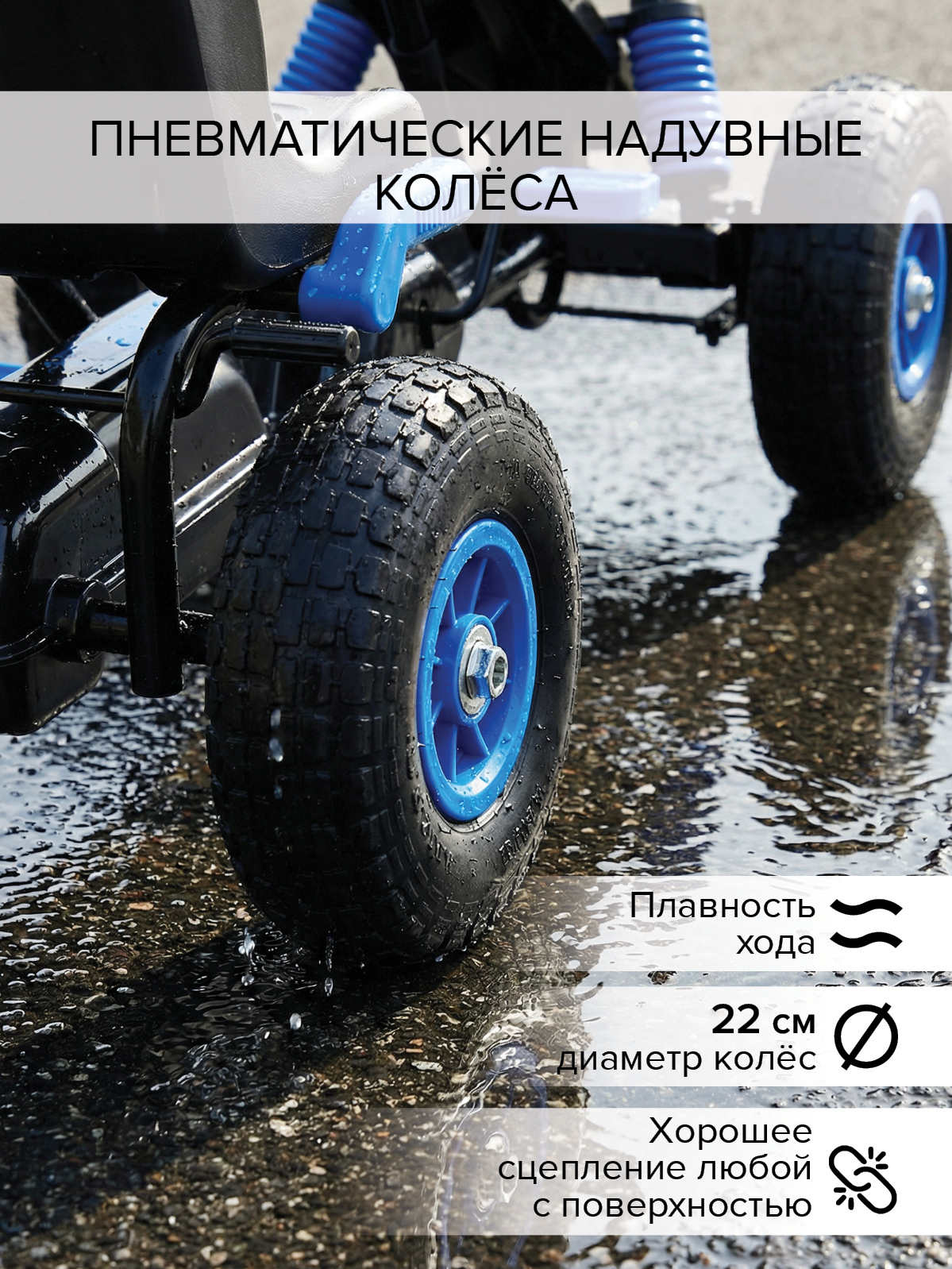 Пневматические надувные колёса диаметром примерно 22 см обеспечивают более мягкий ход и лучшее сцепление с поверхностью по сравнению с пластиковыми колесами. Металлические рулевая и колесные оси повышают надежность и устойчивость конструкции при поворотах и маневрах. Такой педальный картинг подойдет для катания по асфальту, тротуарной плитке и ровным парковым дорожкам.