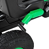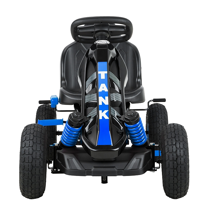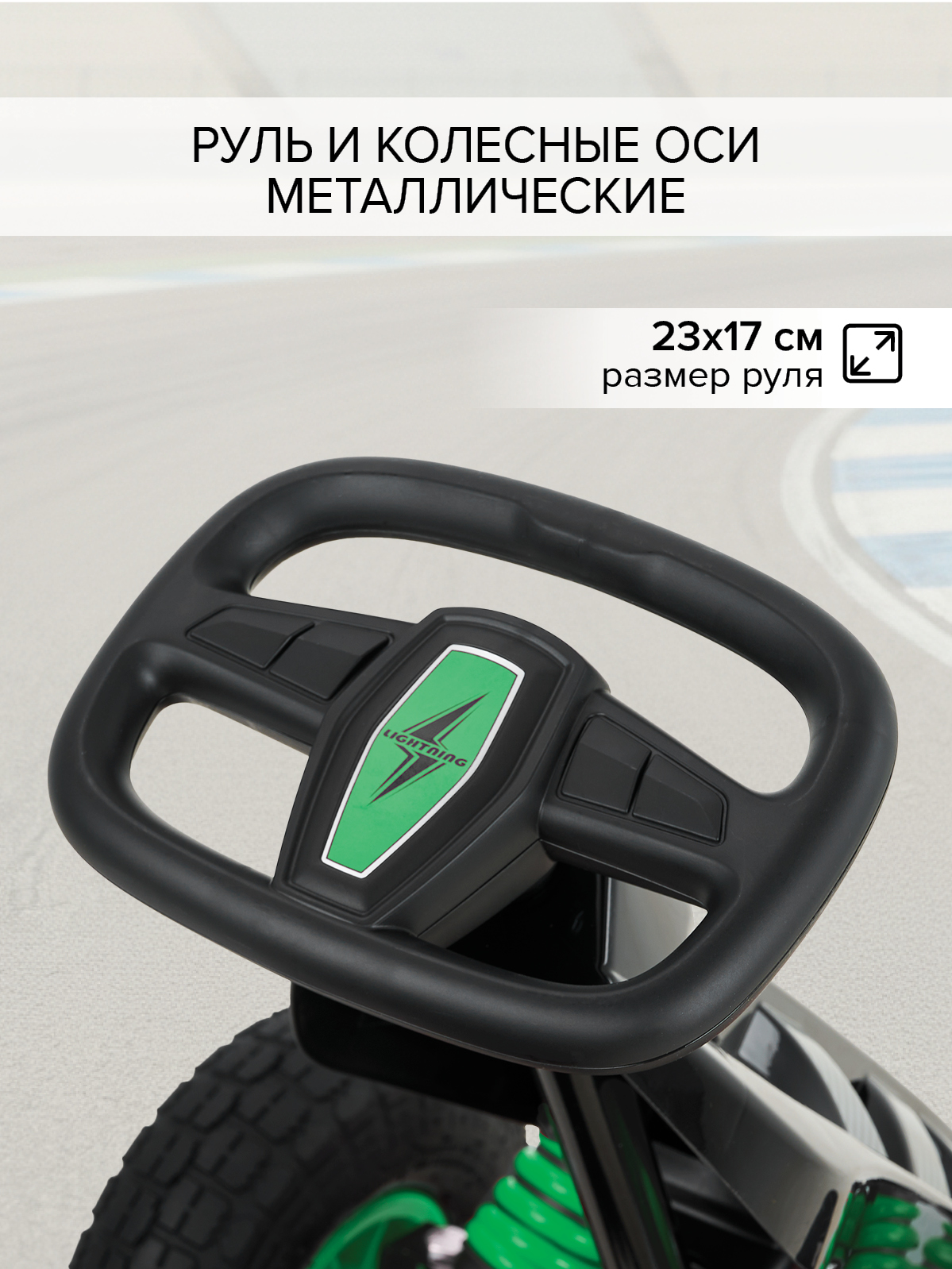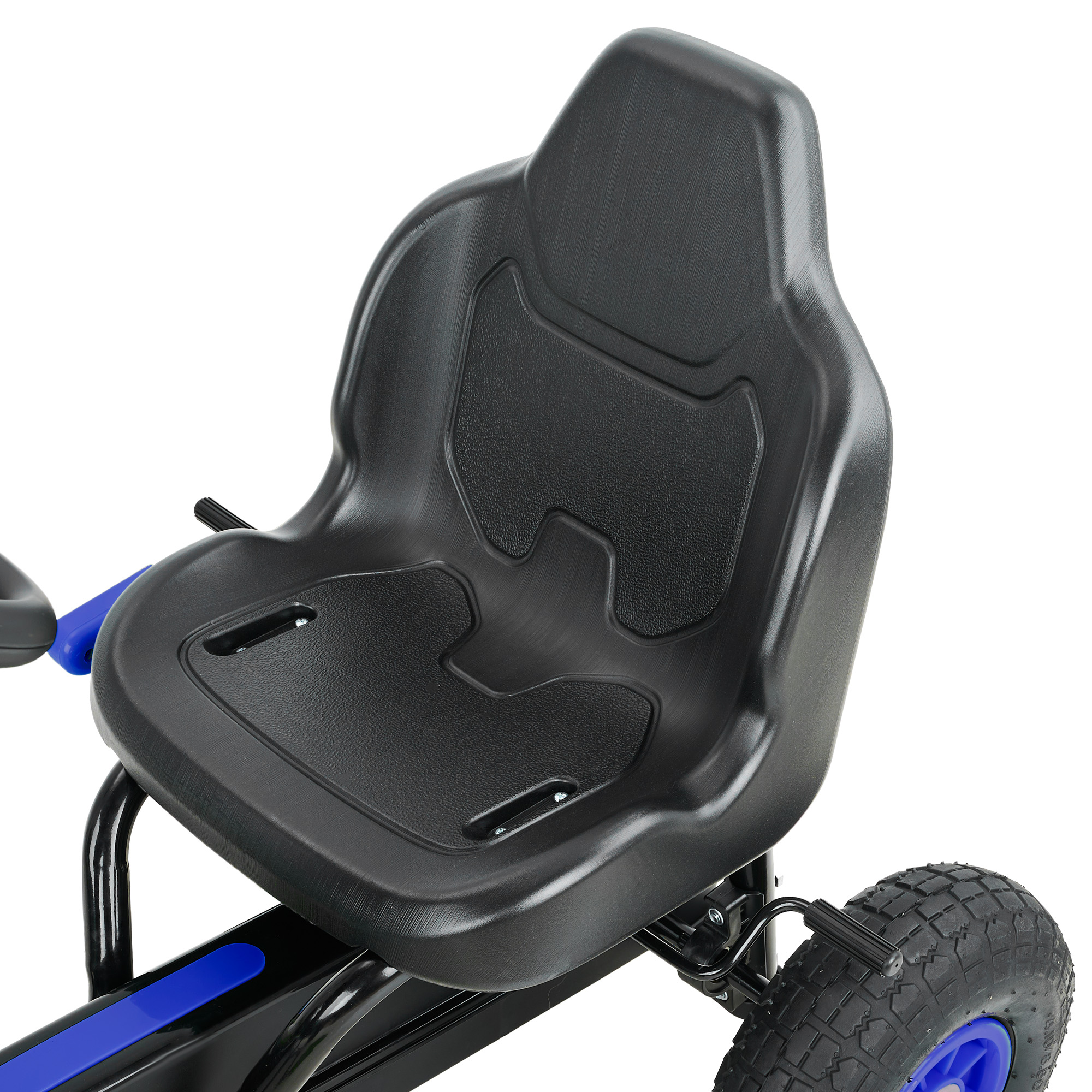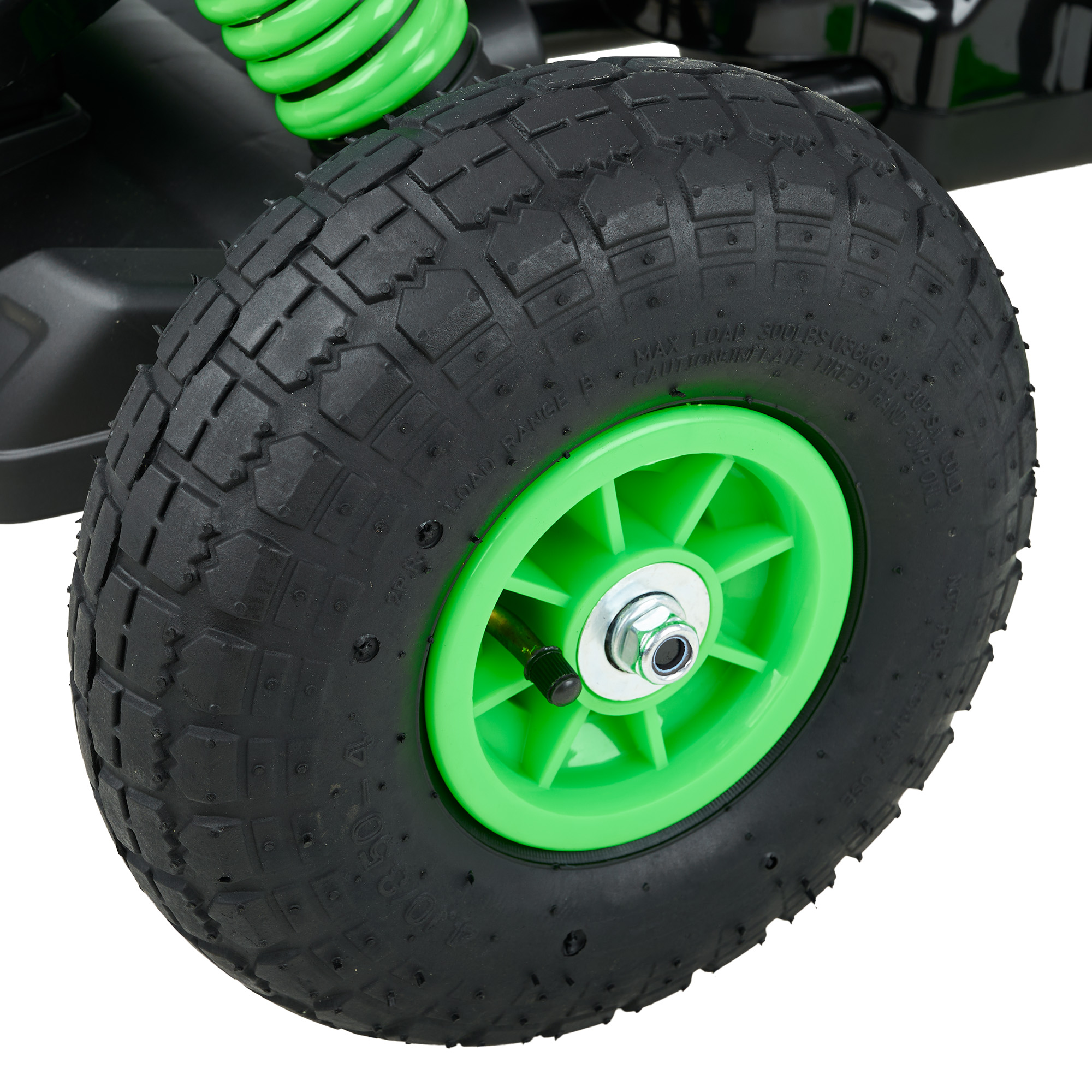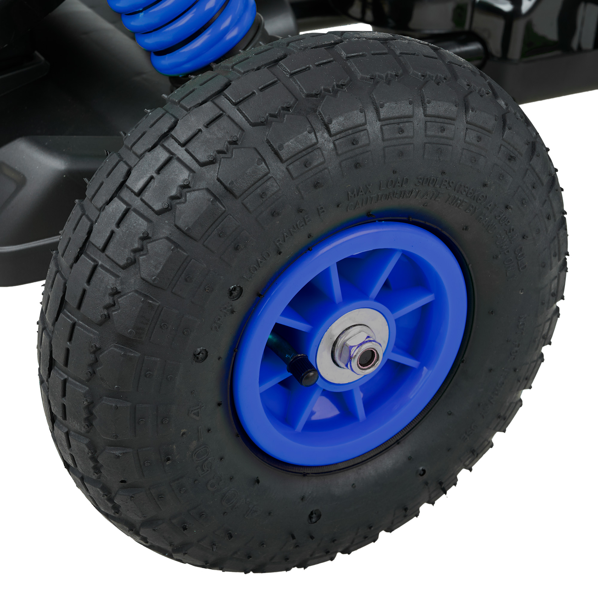 Пневматические надувные колёса диаметром примерно 22 см обеспечивают более мягкий ход и лучшее сцепление с поверхностью по сравнению с пластиковыми колесами. Металлические рулевая и колесные оси повышают надежность и устойчивость конструкции при поворотах и маневрах. Такой педальный картинг подойдет для катания по асфальту, тротуарной плитке и ровным парковым дорожкам.