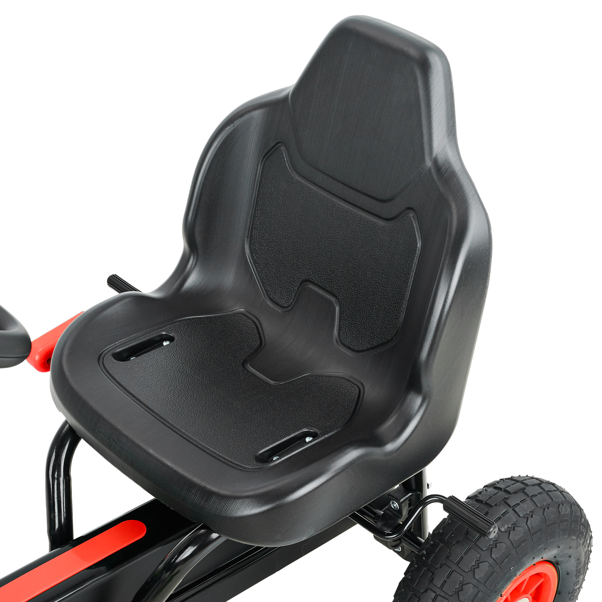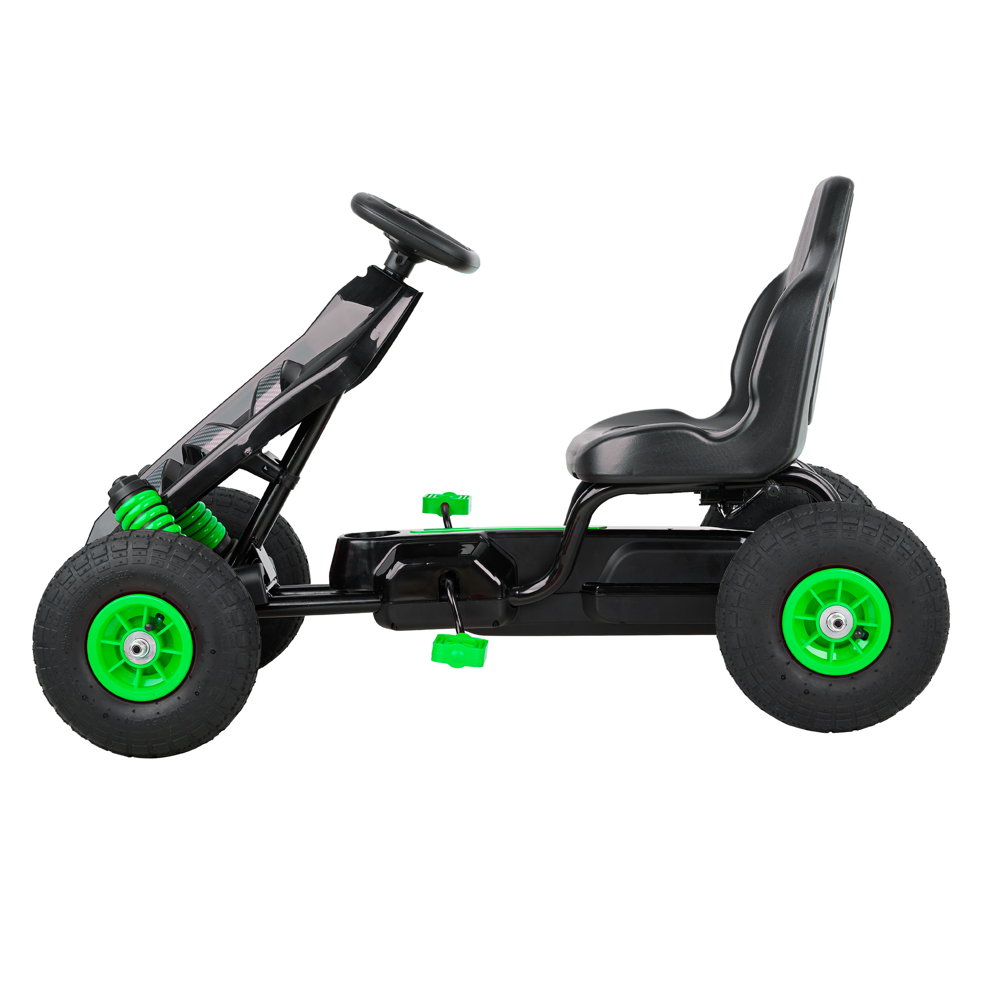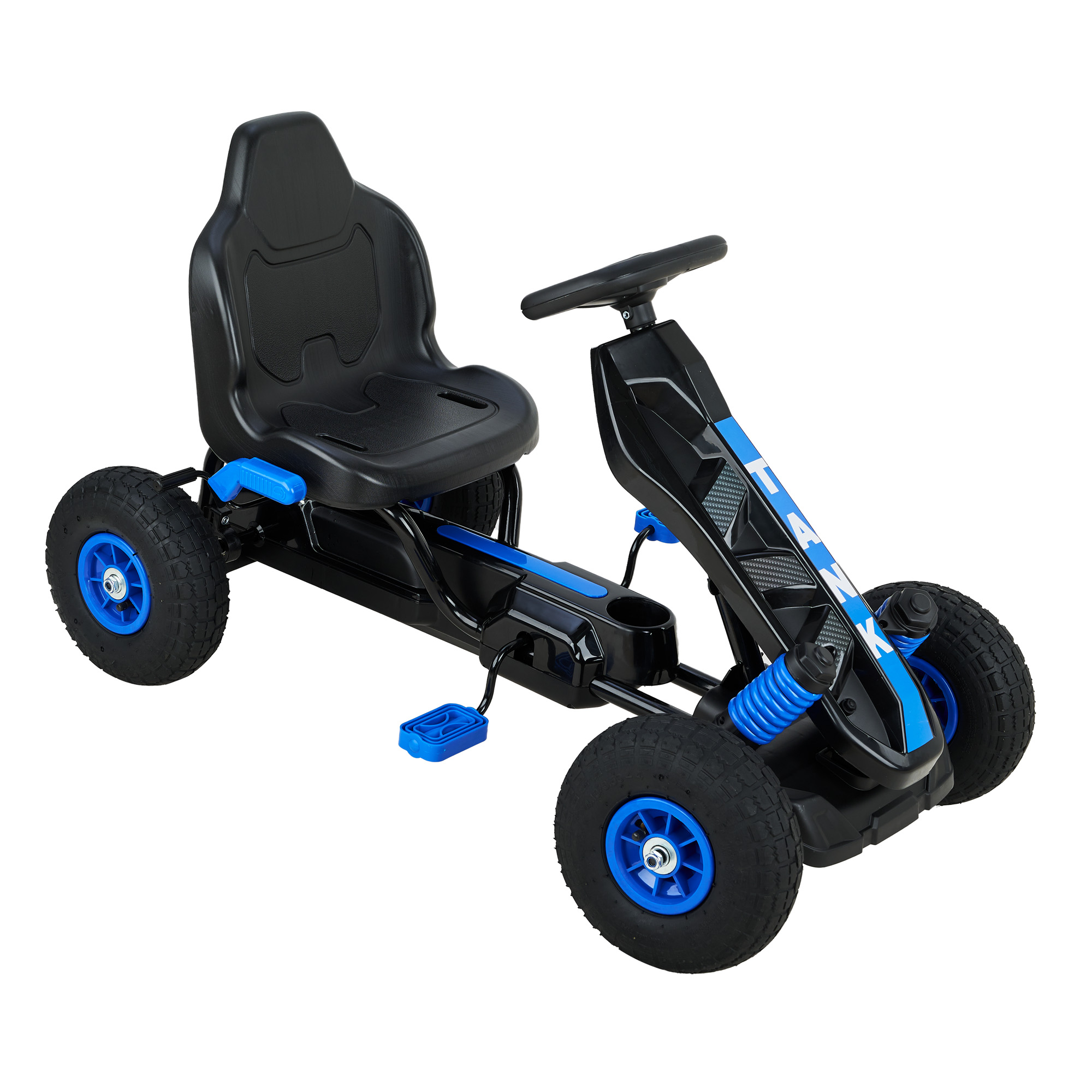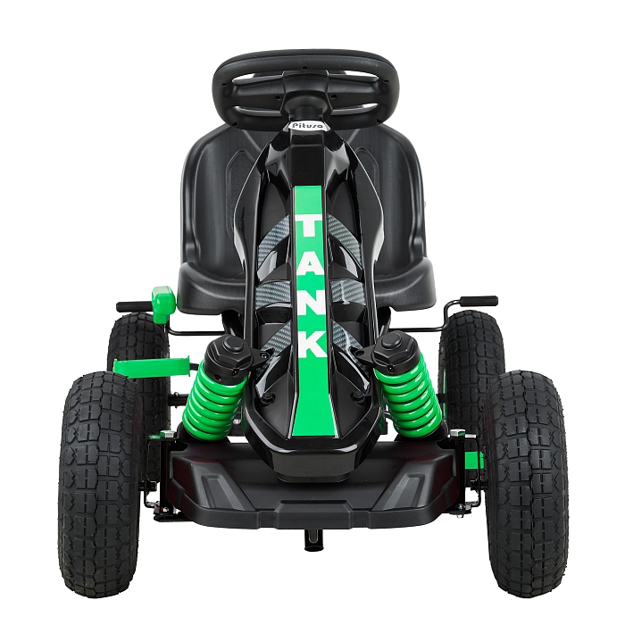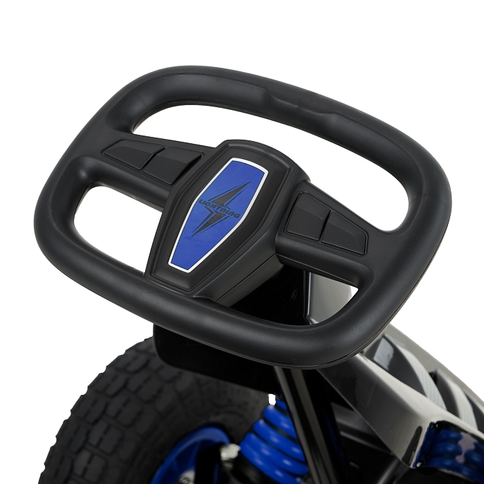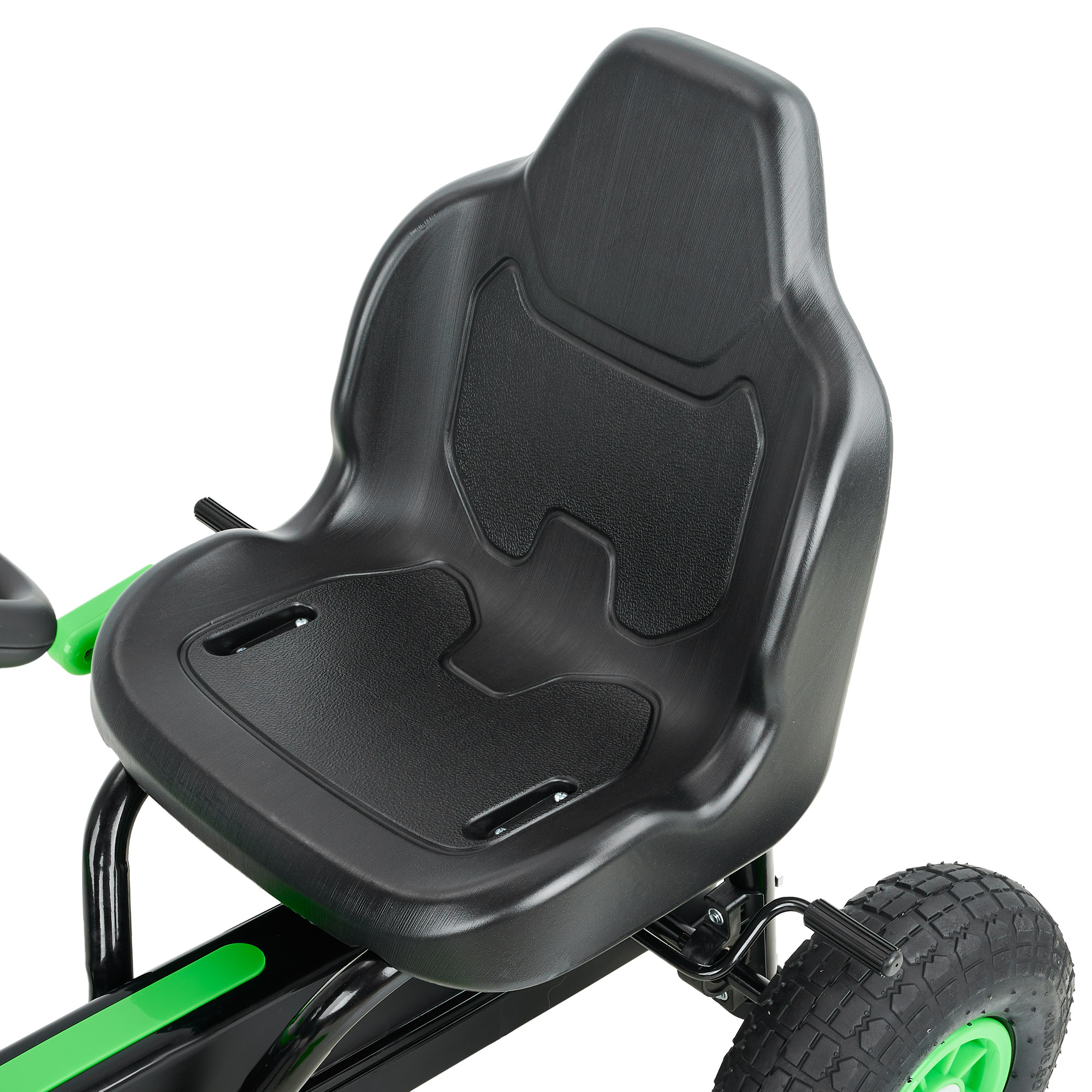Пневматические надувные колёса диаметром примерно 22 см обеспечивают более мягкий ход и лучшее сцепление с поверхностью по сравнению с пластиковыми колесами. Металлические рулевая и колесные оси повышают надежность и устойчивость конструкции при поворотах и маневрах. Такой педальный картинг подойдет для катания по асфальту, тротуарной плитке и ровным парковым дорожкам.