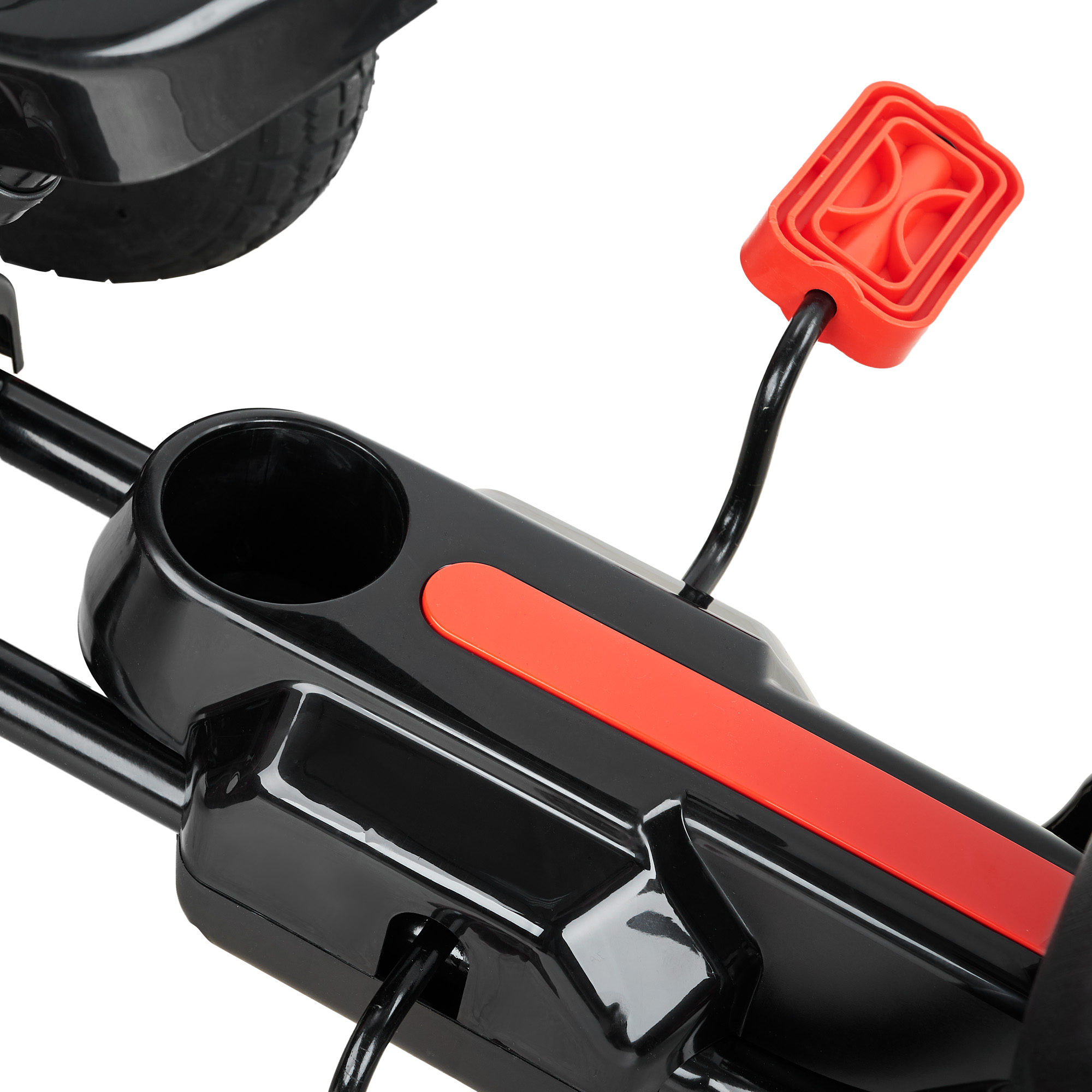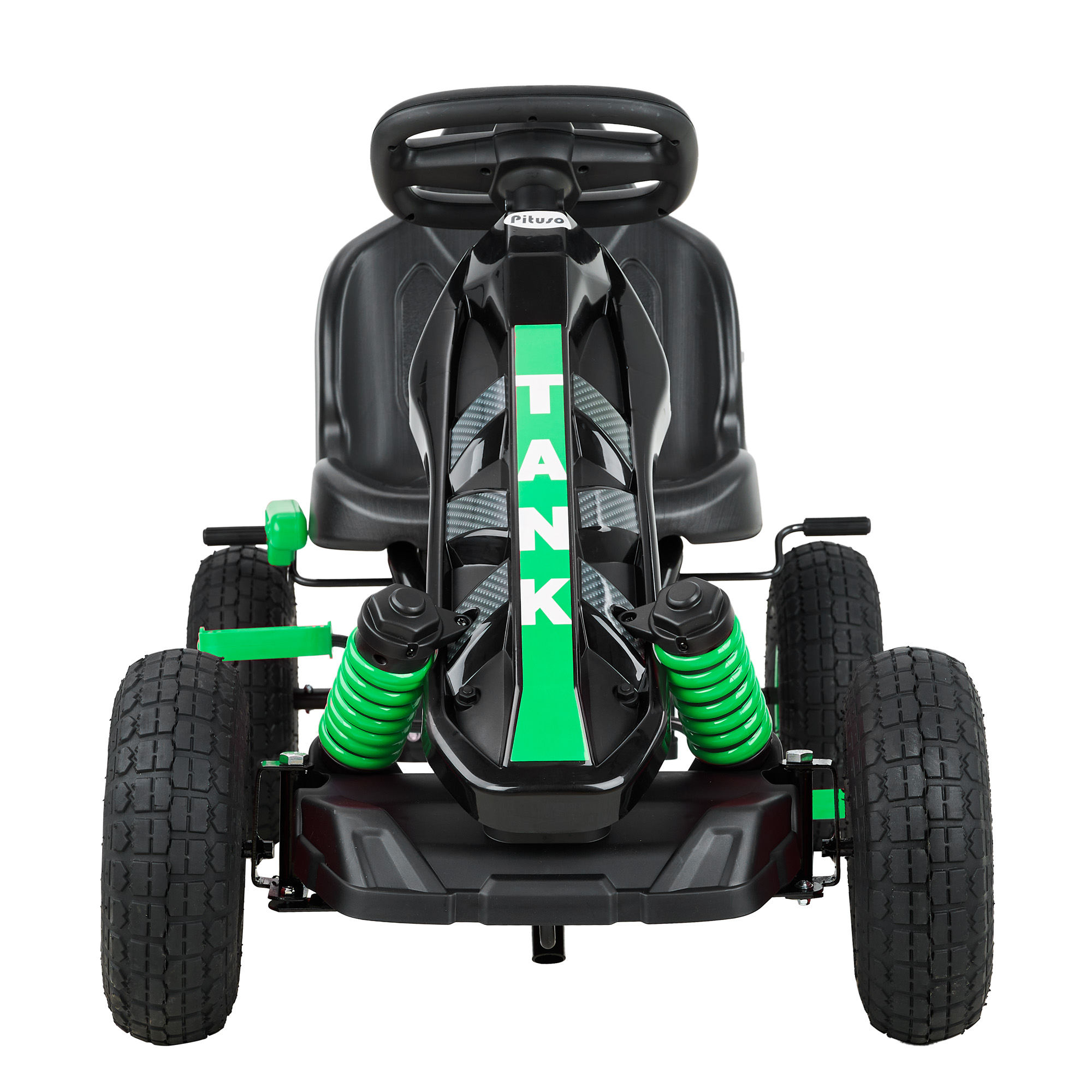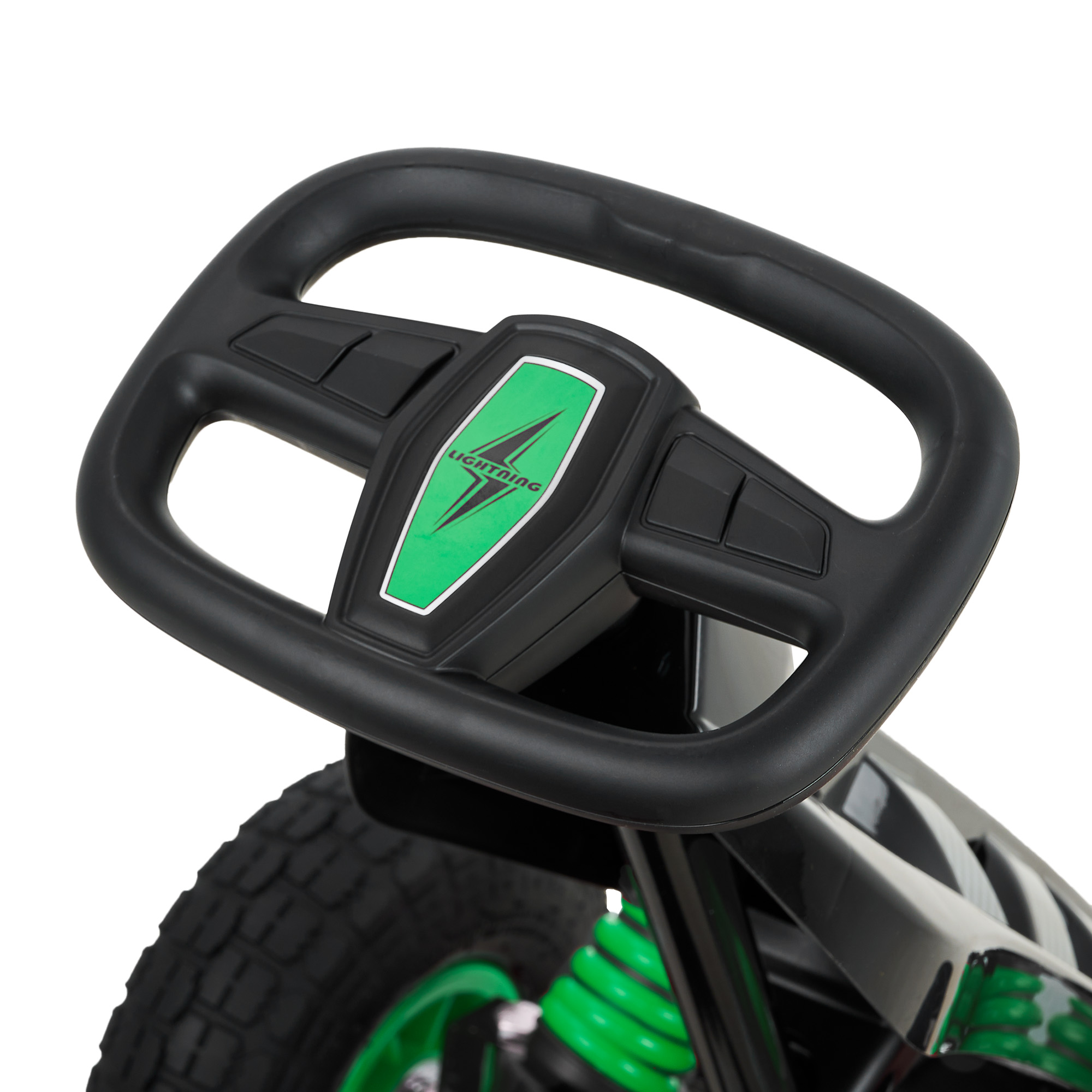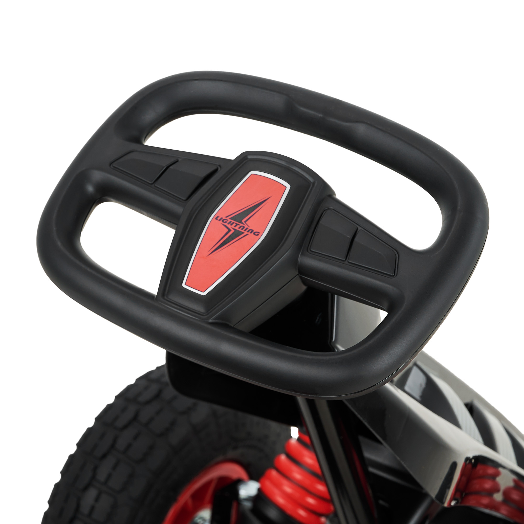 Пневматические надувные колёса диаметром примерно 22 см обеспечивают более мягкий ход и лучшее сцепление с поверхностью по сравнению с пластиковыми колесами. Металлические рулевая и колесные оси повышают надежность и устойчивость конструкции при поворотах и маневрах. Такой педальный картинг подойдет для катания по асфальту, тротуарной плитке и ровным парковым дорожкам.