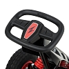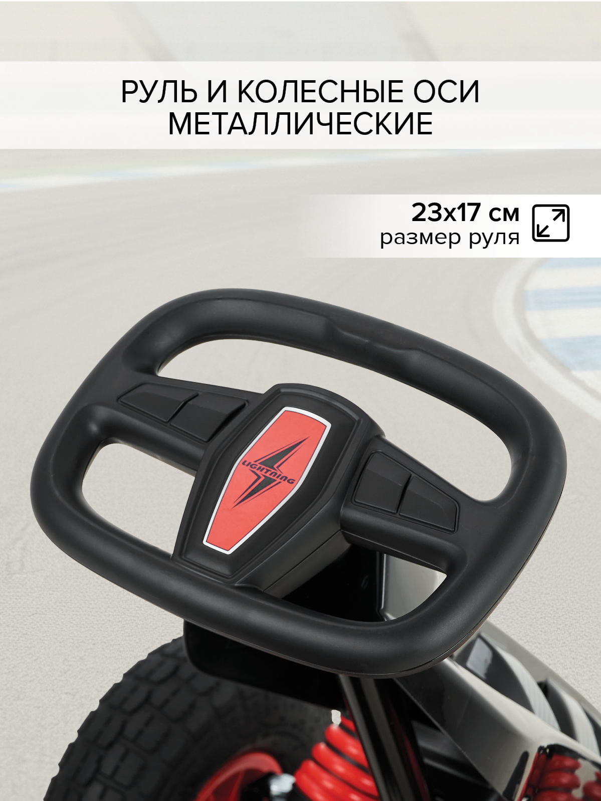 Модель построена на железной раме, что повышает общую прочность и долговечность при регулярном использовании. Педальный привод с цепной передачей обеспечивает плавное движение и помогает ребенку лучше контролировать скорость. Рулевое колесо размером около 23×17 см удобно ложится в руки, а ручной тормоз позволяет вовремя замедлиться и остановиться при необходимости.