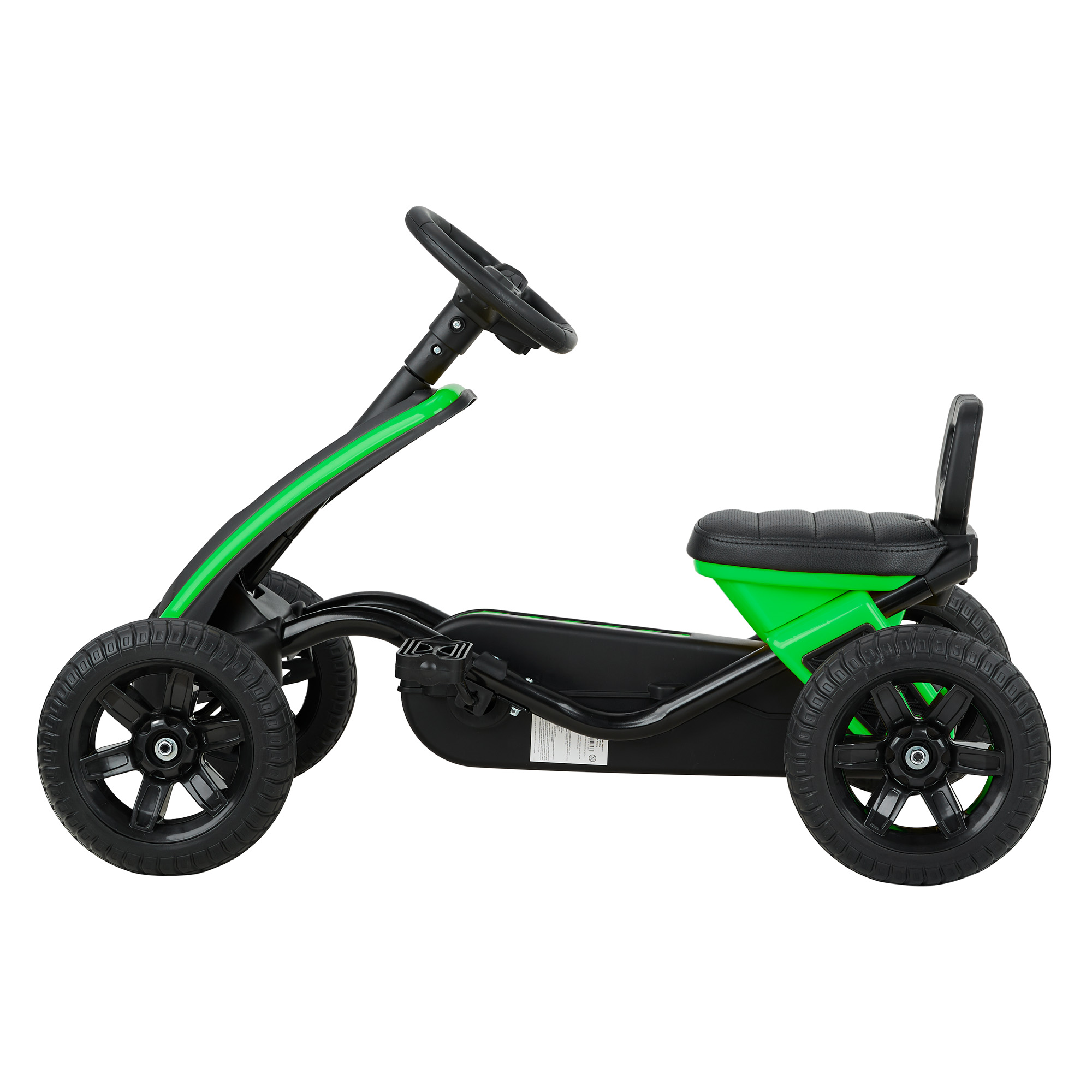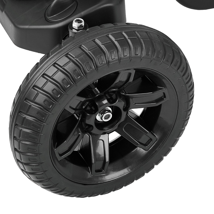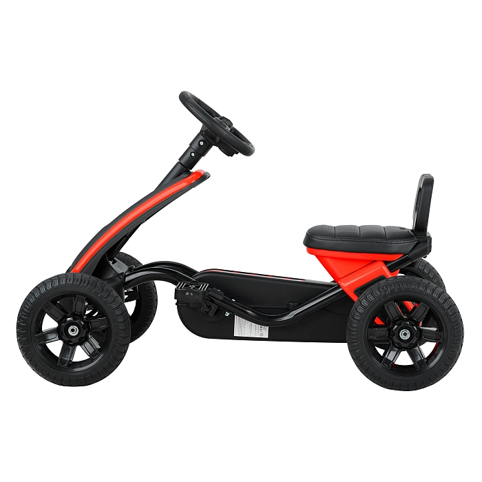 ЭВА колёса диаметром примерно 22 см обеспечивают мягкий и тихий ход по ровным поверхностям. Такой материал легче классических резиновых шин и при этом лучше глушит мелкие неровности, чем жесткий пластик. Картинг комфортно чувствует себя на асфальте, тротуарной плитке и ровных дорожках на детских площадках.