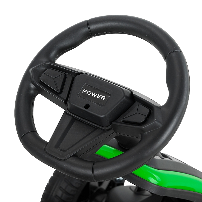 Модель построена на железной раме, что повышает прочность и ресурс при регулярном использовании. Педальный привод с цепной передачей обеспечивает плавное движение и помогает ребенку контролировать скорость своими усилиями. Рулевое колесо диаметром около 20 см удобно ложится в руки, а металлические рулевая и колесные оси добавляют надежности всей конструкции.