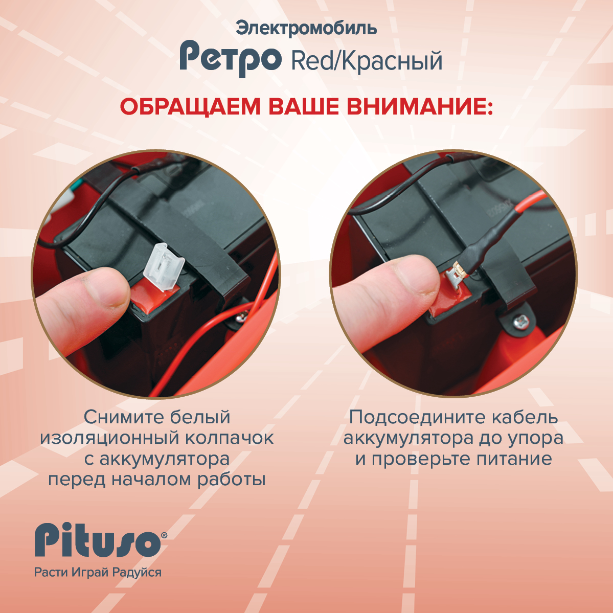 Перед началом эксплуатации нужно снять белый изоляционный колпачок с аккумулятора, подсоединить кабель до упора и только после этого проверять питание и запускать машинку.