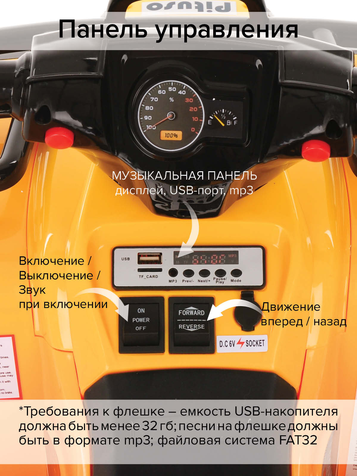 Гудок, дисплей, МР3 порт, USB,