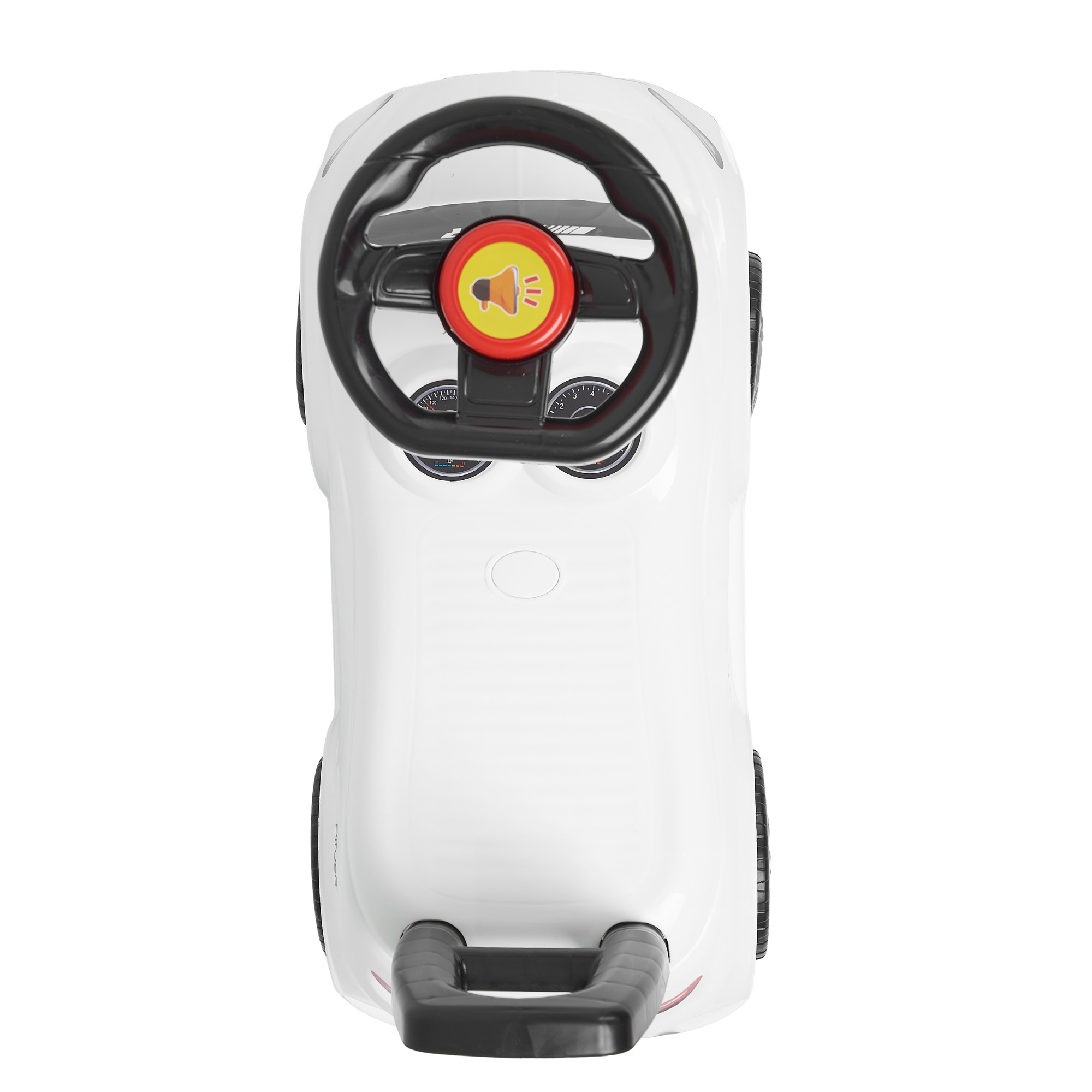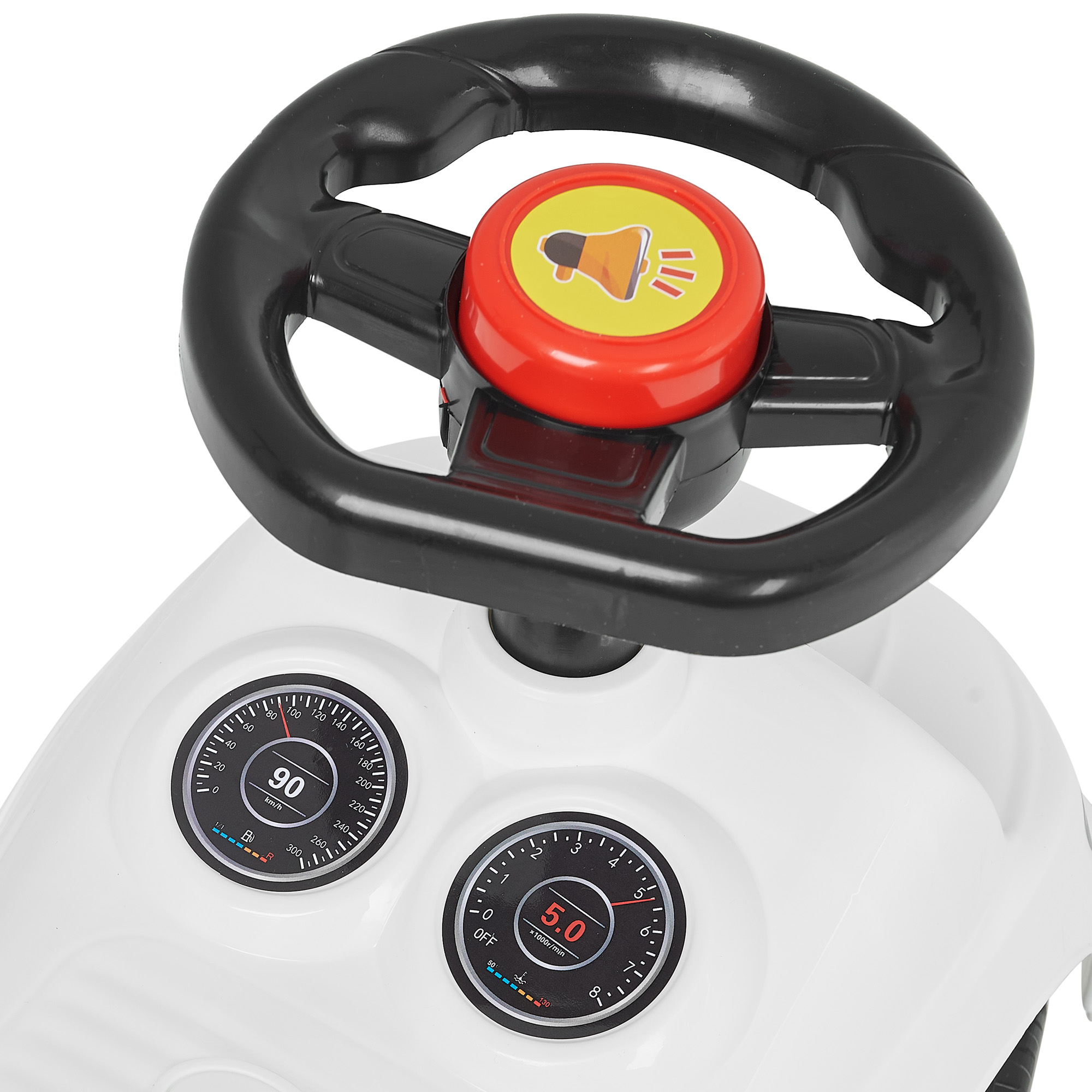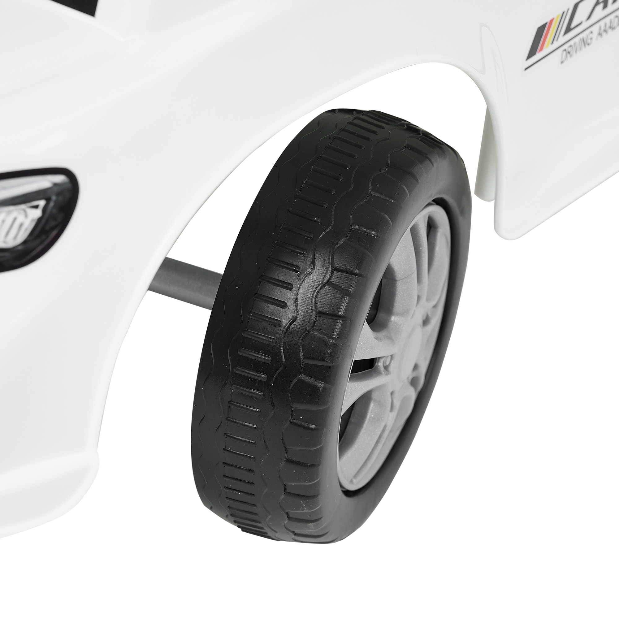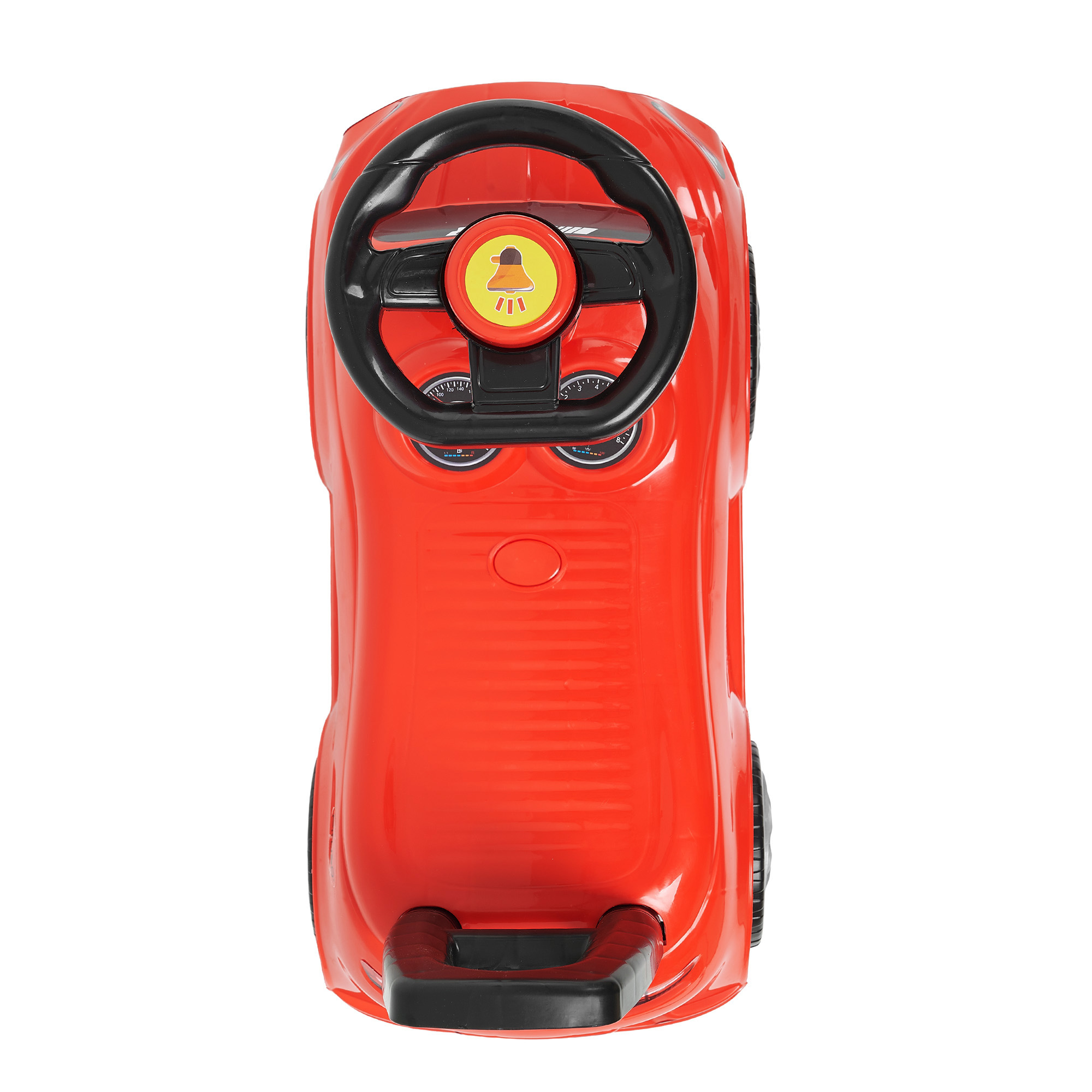 Размер сиденья около 15 × 19 см обеспечивает комфортную посадку для ребёнка раннего возраста, а высота спинки сиденья примерно 14 см поддерживает спину и помогает удерживать ровное положение тела. Невысокая посадка (около 19 см от пола до сиденья) позволяет ребёнку самостоятельно садиться и слезать с машинки под присмотром взрослых. Диаметр руля около 16 см удобен для маленьких рук, ребёнок уверенно держится и управляет направлением движения.