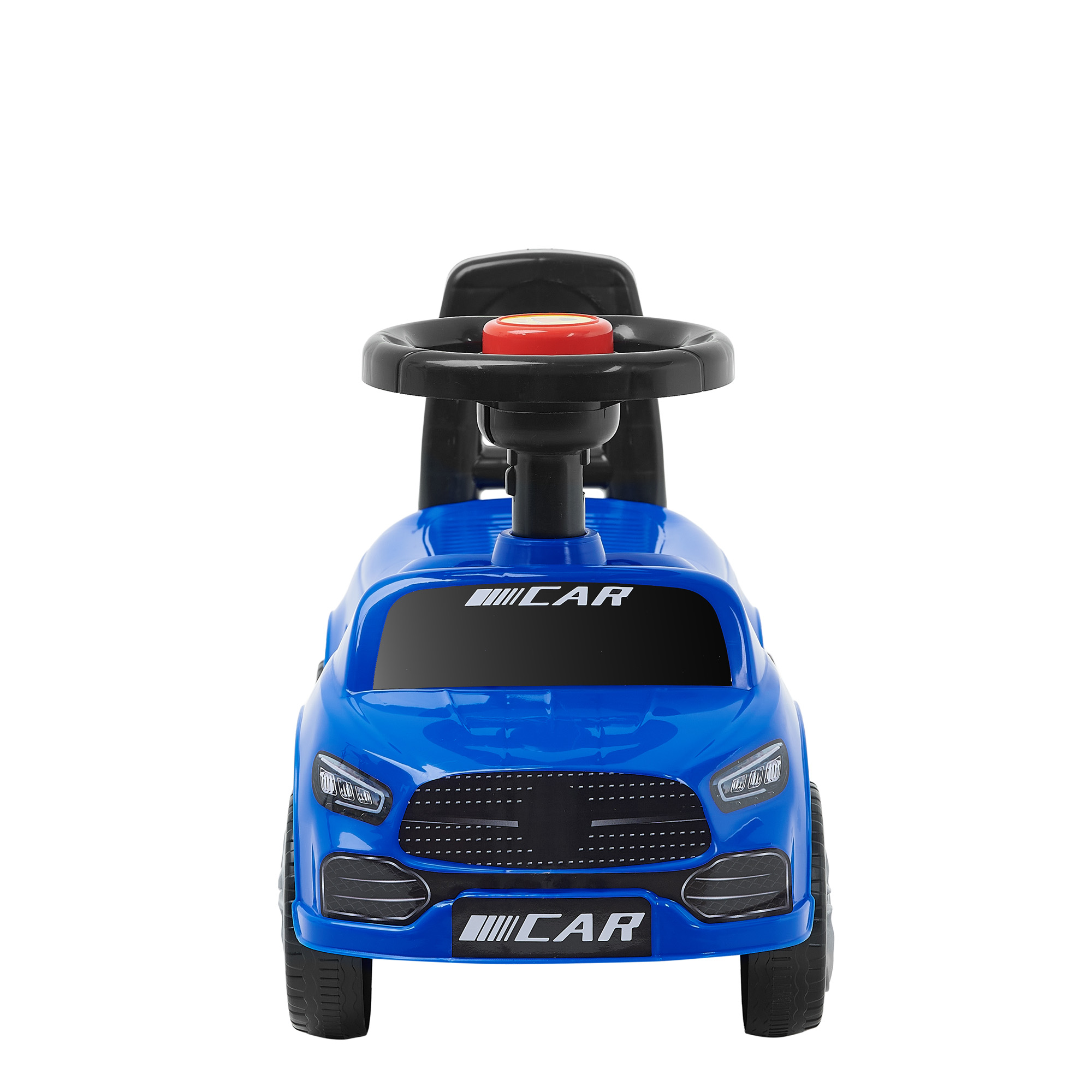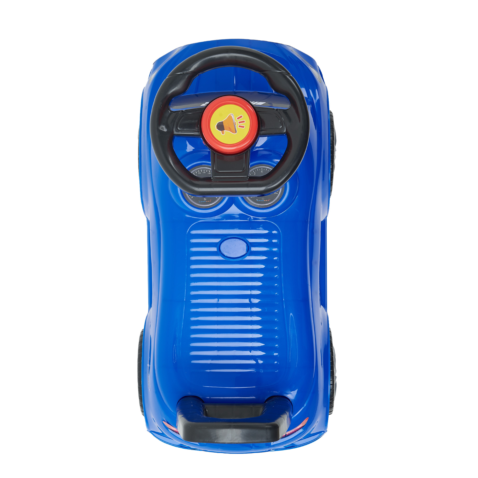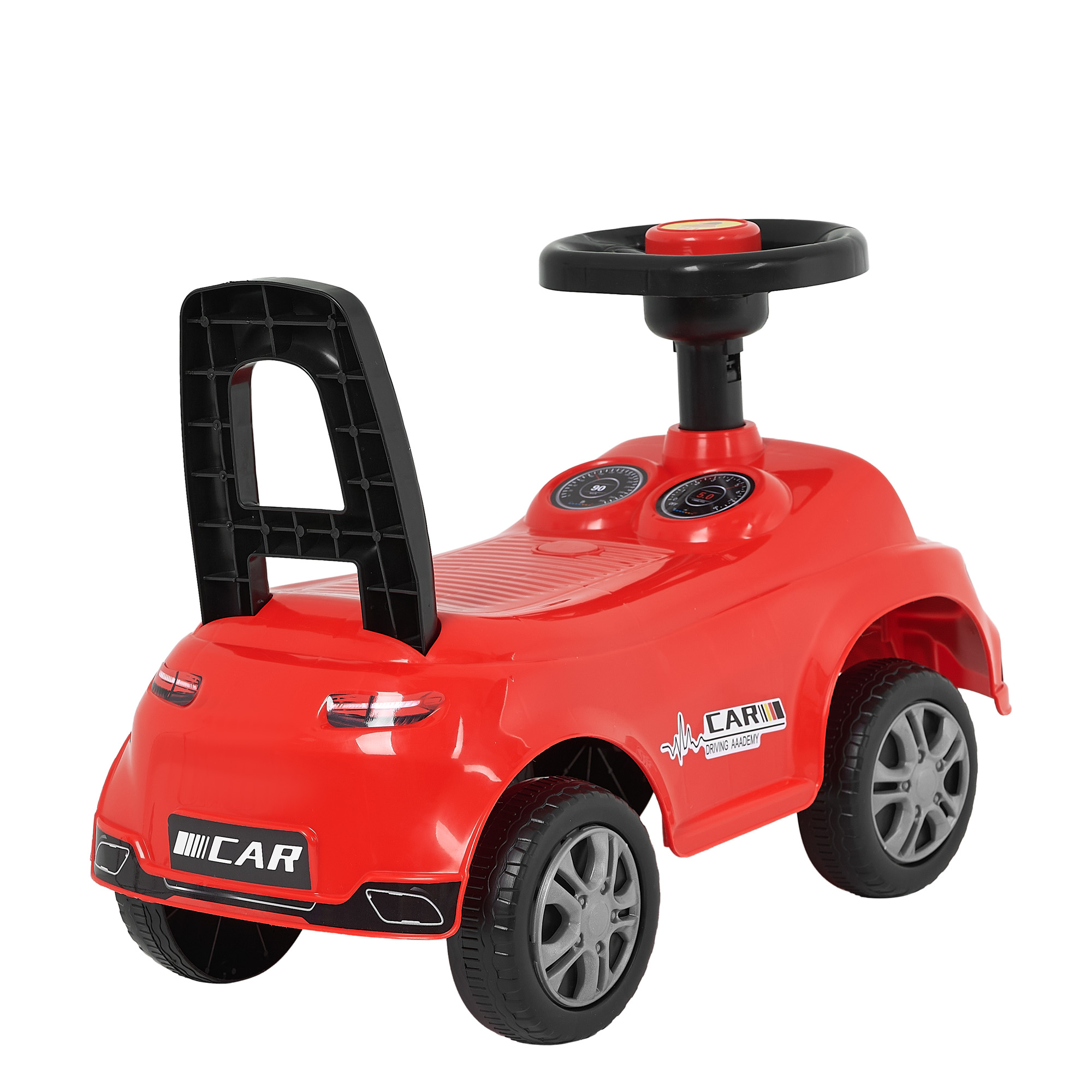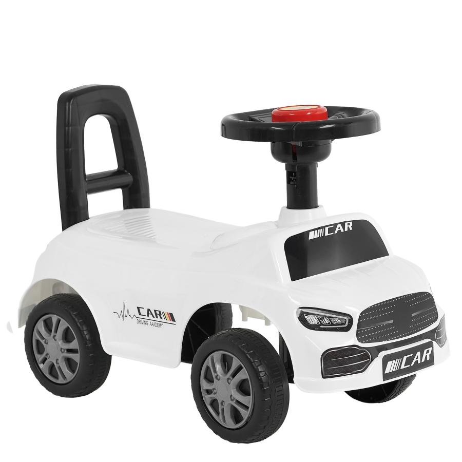Размер сиденья около 15 × 19 см обеспечивает комфортную посадку для ребёнка раннего возраста, а высота спинки сиденья примерно 14 см поддерживает спину и помогает удерживать ровное положение тела. Невысокая посадка (около 19 см от пола до сиденья) позволяет ребёнку самостоятельно садиться и слезать с машинки под присмотром взрослых. Диаметр руля около 16 см удобен для маленьких рук, ребёнок уверенно держится и управляет направлением движения.