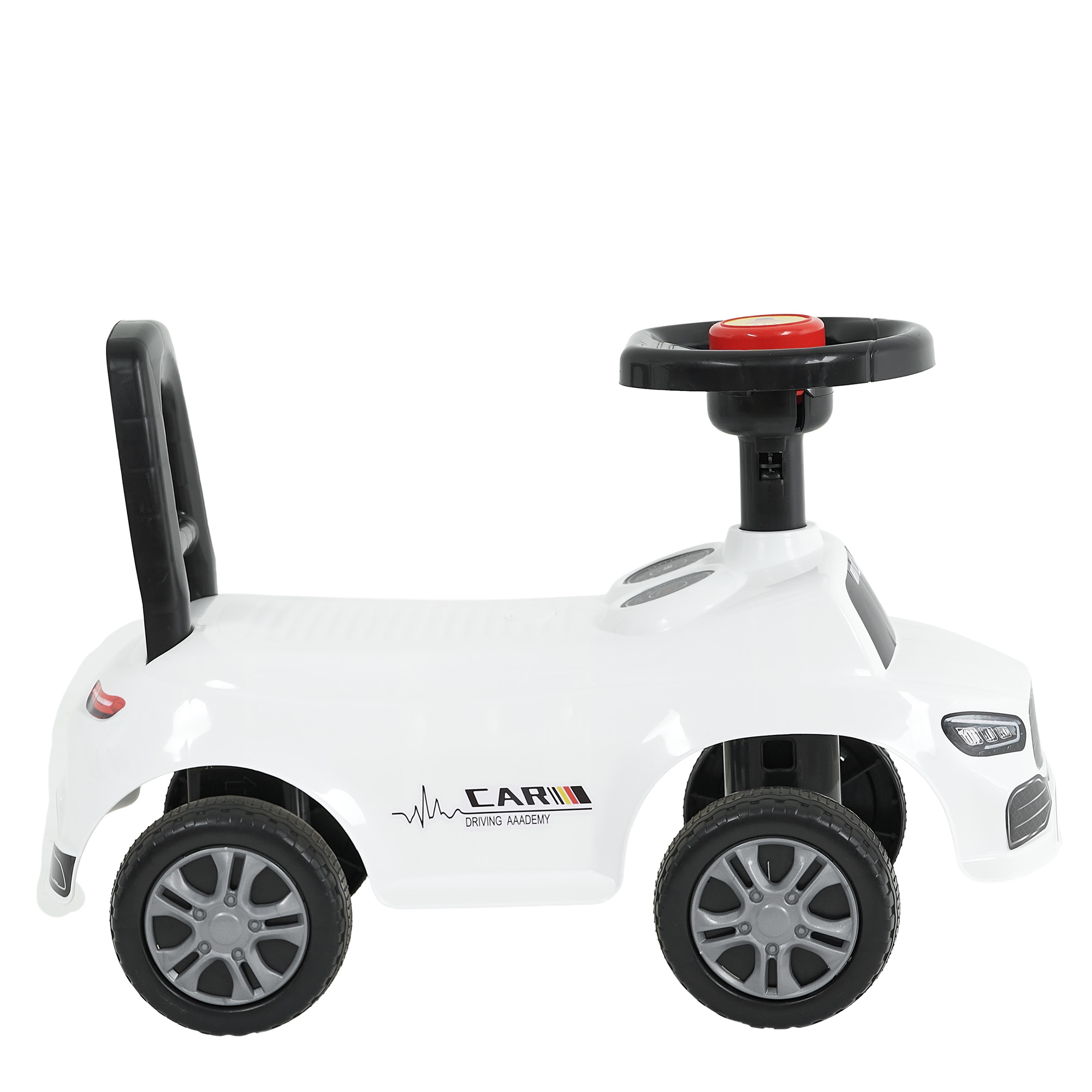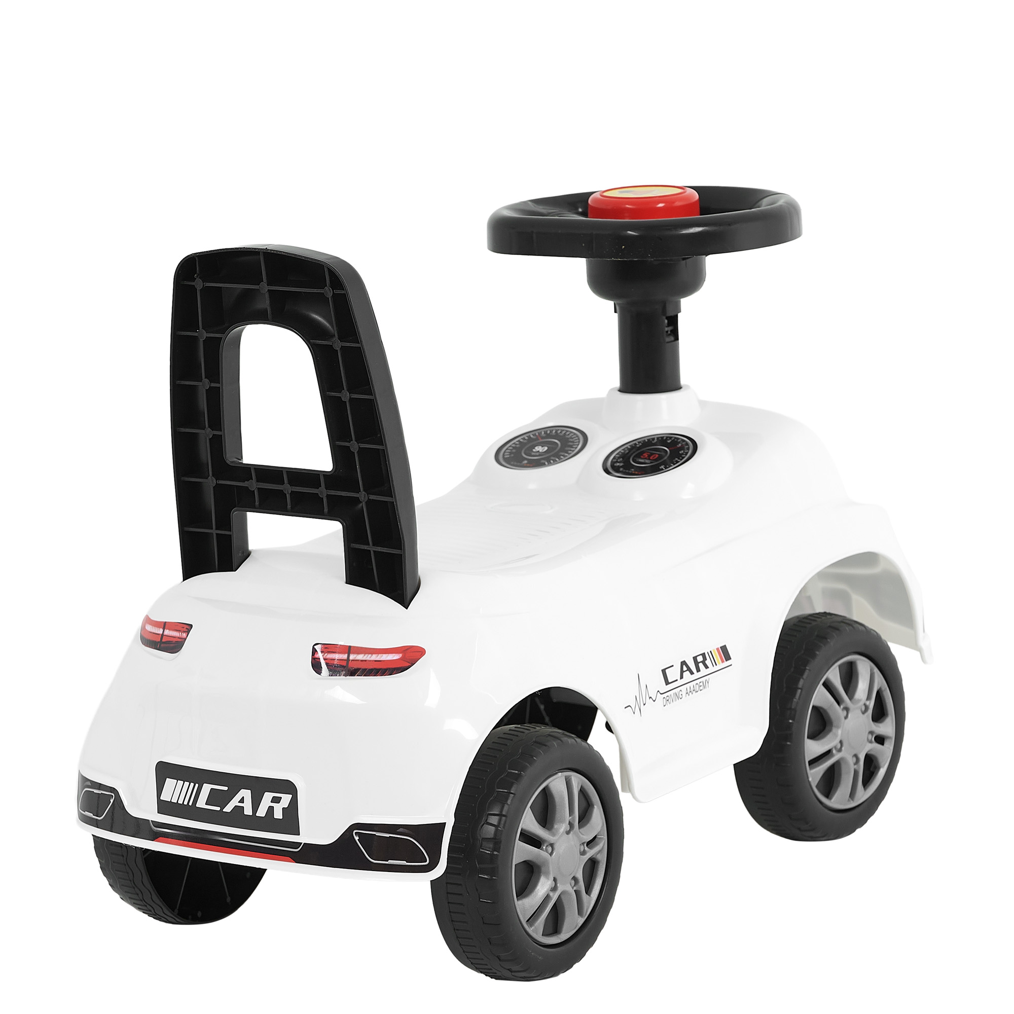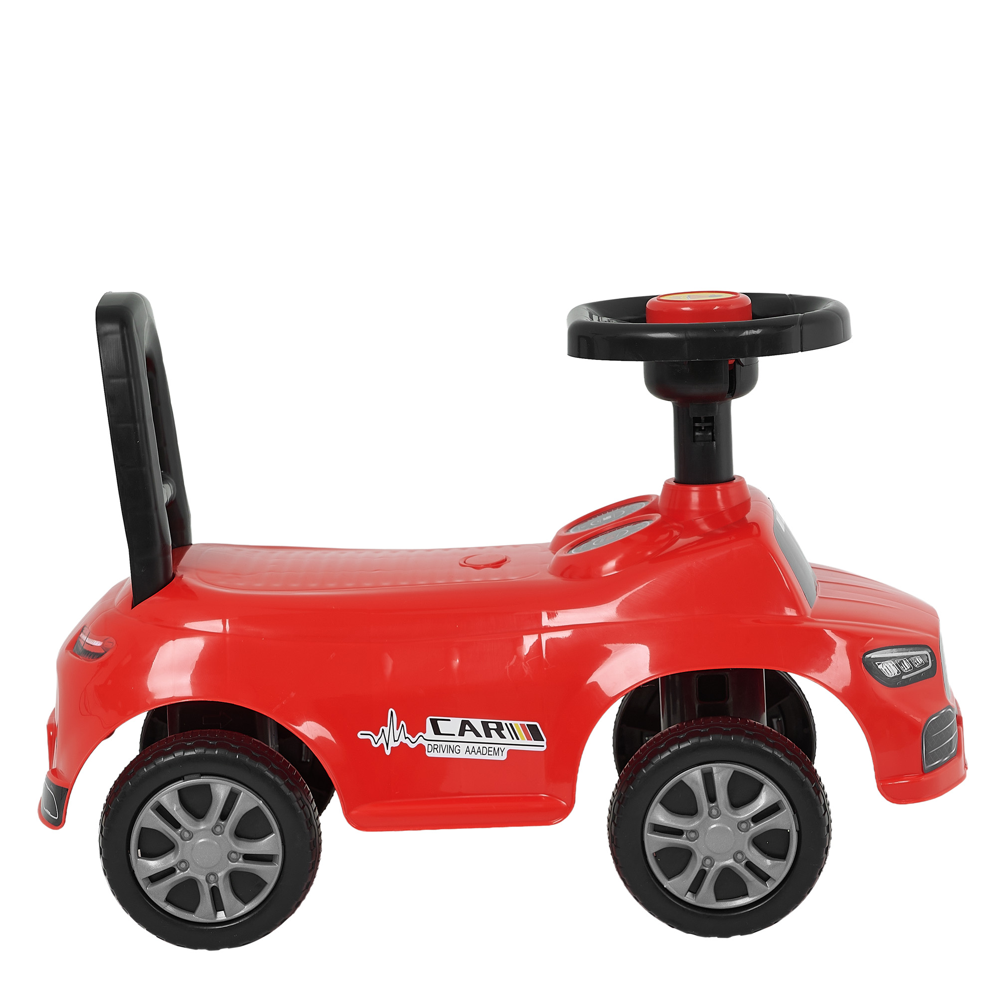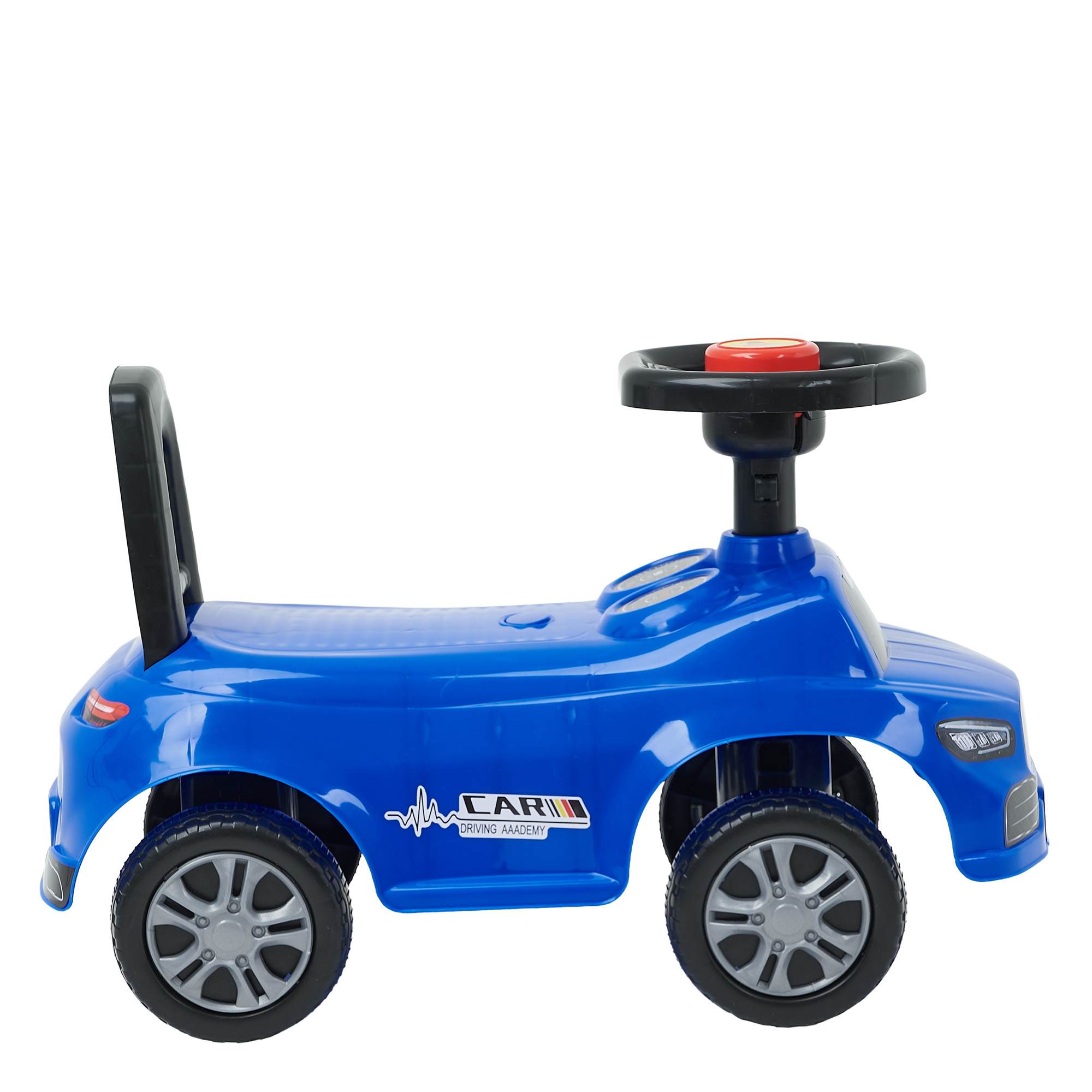 Размер сиденья около 15 × 19 см обеспечивает комфортную посадку для ребёнка раннего возраста, а высота спинки сиденья примерно 14 см поддерживает спину и помогает удерживать ровное положение тела. Невысокая посадка (около 19 см от пола до сиденья) позволяет ребёнку самостоятельно садиться и слезать с машинки под присмотром взрослых. Диаметр руля около 16 см удобен для маленьких рук, ребёнок уверенно держится и управляет направлением движения.