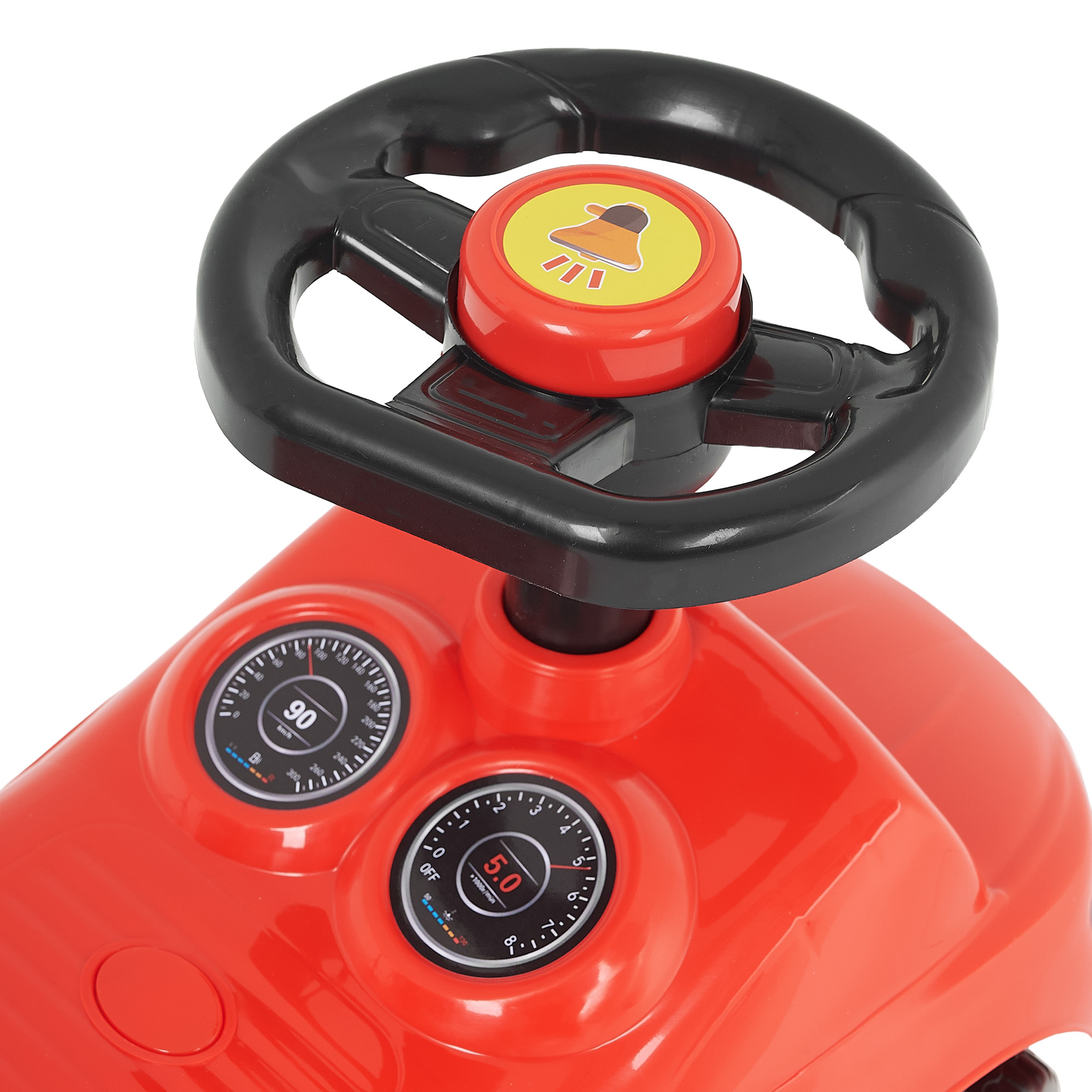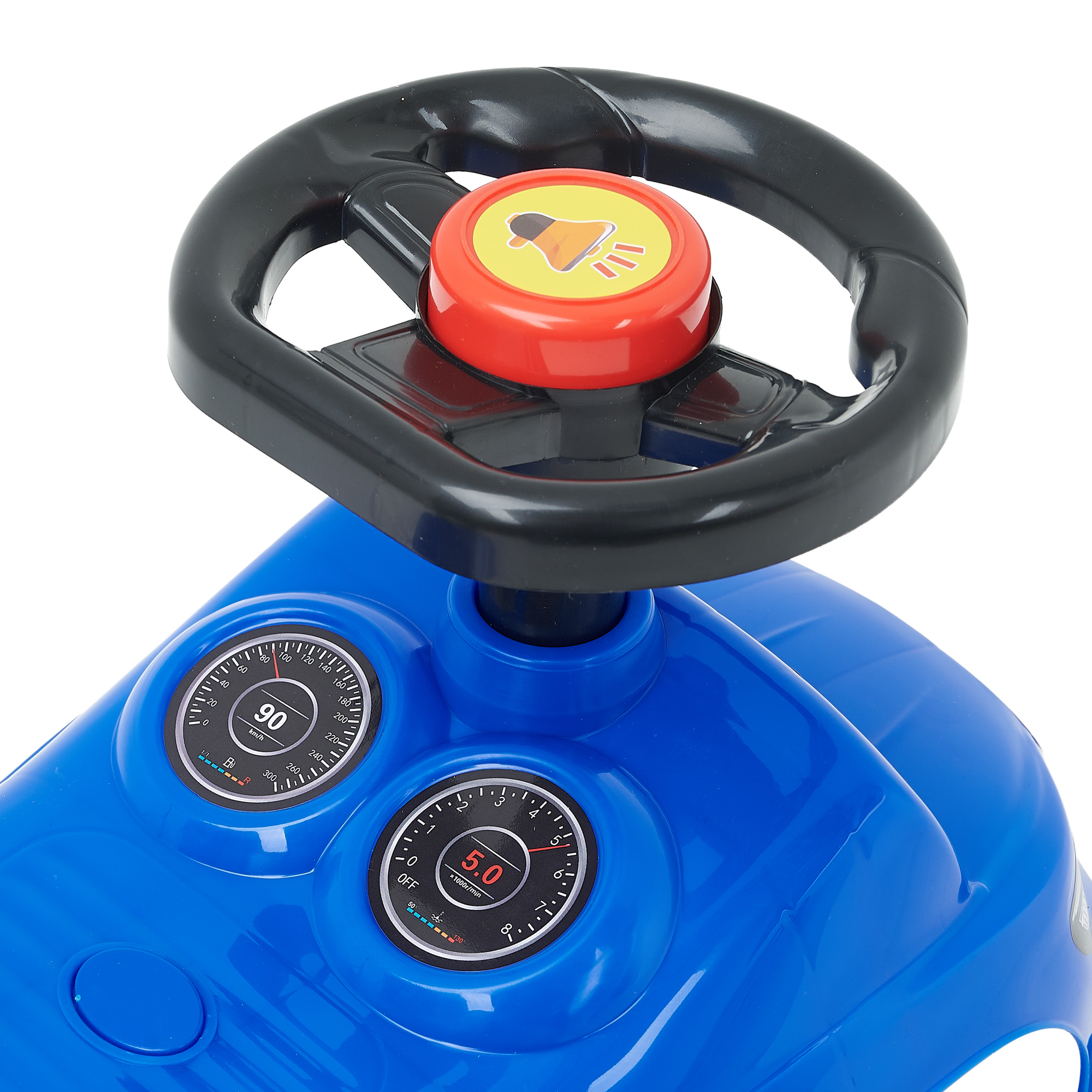 - Управление: ребёнок отталкивается ногами и поворачивает руль, самостоятельно задавая направление движения;
