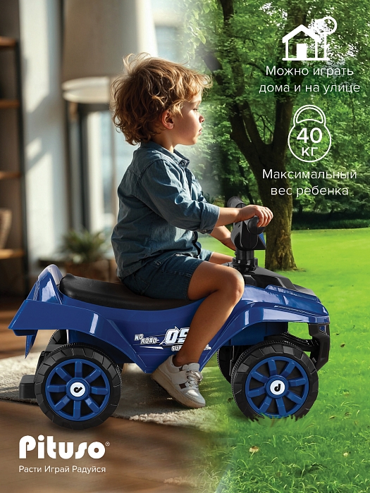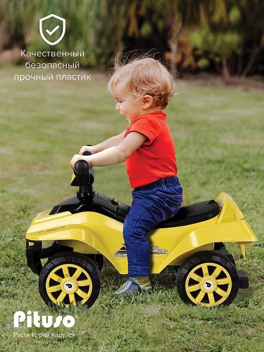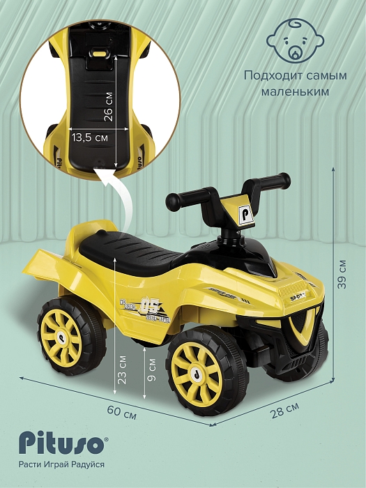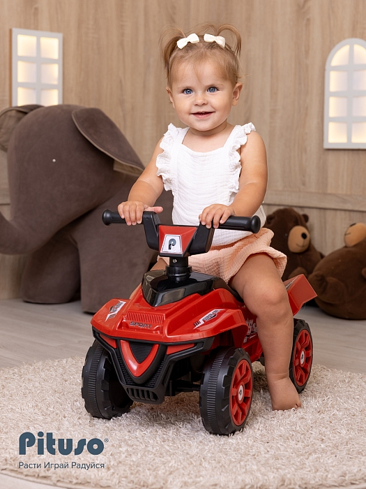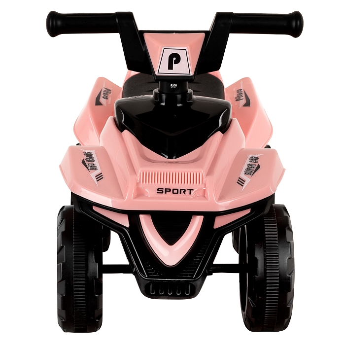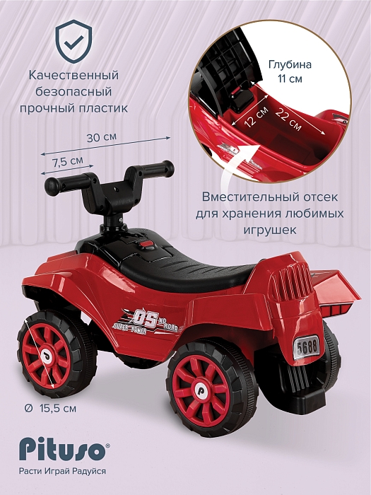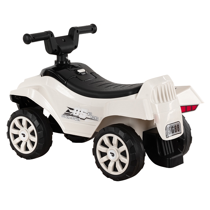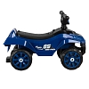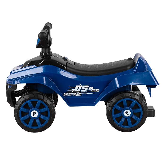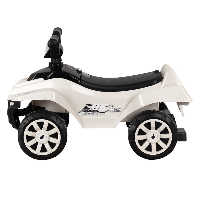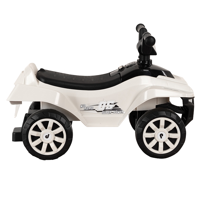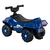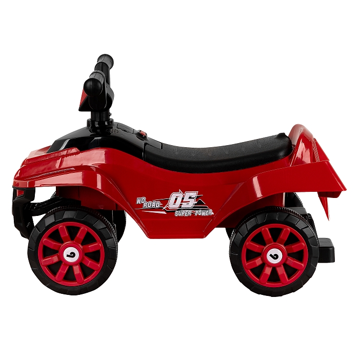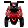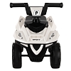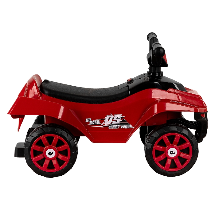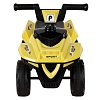 Модель выполнена в форме квадроцикла, имеет большие колеса с рисунком на шинах и просторное сиденье для комфортной посадки.