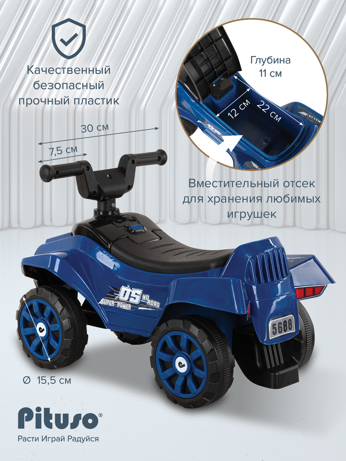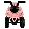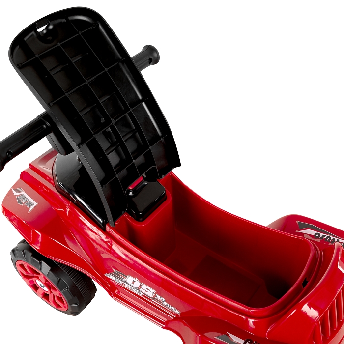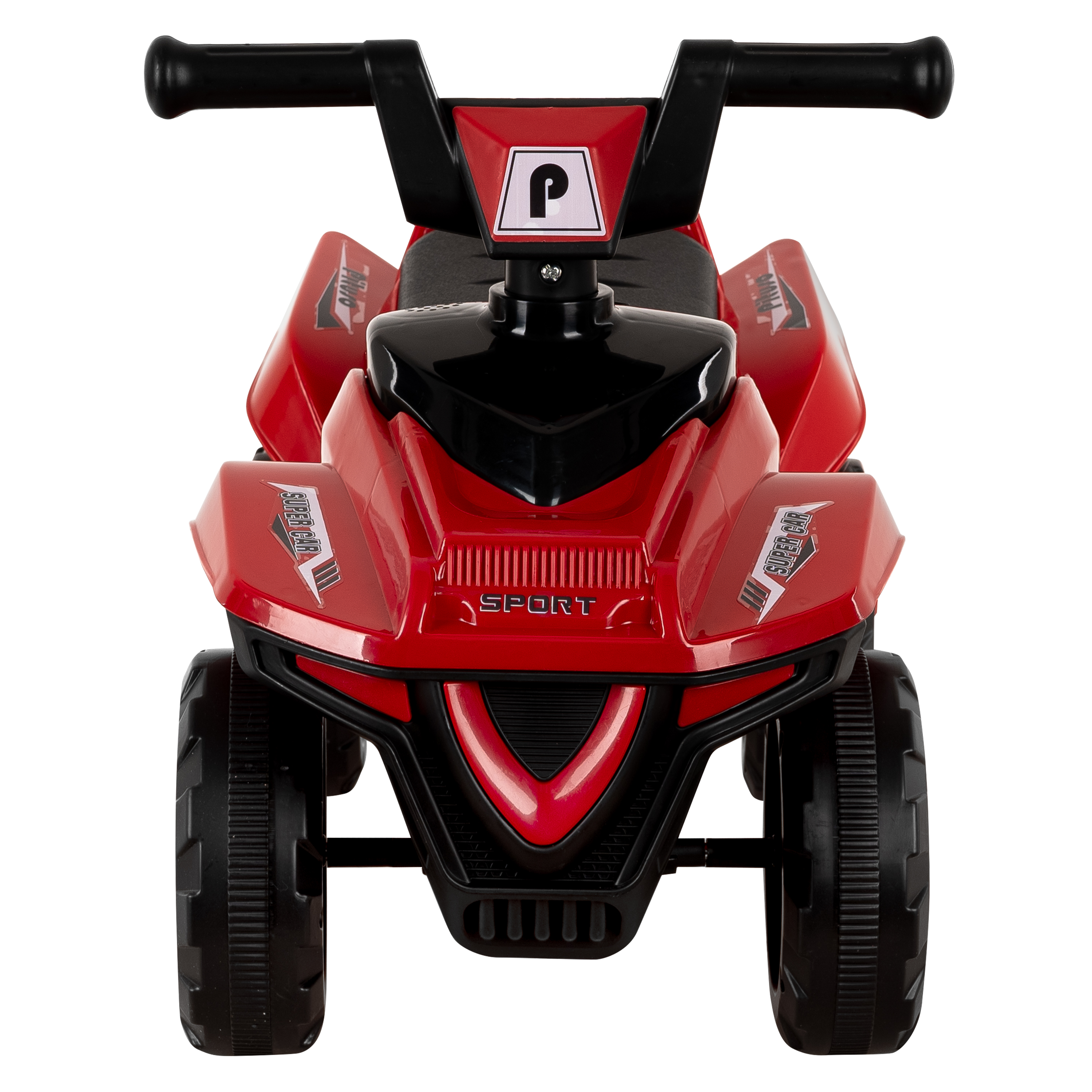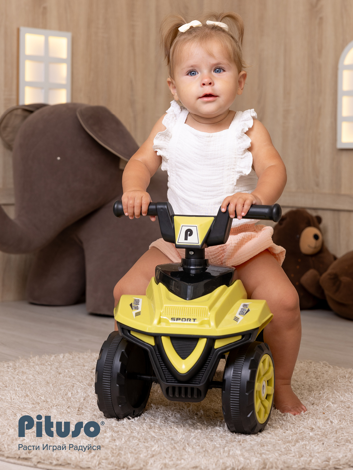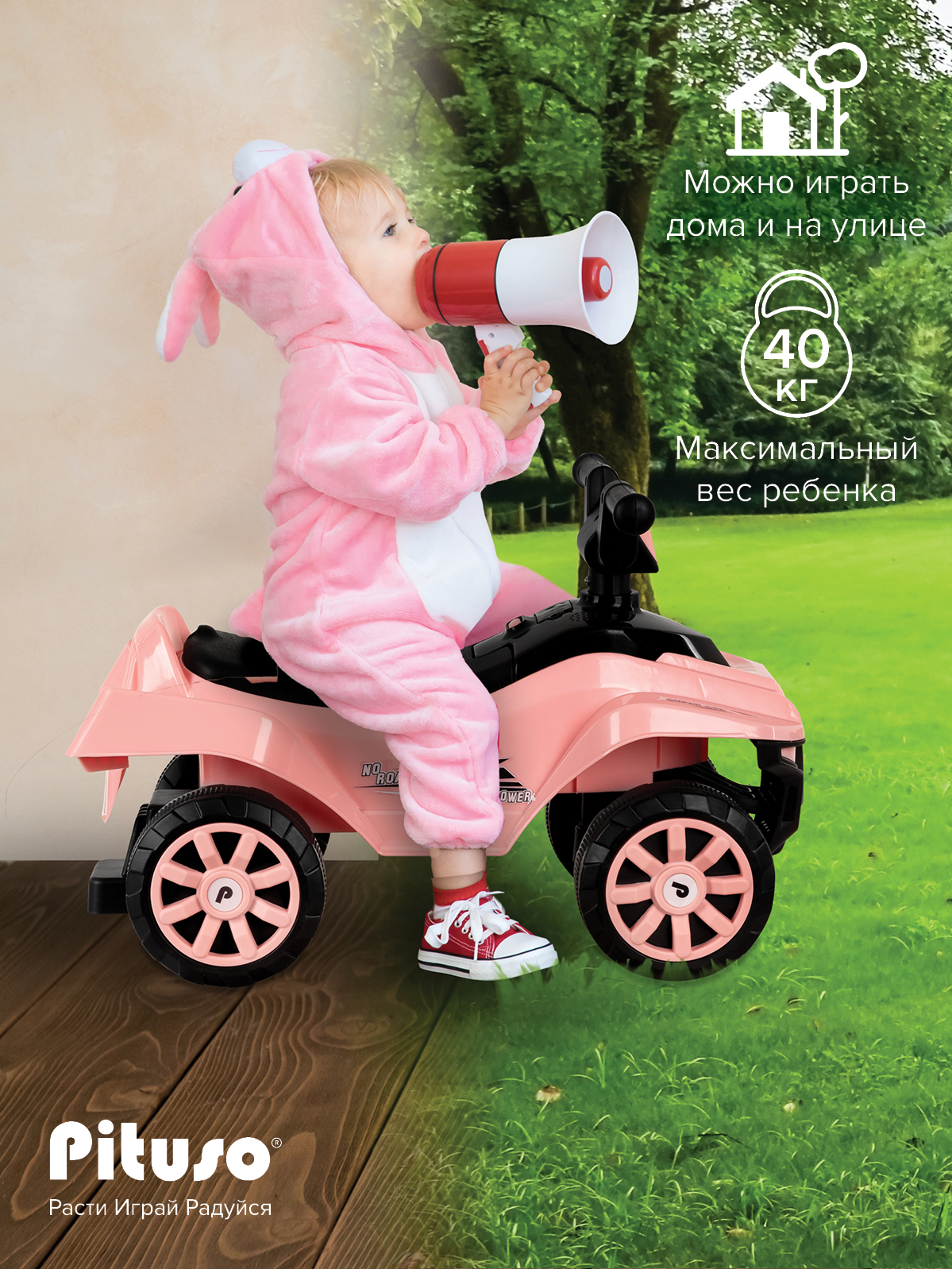 Модель выполнена в форме квадроцикла, имеет большие колеса с рисунком на шинах и просторное сиденье для комфортной посадки.