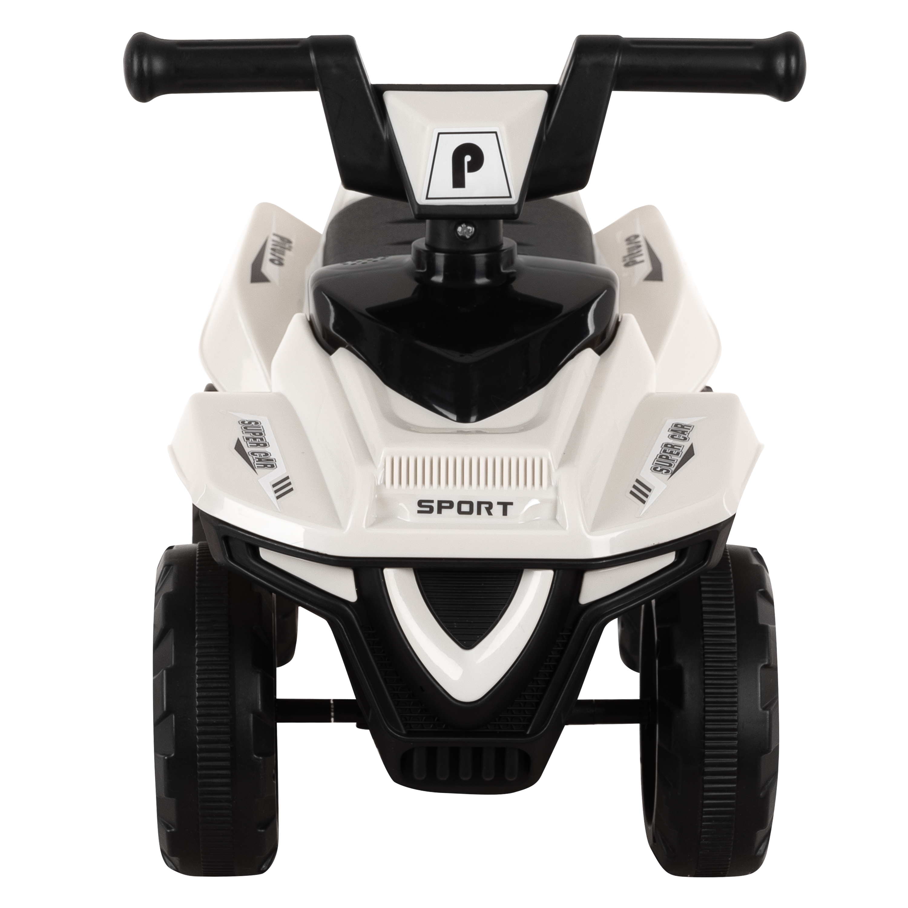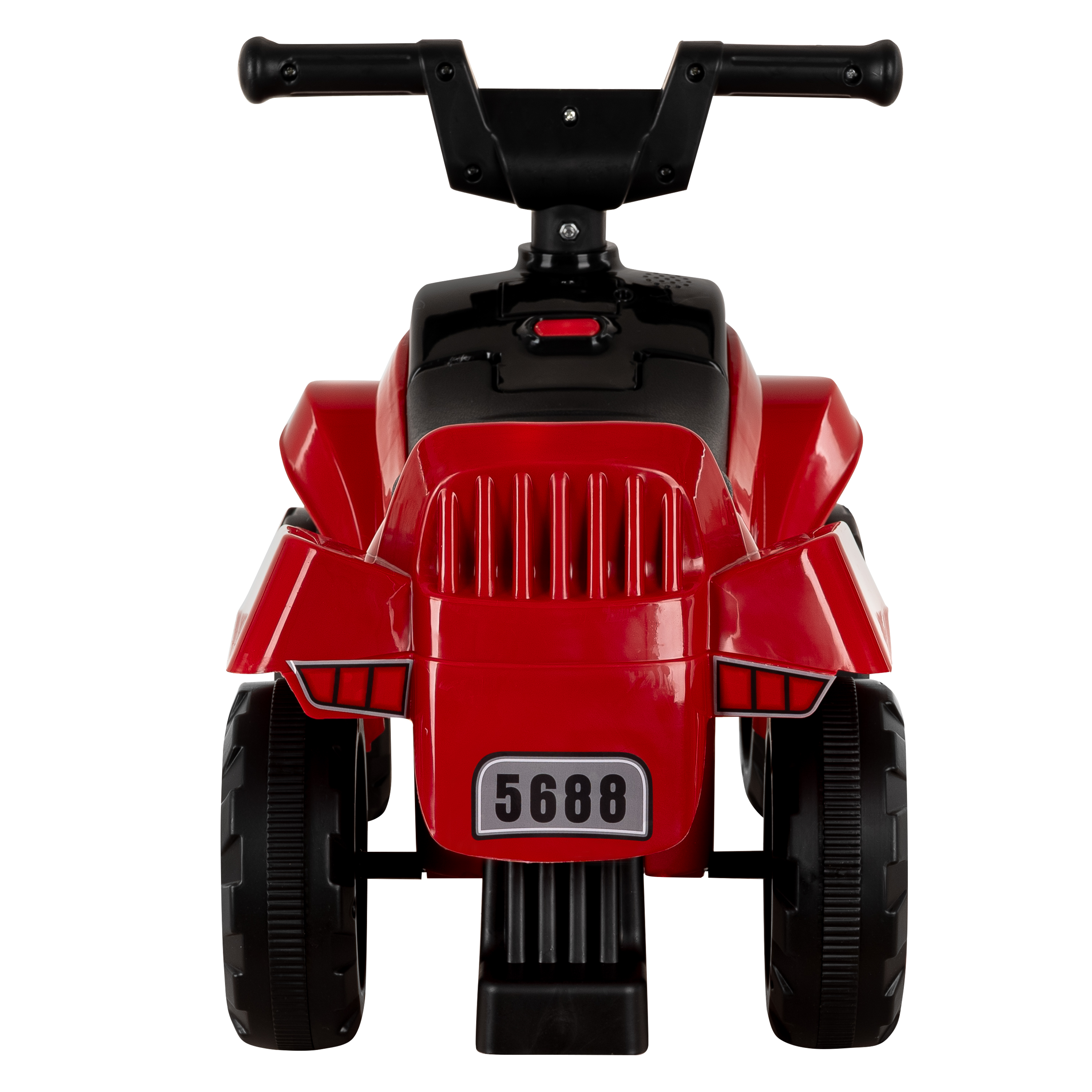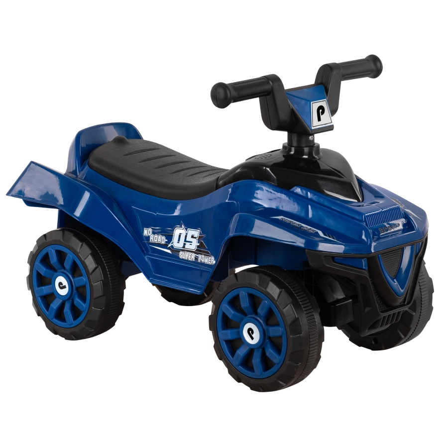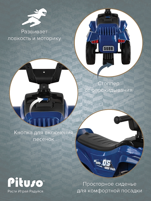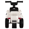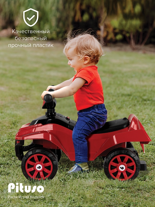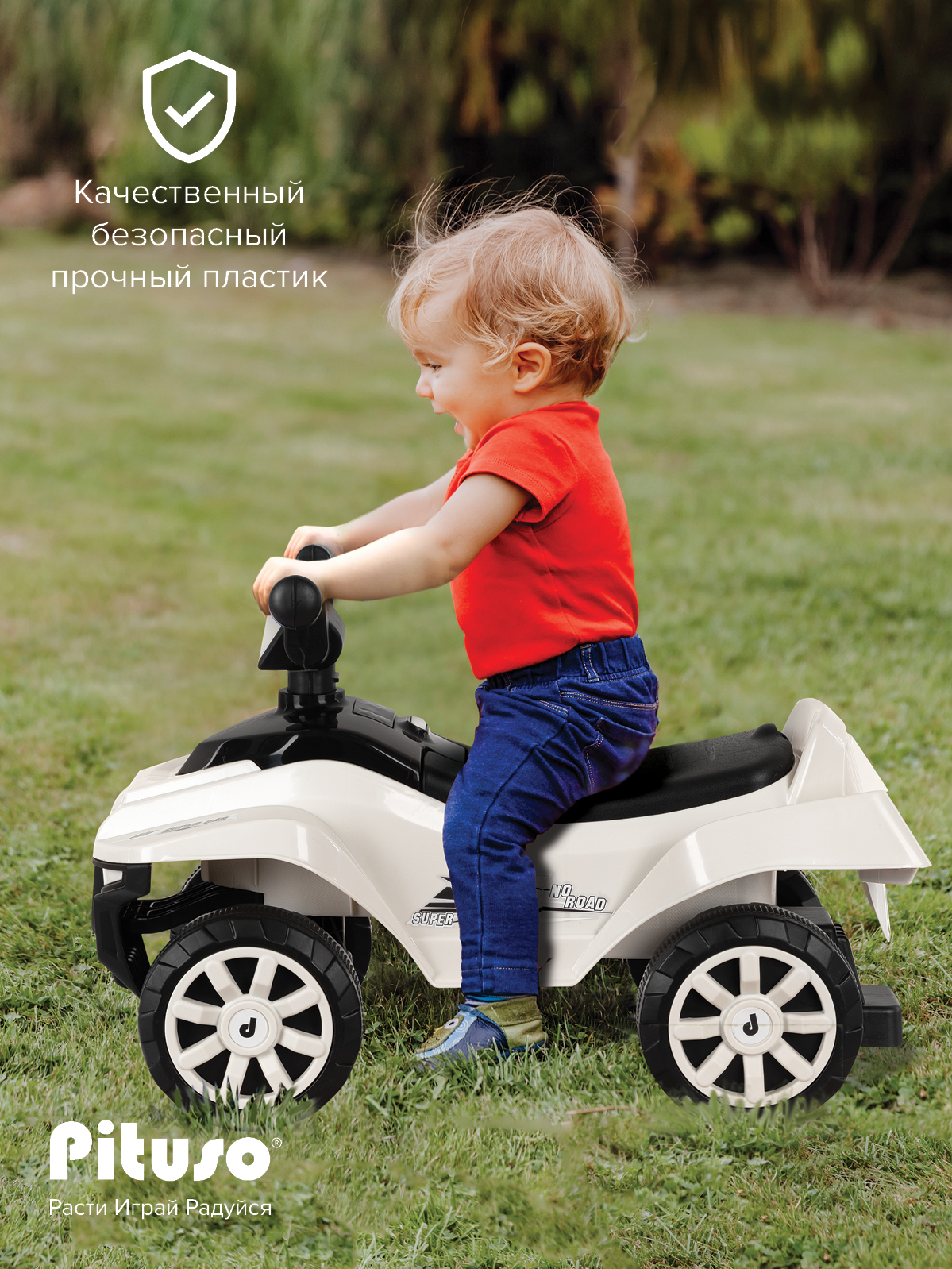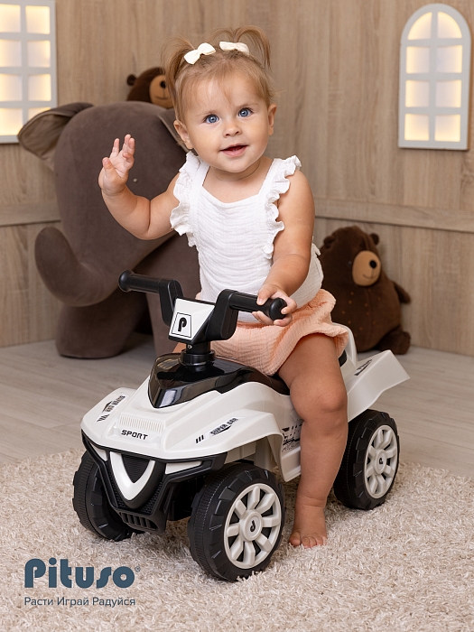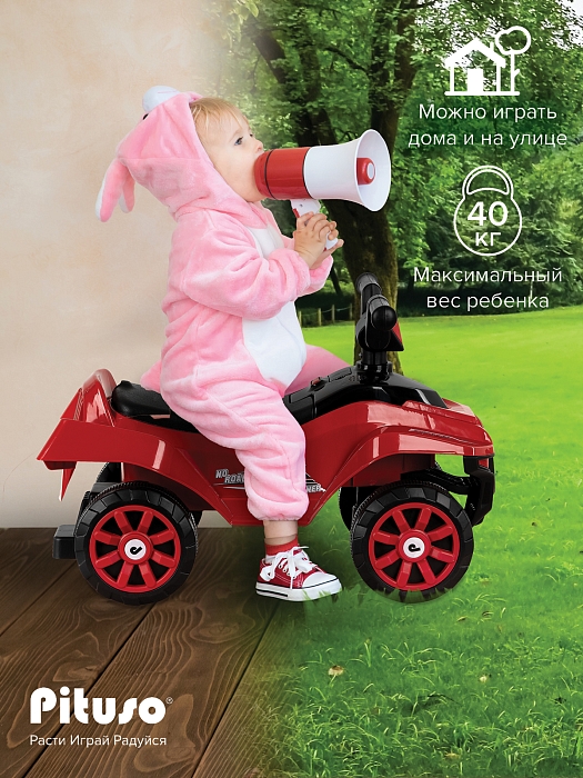 Модель выполнена в форме квадроцикла, имеет большие колеса с рисунком на шинах и просторное сиденье для комфортной посадки.