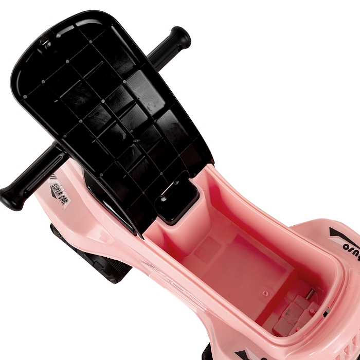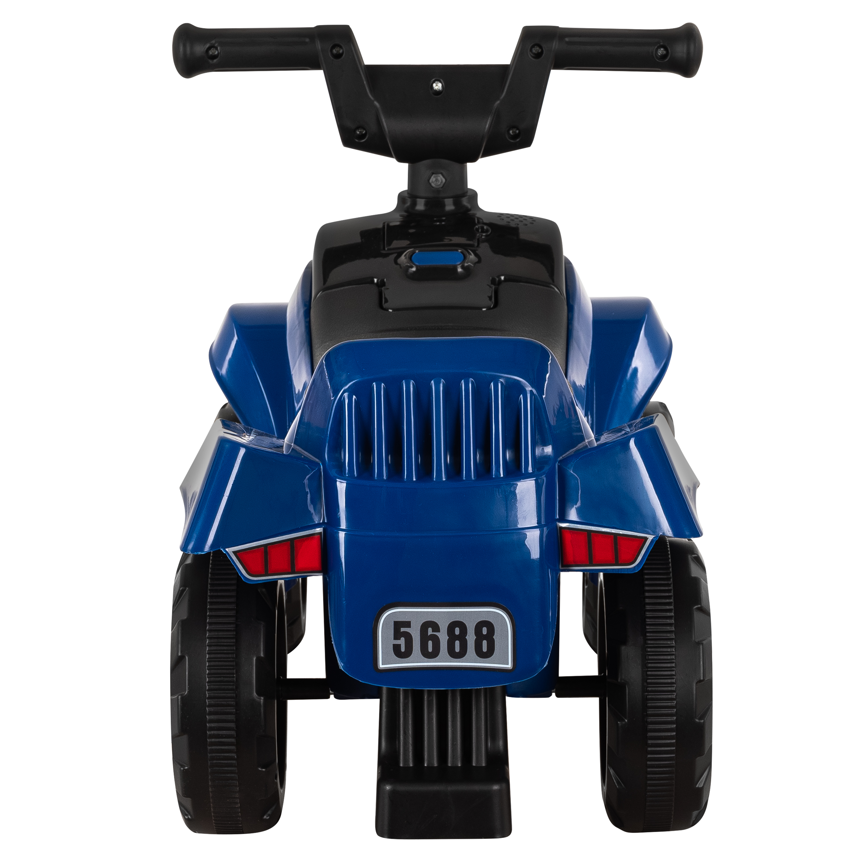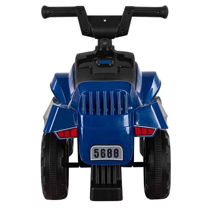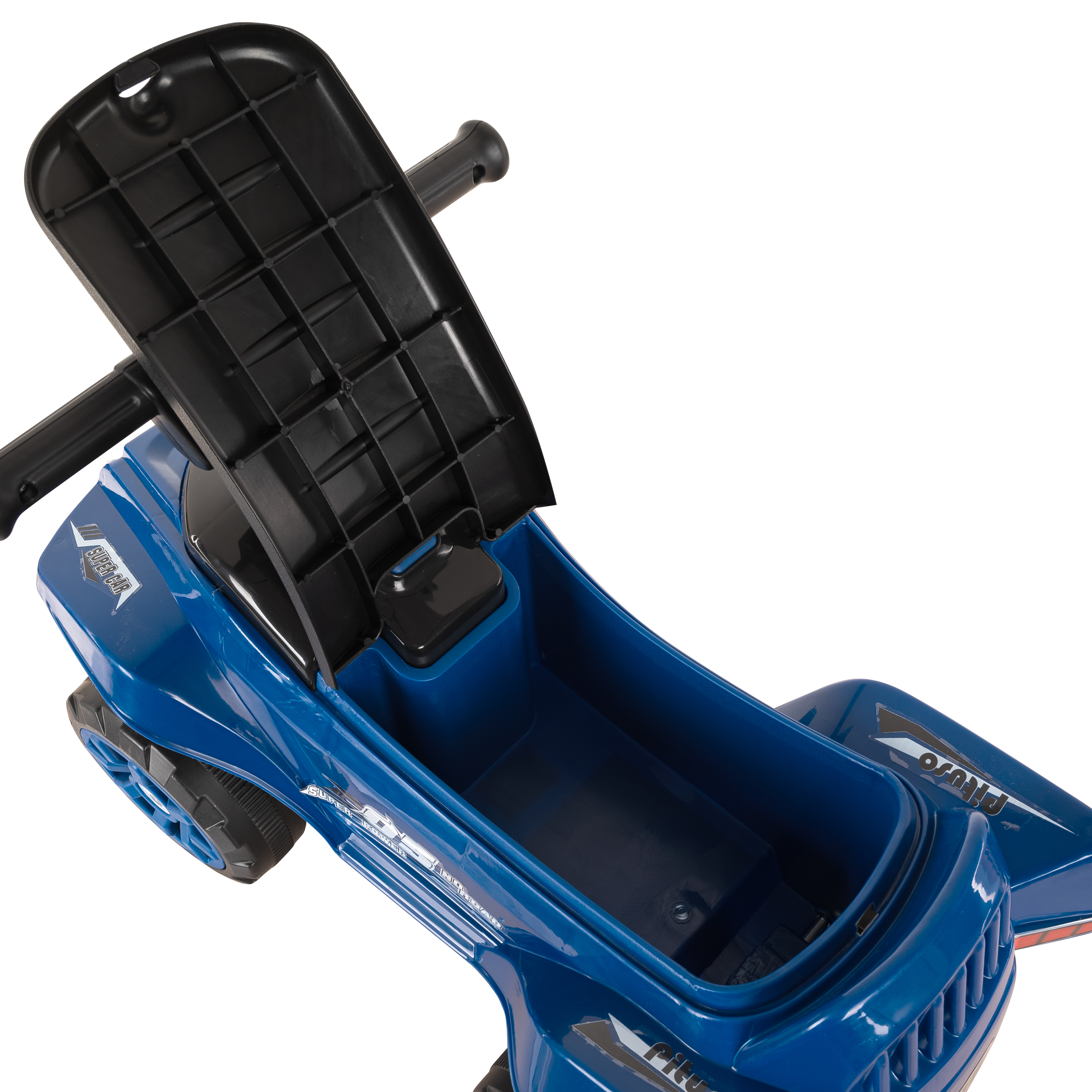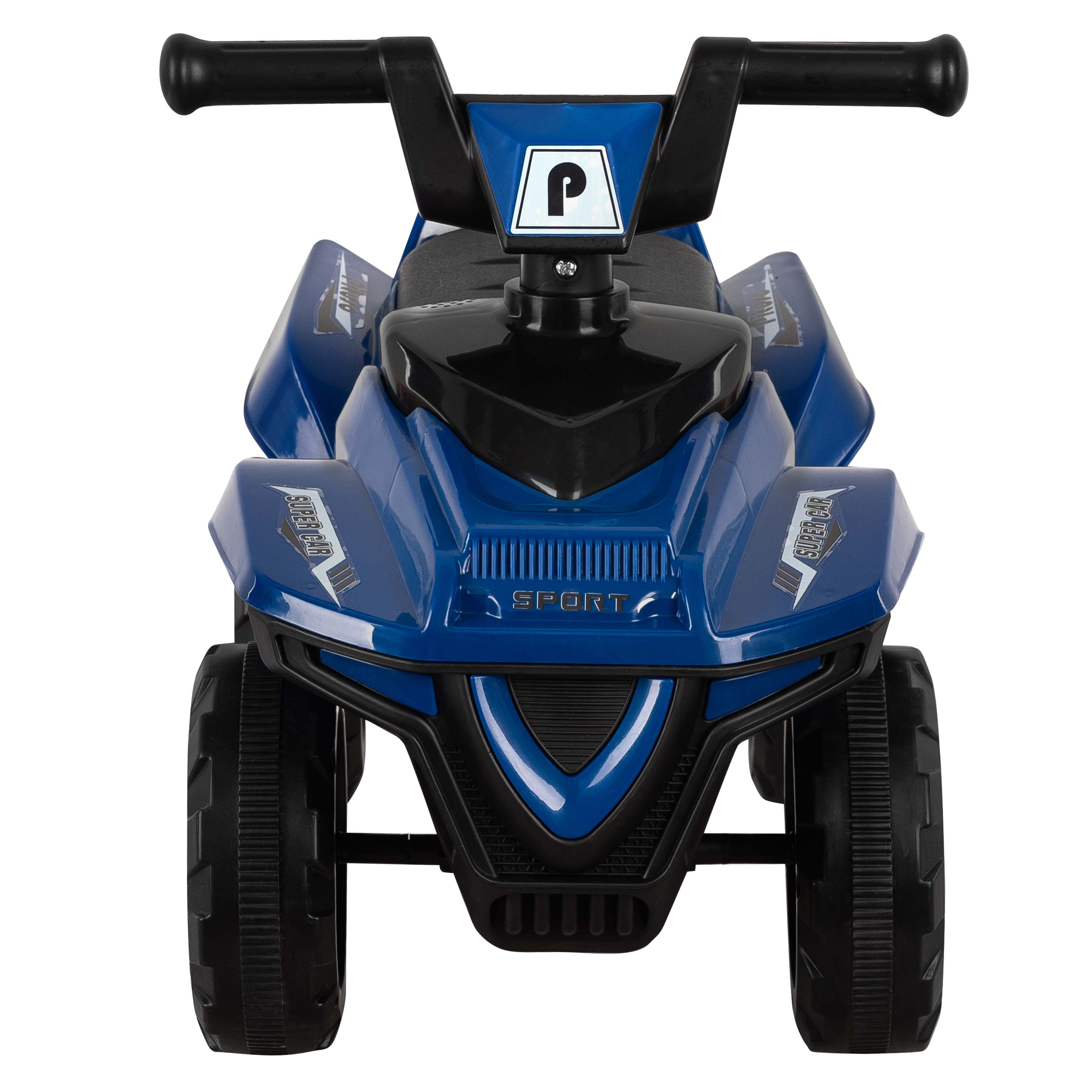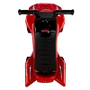 Модель выполнена в форме квадроцикла, имеет большие колеса с рисунком на шинах и просторное сиденье для комфортной посадки.