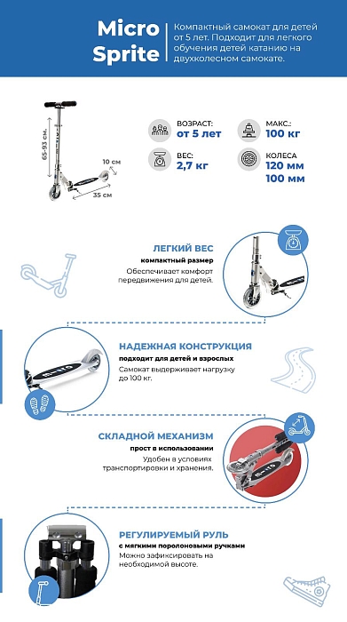 Самокат Micro Sprite подходит как взрослым, так и детям. Он может использоваться от 3 лет. Самокат позволит ребенку развивать ловкость и координацию движений. Яркие расцветки и стильный дизайн привлекут внимание как малышей, так и взрослых.