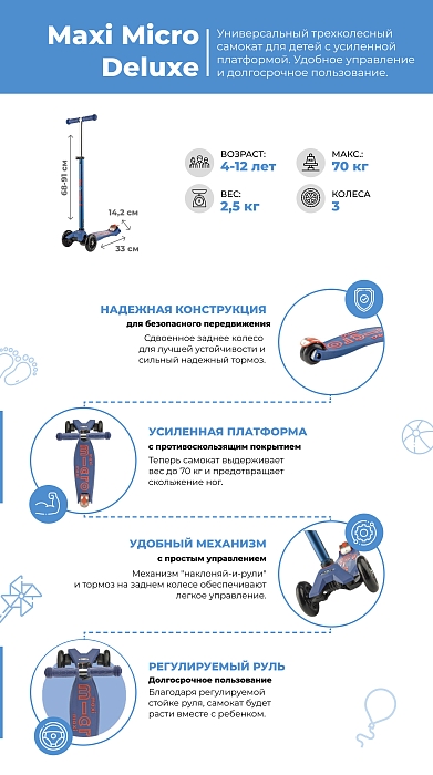Трехколесный самокат Micro Maxi Deluxe от швейцарского бренда Micro Mobility Systems станет бесценным подарком для вашего малыша. Самокат Maxi Deluxe — не только веселый, но и полезный способ провести время, ведь он укрепляет мышцы ног ребенка, а также развивает чувство равновесия и координацию движений.