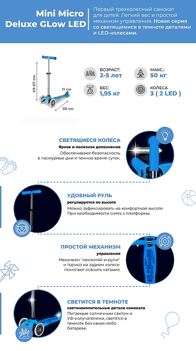 Самокат Mini Deluxe Glow обеспечивает максимально комфортное и безопасное катание для Вашего малыша в пасмурные дни и темное время суток. Позвольте светящимся элементам осветить все вокруг и наблюдайте как ярко они сияют в каждой поездке!