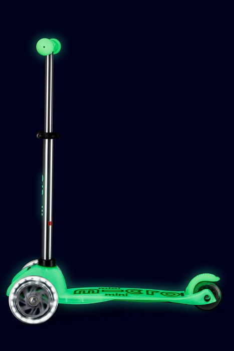 Превратите времяпрепровождение вашего ребенка в яркое волшебство, со светящейся моделью Mini Micro Deluxe Glow LED. Детали самоката: платформа, ручки, тормоз и даже логотип на стойке руля - светятся в темноте без каких-либо батареек. Питаемые солнечным светом или УФ-излучателями, светящиеся элементы создают восхитительное зрелище. Но очарование не только в этом: светодиодные колеса дают дополнительное свечение во время катания.