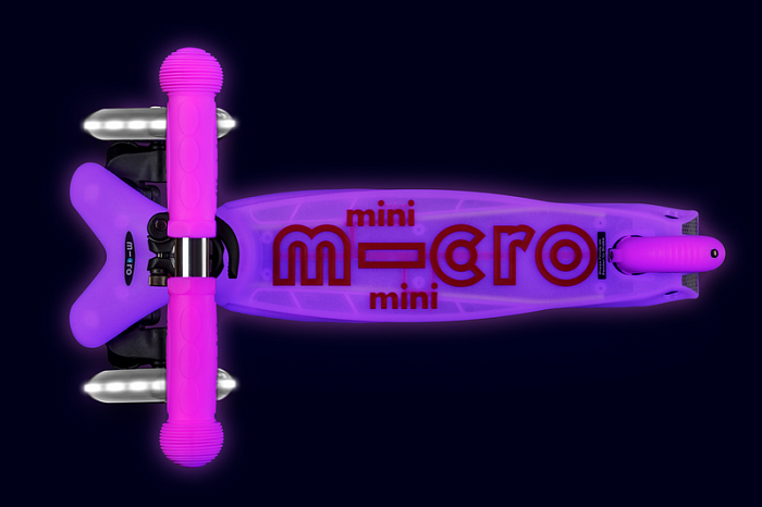 Детский самокат Mini Deluxe Glow (светящийся) LED от известного швейцарского бренда Micro. Разработан специально для детей от 2-х до 5-ти лет.