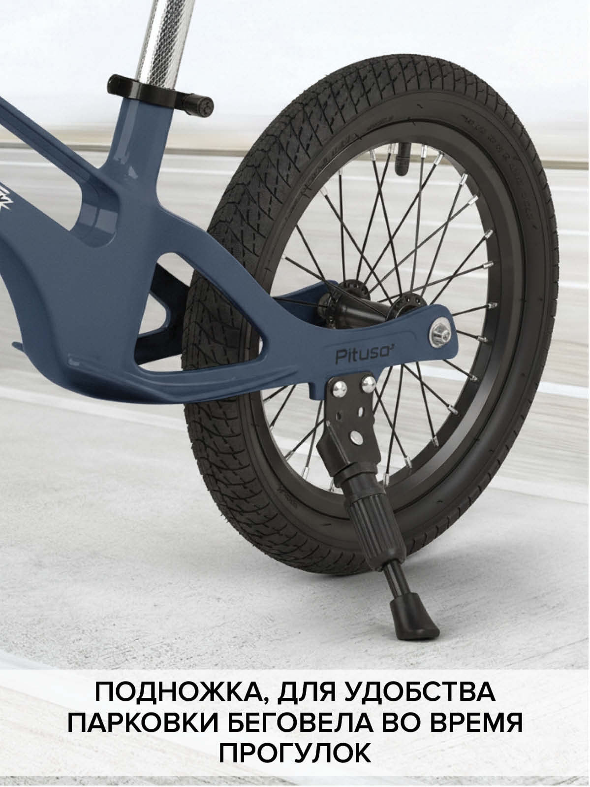 Выступы для ножек на раме позволяют ребёнку поставить ступни во время катания с горки и почувствовать себя как на настоящем велосипеде без педалей. Для удобной парковки во время прогулок у беговела есть подножка — её можно выдвинуть и оставить Pituso Spark стоять без опоры о стену или землю.