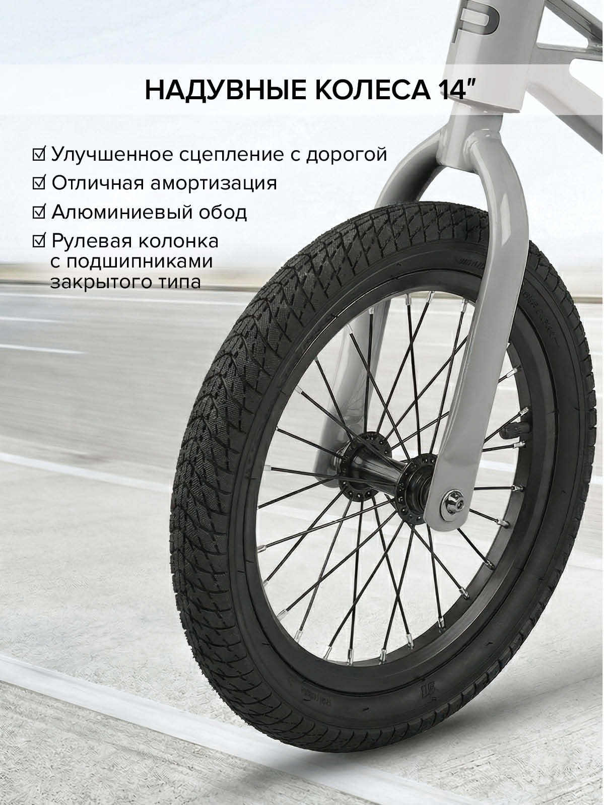 Надувные колёса диаметром 14 дюймов позволяют комфортно кататься по асфальту, тротуарной плитке, утрамбованной грунтовой дороге и короткой траве. Резиновые покрышки лучше сглаживают неровности и обеспечивают хорошее сцепление с поверхностью по сравнению с пластиковыми колёсами.