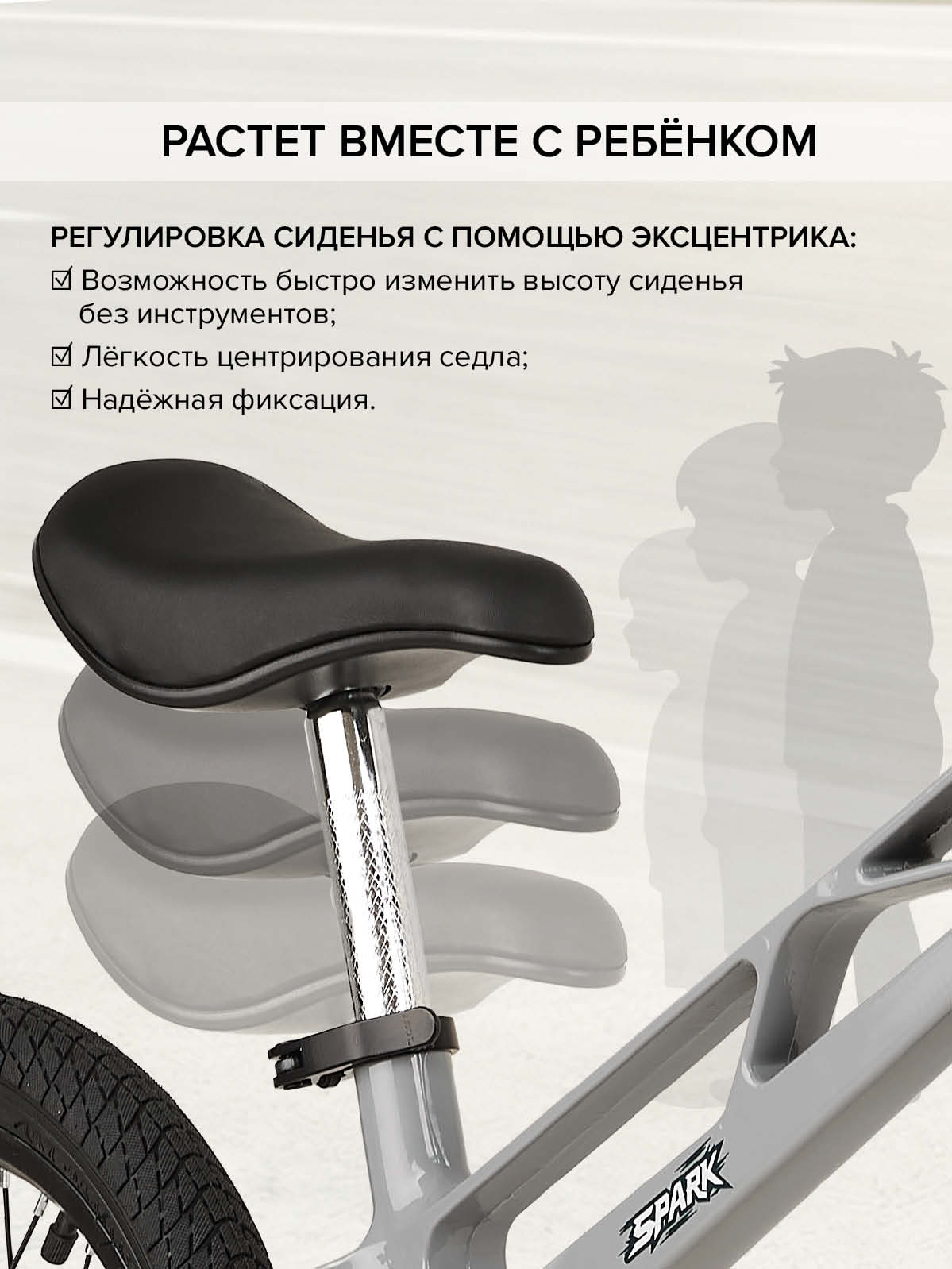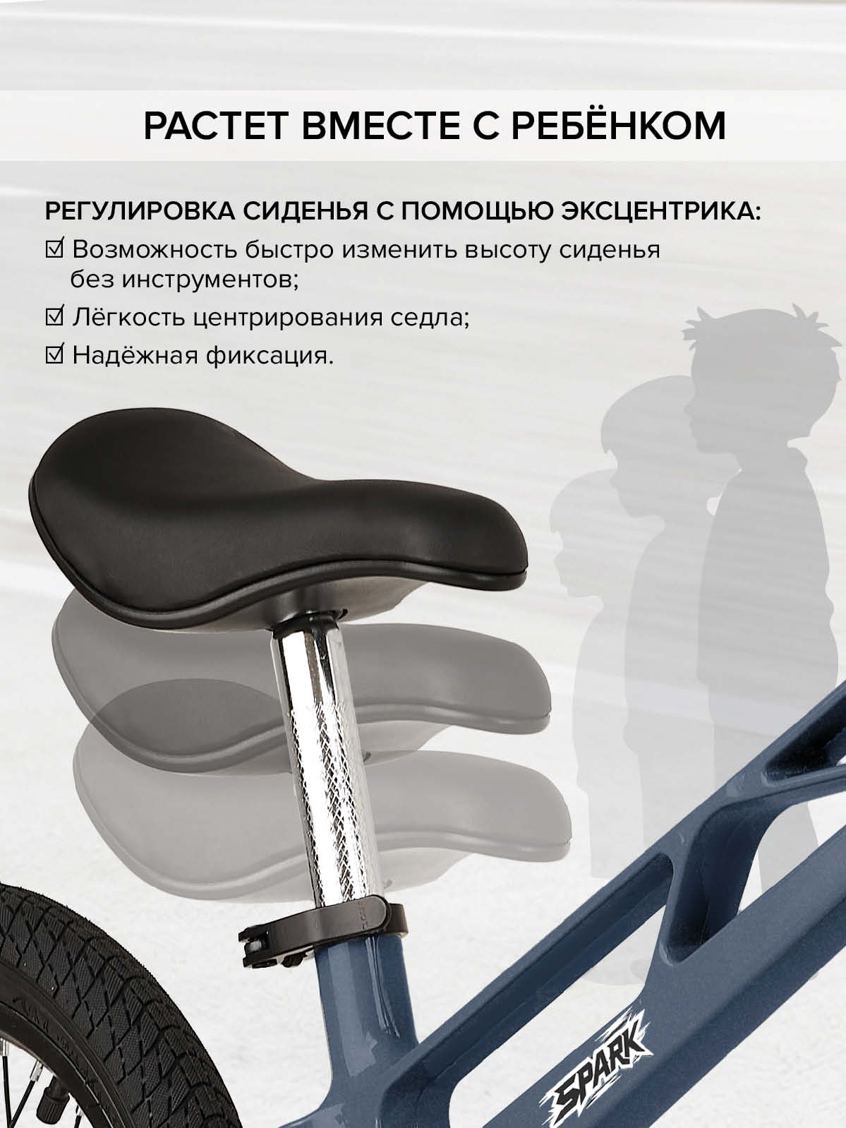 Высота сиденья регулируется в диапазоне примерно 40–47 см с помощью эксцентрика. Зажим позволяет быстро поднять или опустить седло без использования инструментов, поэтому подстроить посадку под рост ребёнка можно прямо во время прогулки.