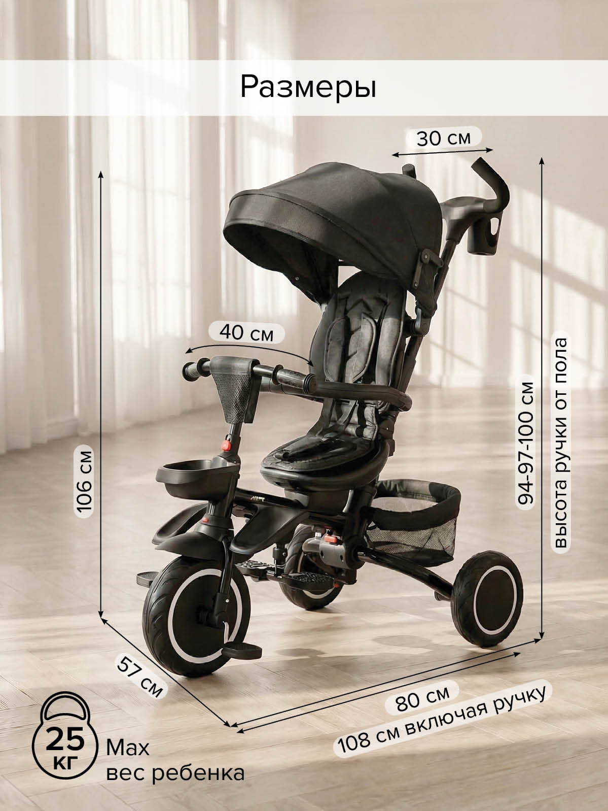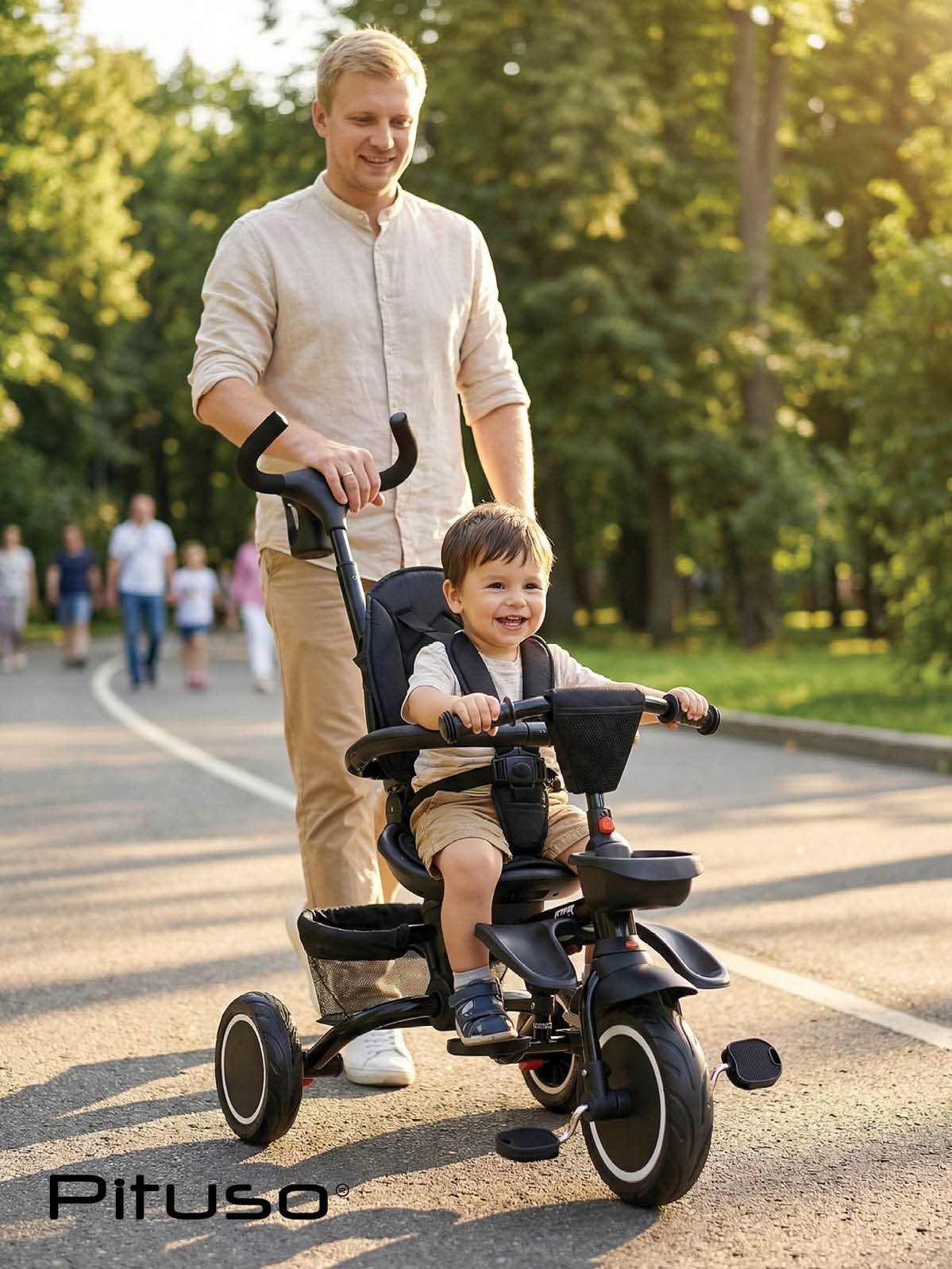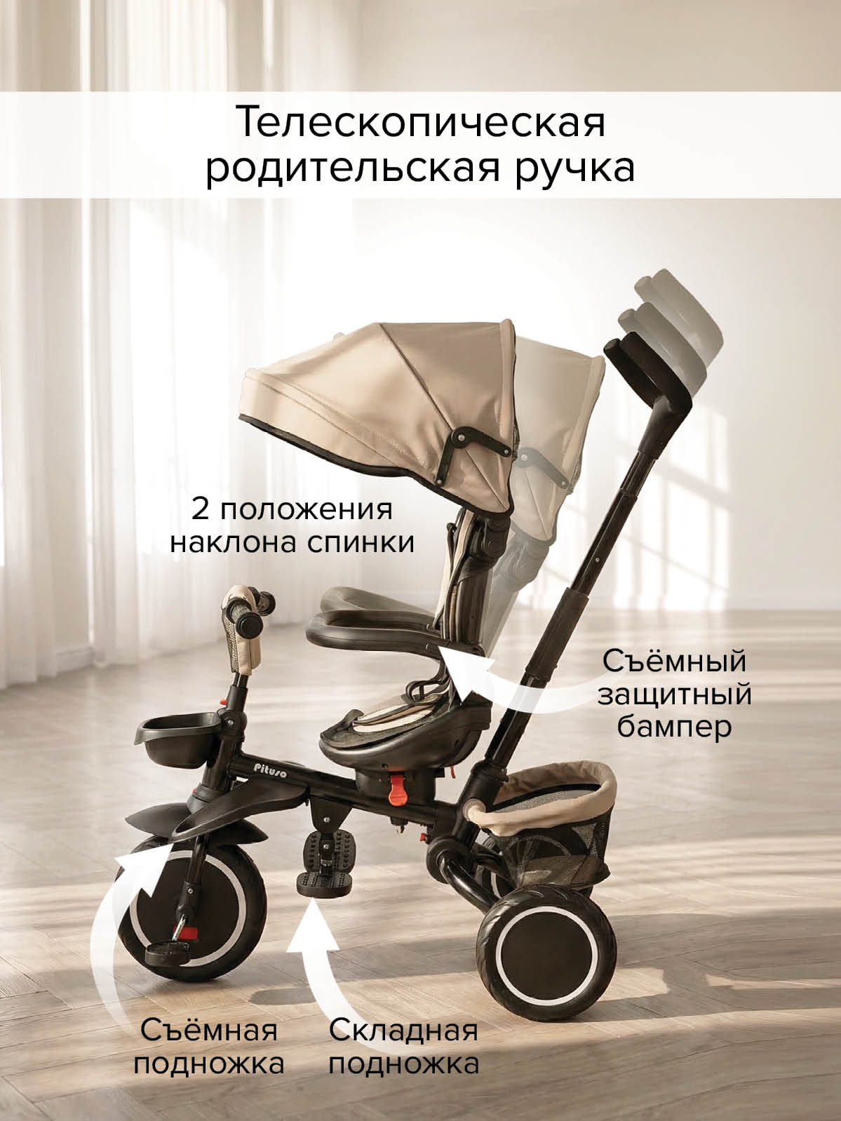 В комплект Pituso Elite Plus 2026 входят: складная стальная рама, телескопическая родительская ручка 94–97–100 см, поворотное сиденье 360° с регулируемой спинкой, 3‑точечный ремень безопасности, складная центральная подножка для ног, съемный защитный бампер, капор от солнца, две пластиковые багажные корзины, текстильная сумочка для мелочей, мягкие резиновые колеса закрытого типа на подшипниках и тормоз на задних колесах. Все элементы продуманы для ежедневного использования – от первых прогулок, когда взрослый полностью управляет велосипедом, до более самостоятельных поездок ребенка.