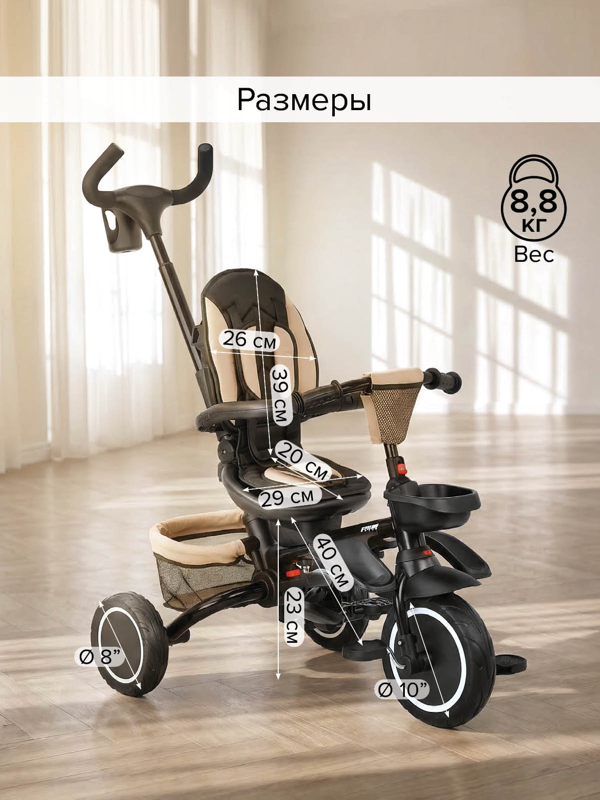 - Колеса: переднее 10", задние 8" (мягкая резина на подшипниках).