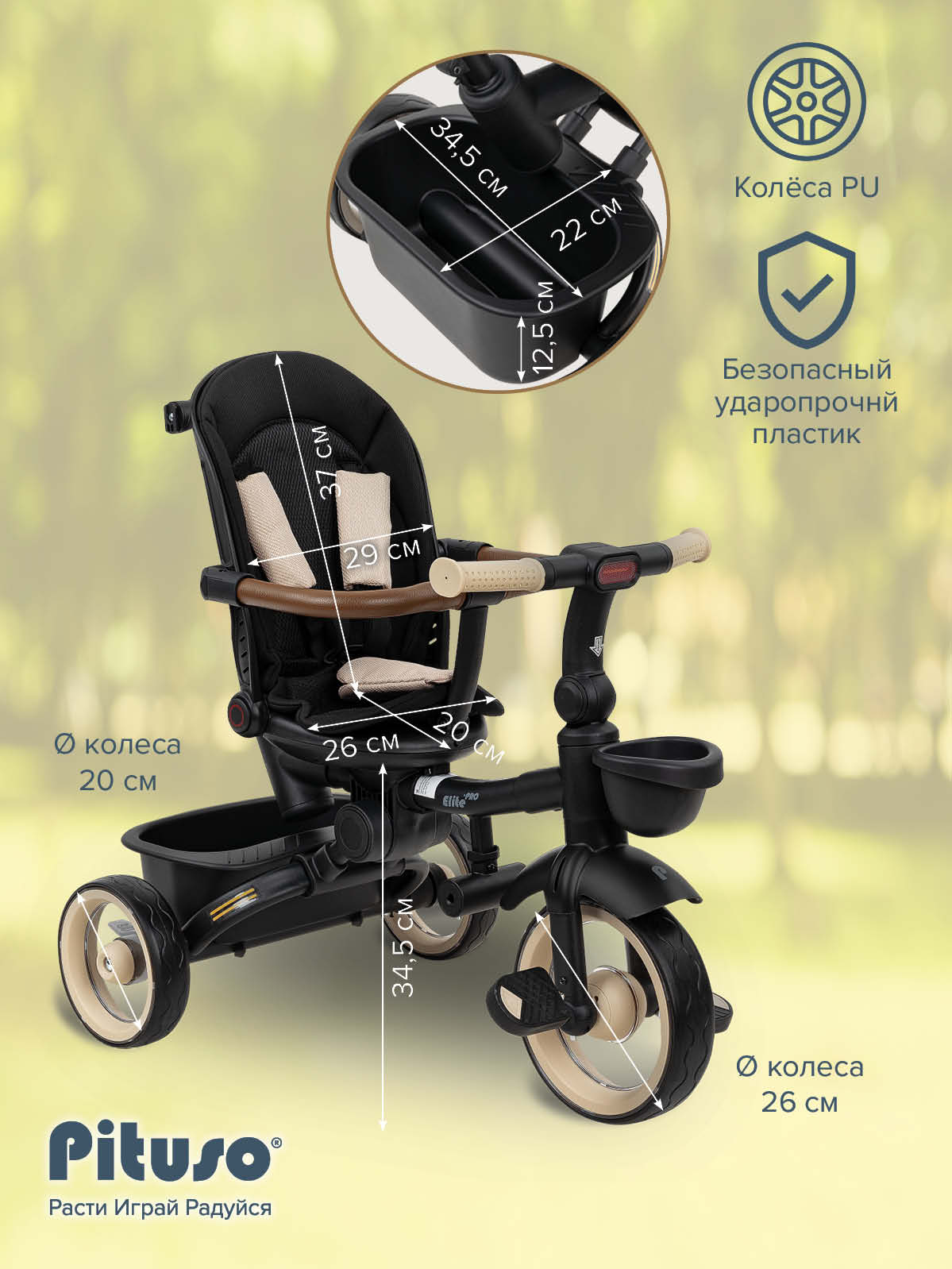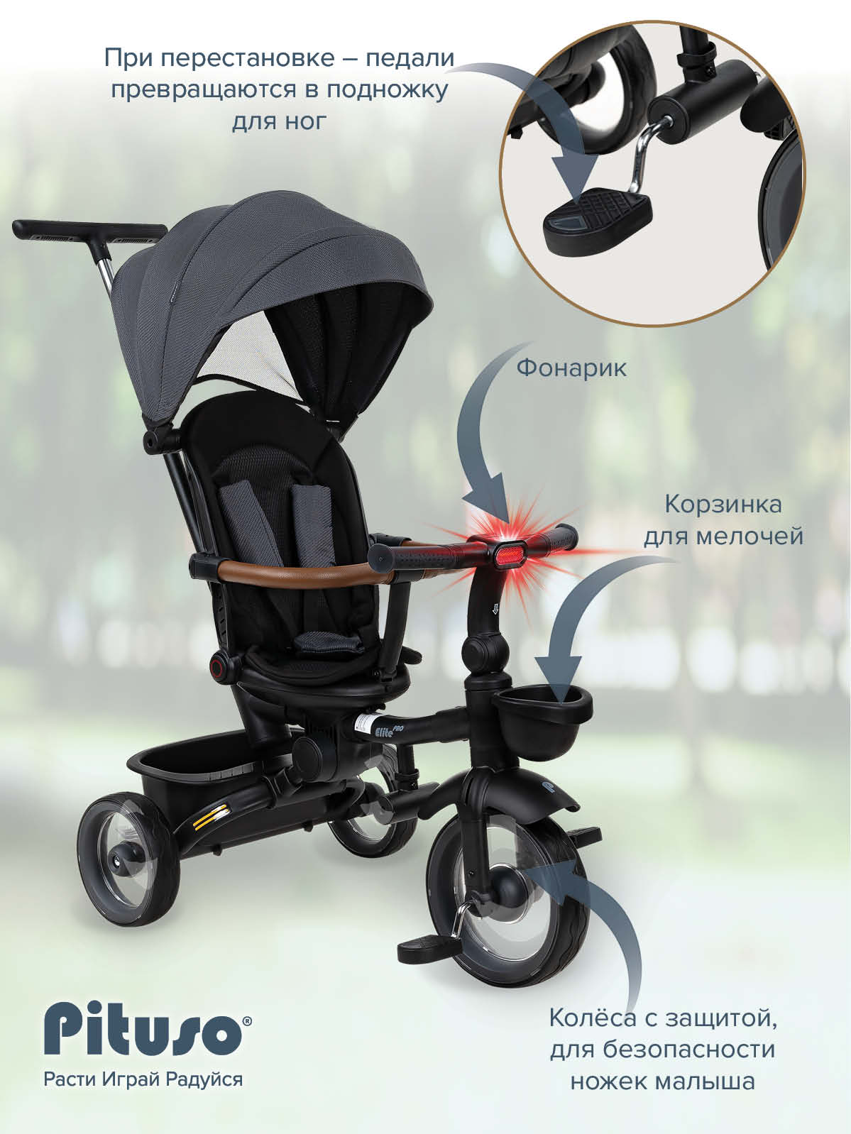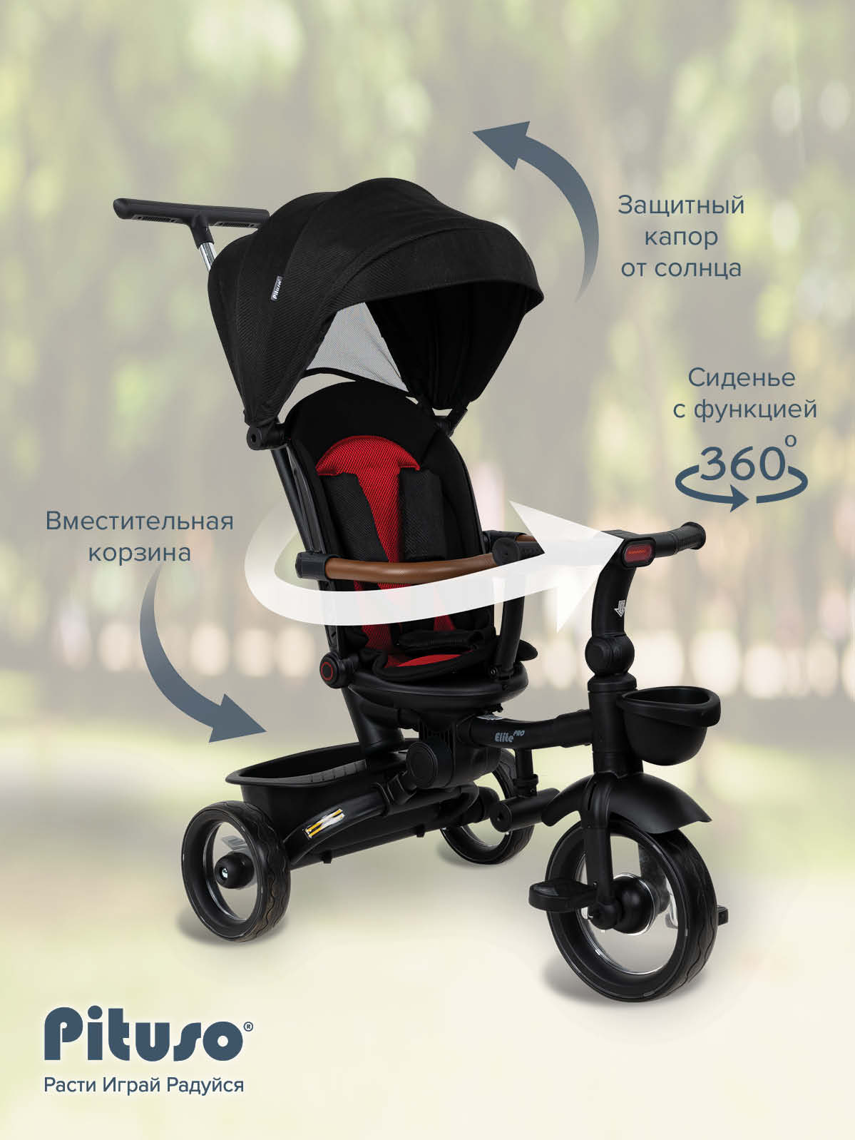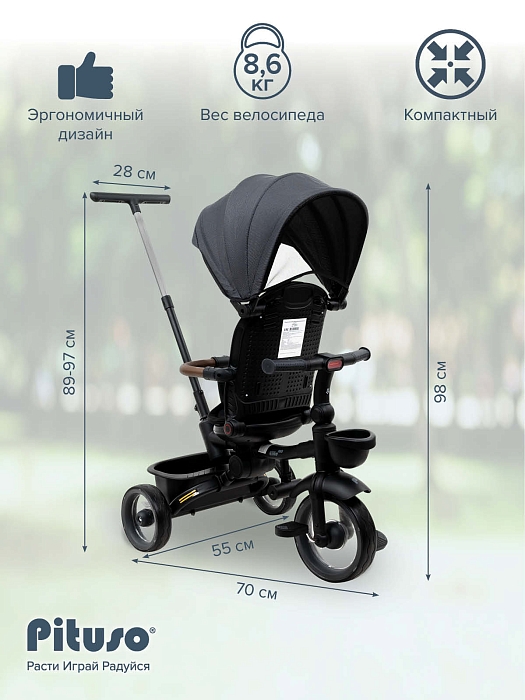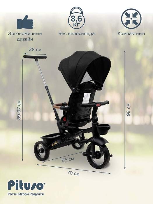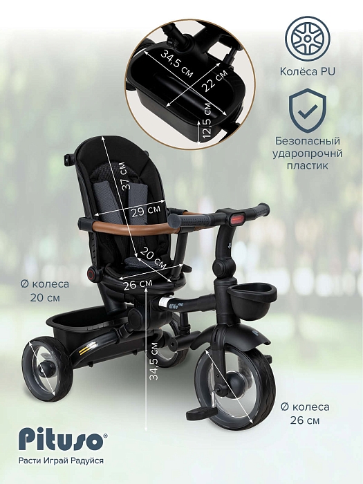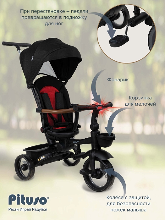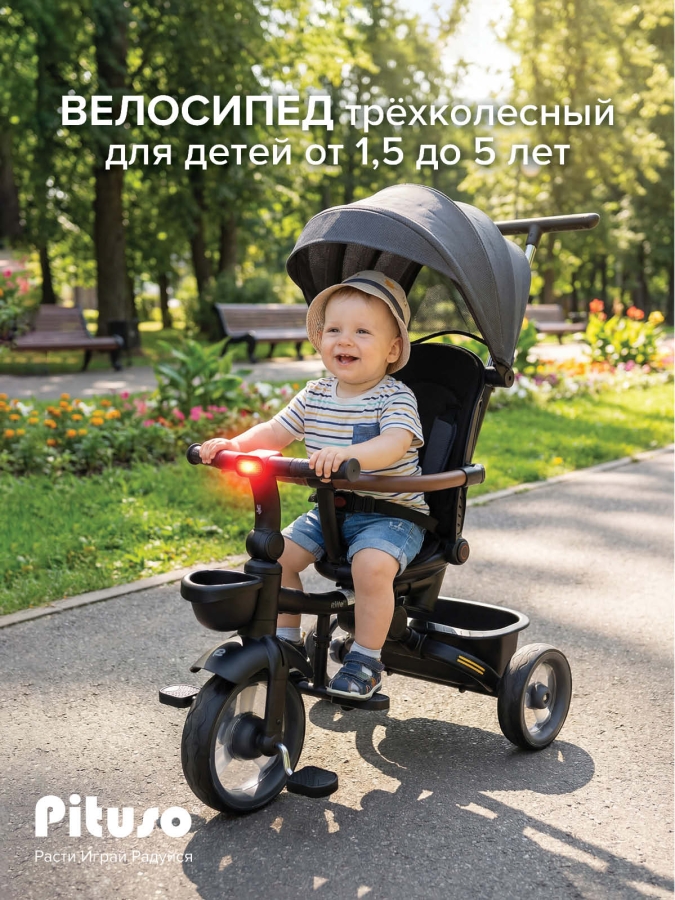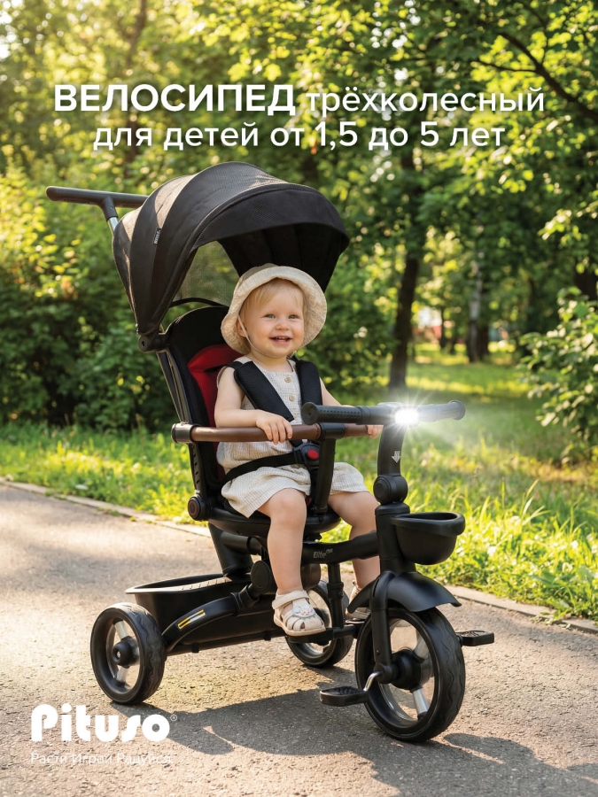 В комплект Pituso Elite Pro входят: стальная рама, телескопическая родительская ручка 89–97 см, сиденье с поворотом 360°, регулируемая спинка (по ходу движения), 3‑точечный ремень безопасности, складная центральная подножка, съемный защитный бампер, защитный капор от солнца, две пластиковые багажные корзины, складной руль, колеса из PU, рулевая панель со световыми эффектами (работает от 2 батареек АА, не входят в комплект), тормоз на задних колесах. Такой набор делает велосипед удобным и для ребенка, и для родителей на всех этапах эксплуатации – от первых поездок под полным контролем взрослого до более самостоятельного катания.