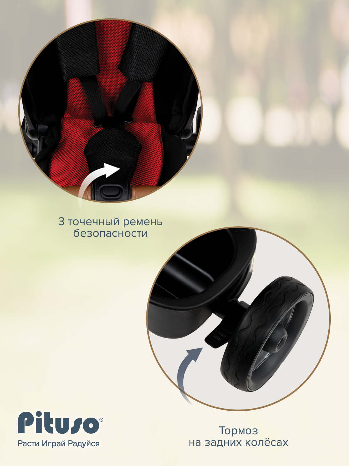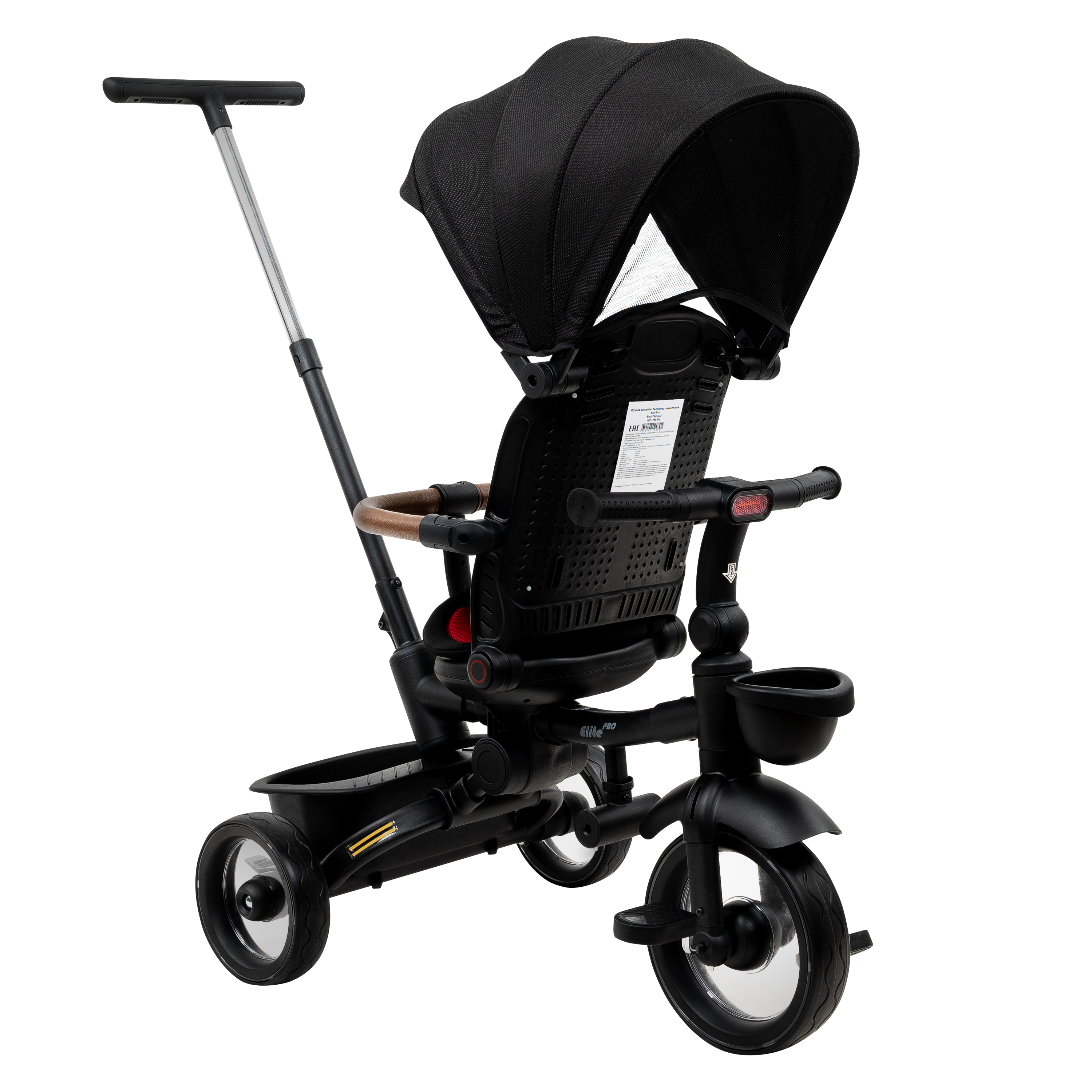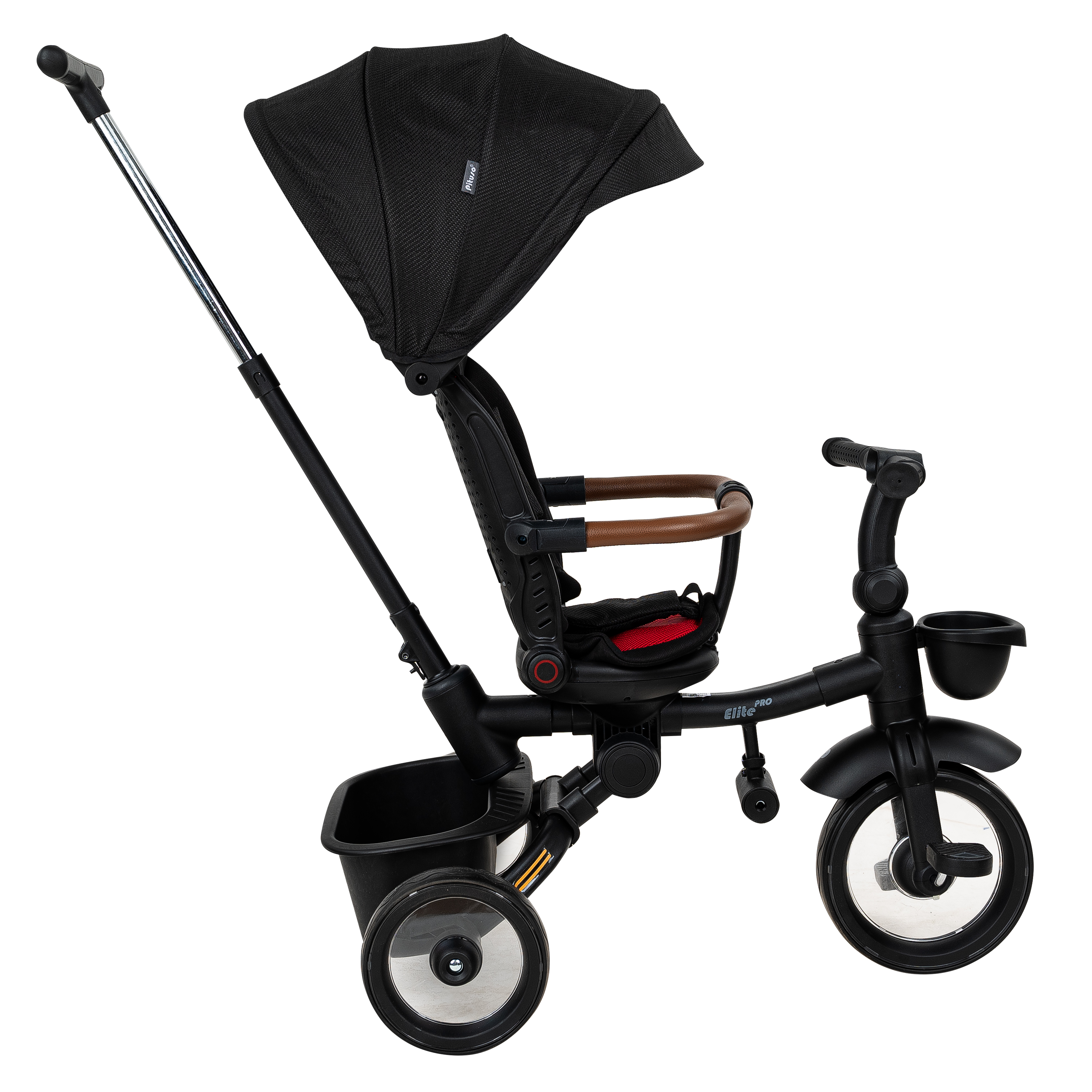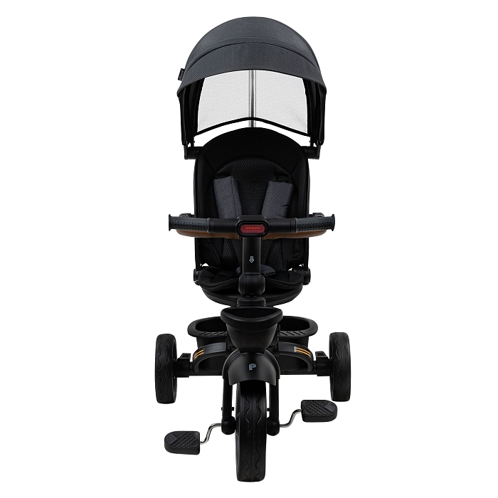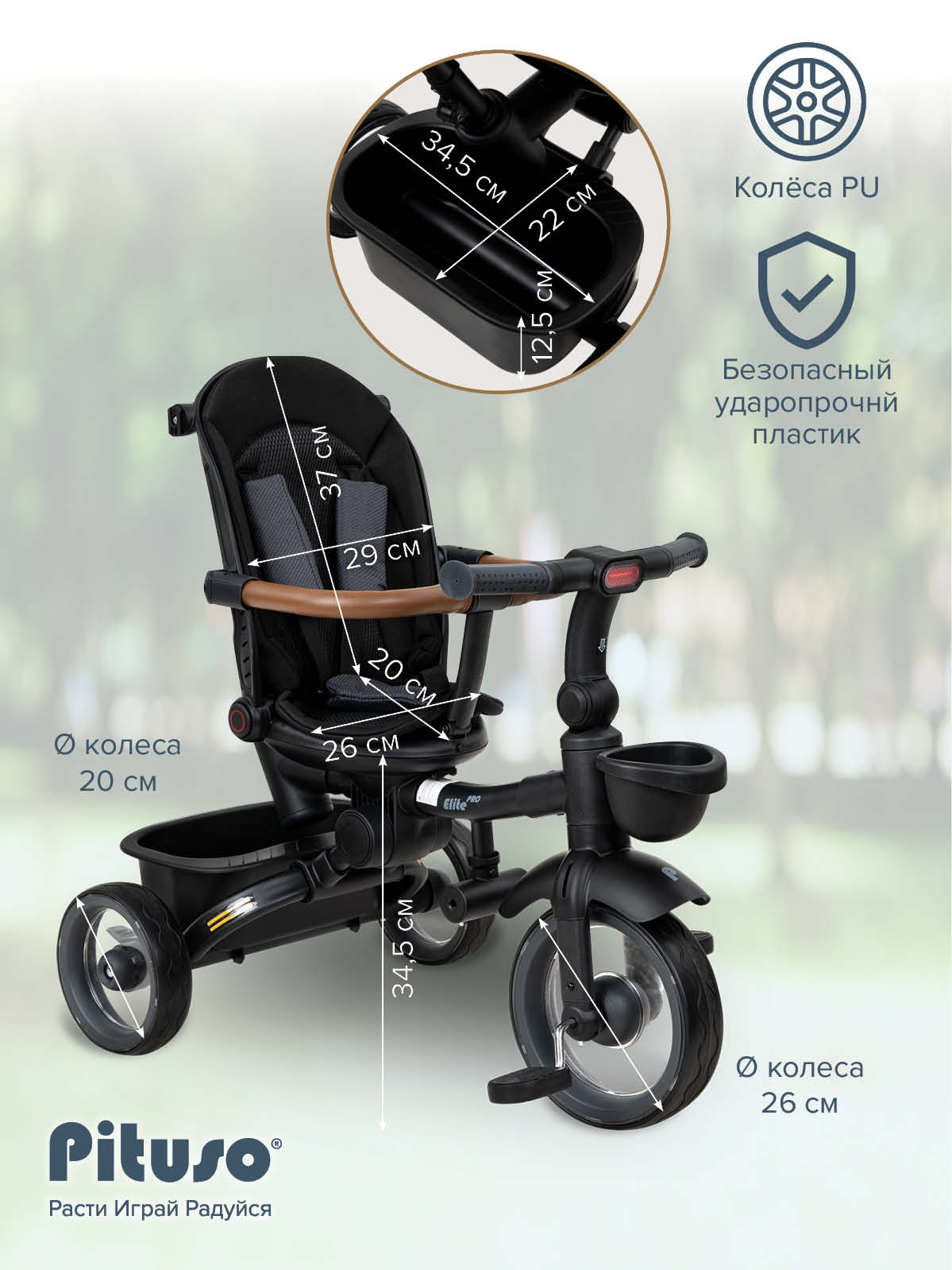 В комплект Pituso Elite Pro входят: стальная рама, телескопическая родительская ручка 89–97 см, сиденье с поворотом 360°, регулируемая спинка (по ходу движения), 3‑точечный ремень безопасности, складная центральная подножка, съемный защитный бампер, защитный капор от солнца, две пластиковые багажные корзины, складной руль, колеса из PU, рулевая панель со световыми эффектами (работает от 2 батареек АА, не входят в комплект), тормоз на задних колесах. Такой набор делает велосипед удобным и для ребенка, и для родителей на всех этапах эксплуатации – от первых поездок под полным контролем взрослого до более самостоятельного катания.
