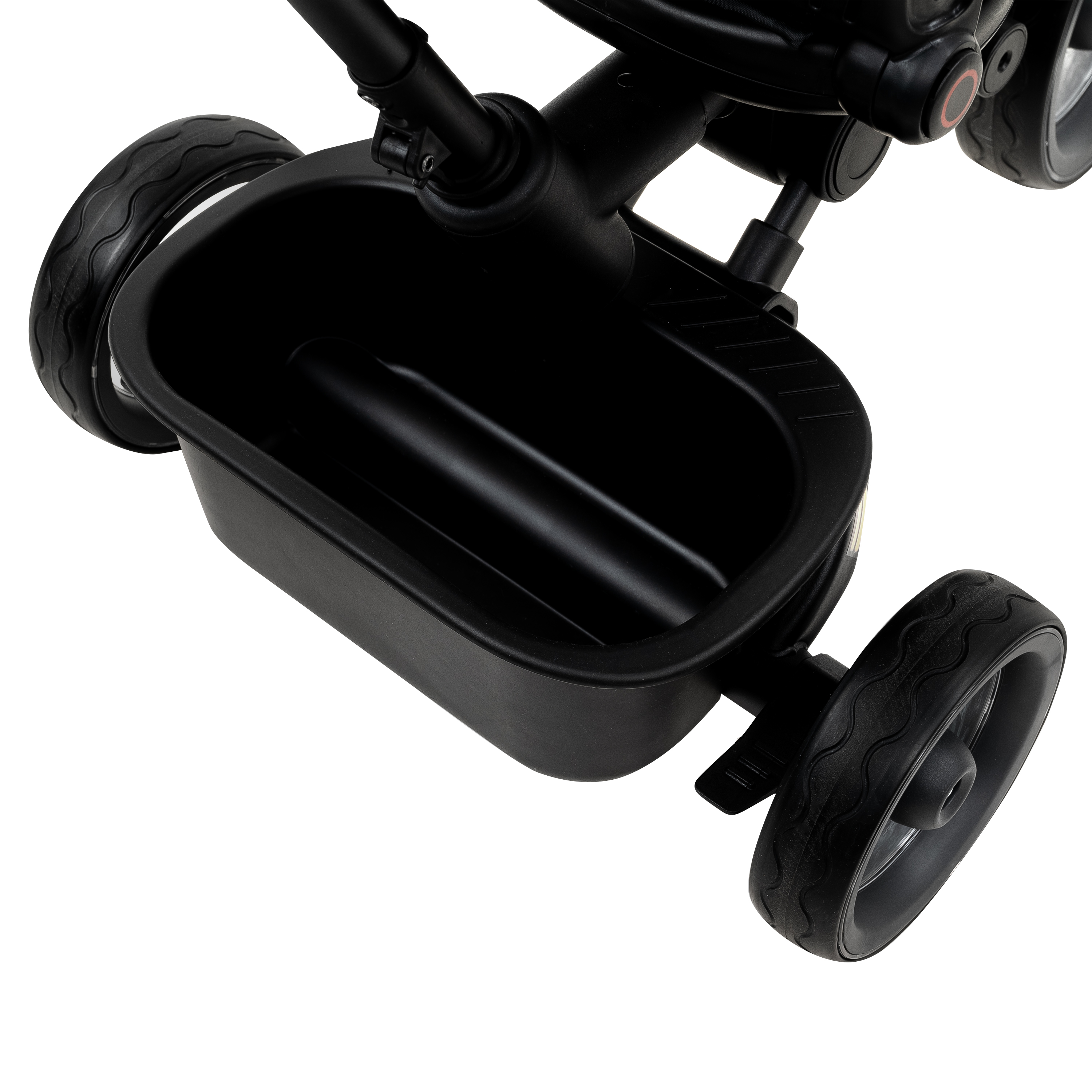 В комплект входят: стальная рама, сиденье 360° с регулируемой спинкой, телескопическая ручка, 3‑точечный ремень, апорная подножка, защитный бампер, капор от солнца, две пластиковые корзины, рулевая панель со световыми эффектами и тормоз задних колес.