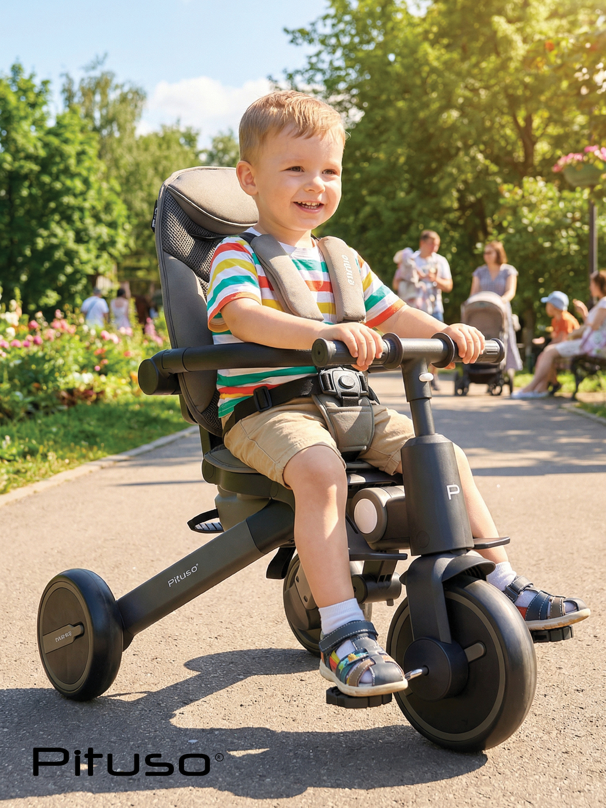 Складной трехколесный велосипед Pituso Leve Pro (2026) - обновленная версия популярного реверсивного варианта с переставными педалями и удобным магнитным замком. Это легкий, маневренный и современный транспорт для детей примерно от 1,5 до 5 лет, рассчитанный на ежедневные прогулки в городе и на природе. В комплект входит вместительный фирменный рюкзак, который крепится на раму или используется отдельно, что удобно для родителей.
