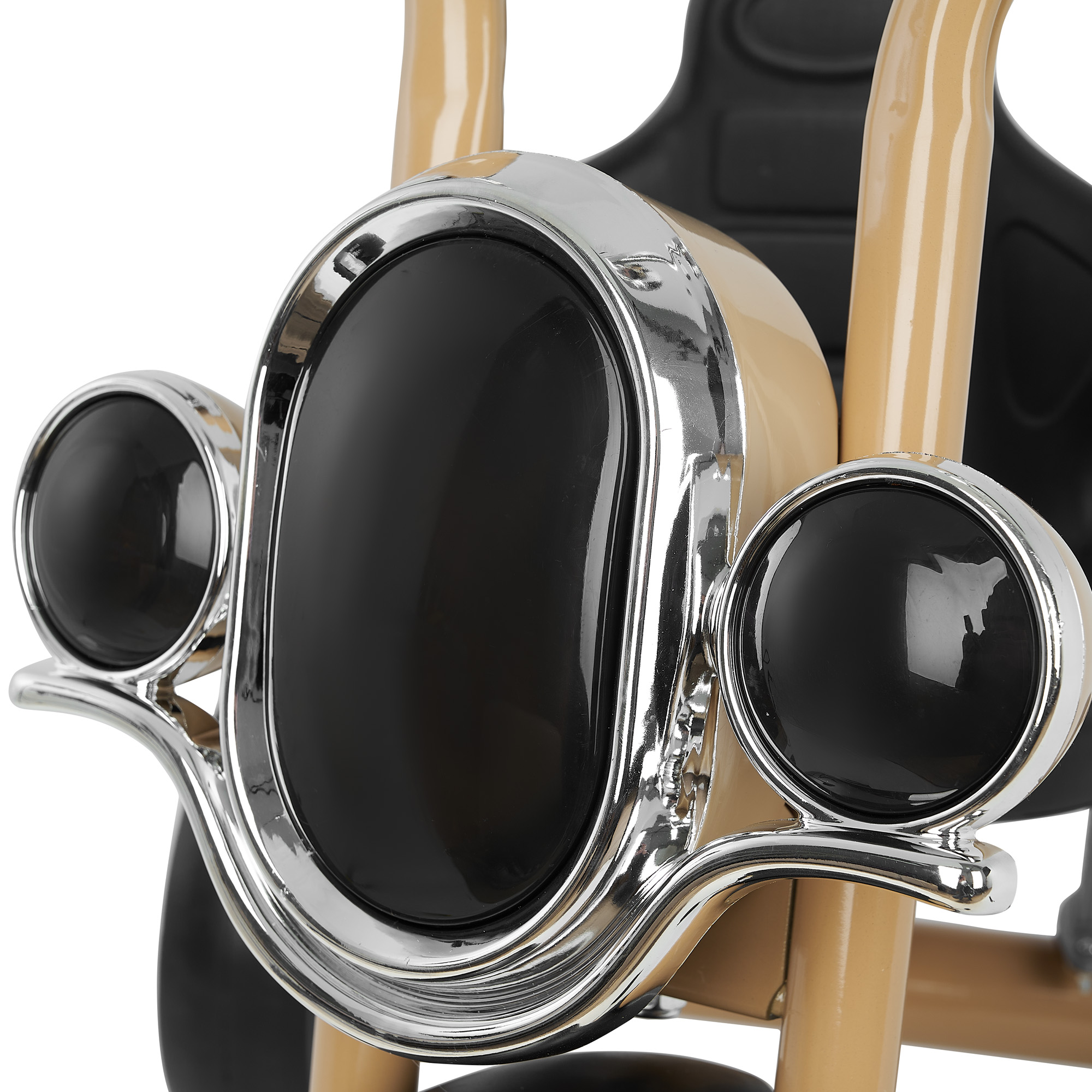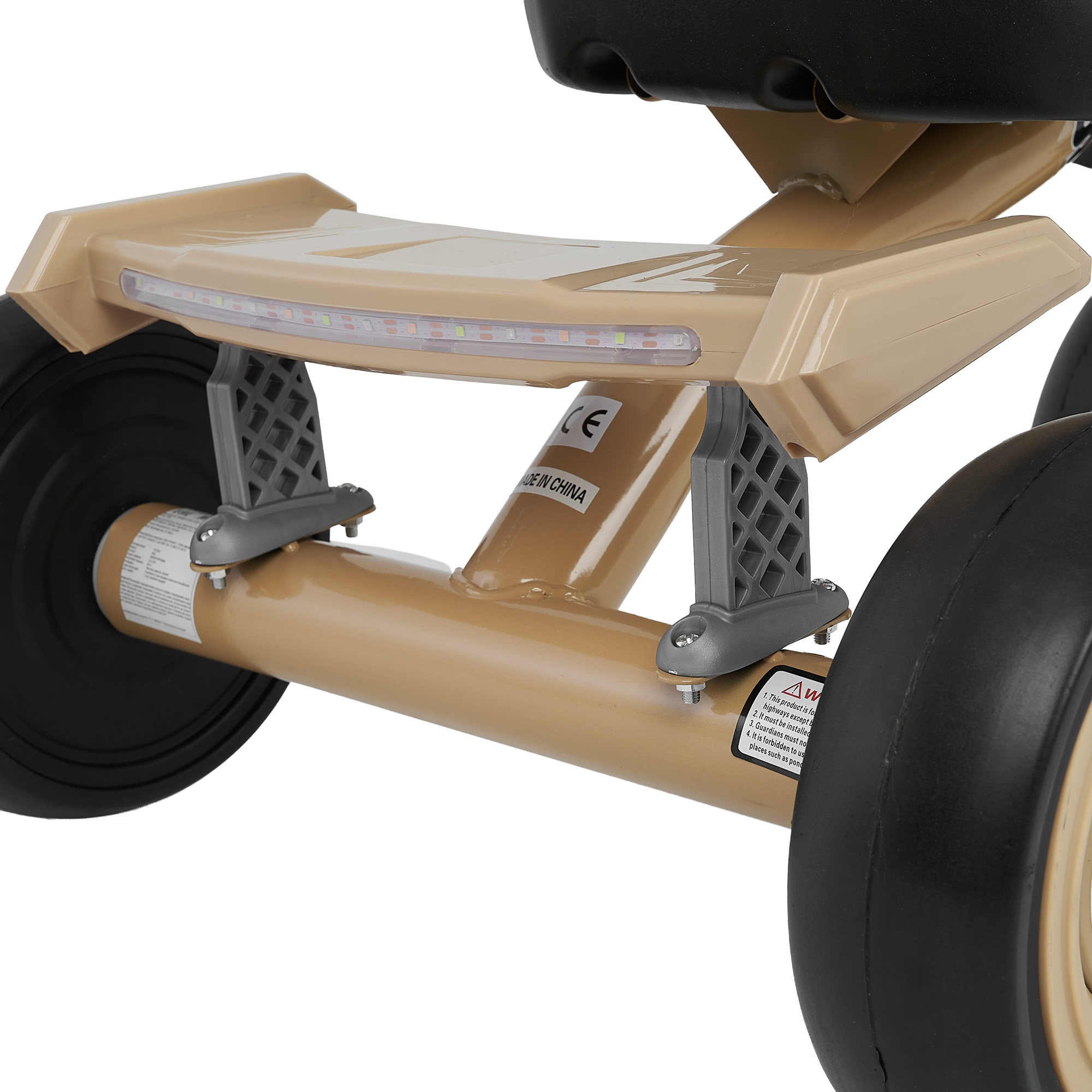 Модель оснащена надёжным механизмом привода на переднее колесо, обеспечивающим плавный ход и понятное управление. Подсветка передней фары с разноцветным миганием и подсветка на заднем спойлере создают эффект «настоящего транспорта» и повышают интерес ребёнка к прогулкам. Музыкальное сопровождение дополняет впечатление, превращая обычное катание в яркую игровую активность.