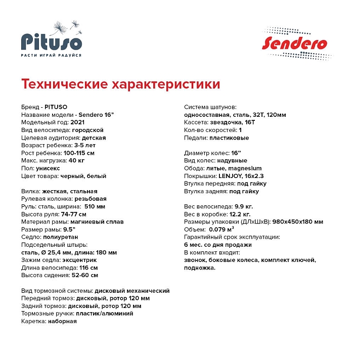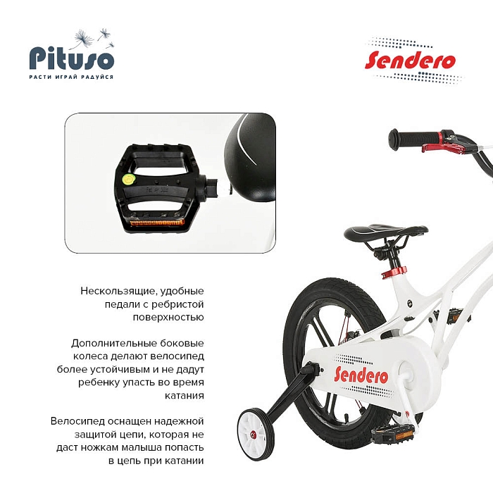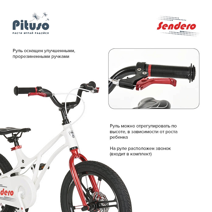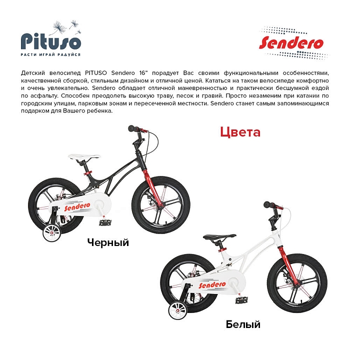 Детский велосипед PITUSO Sendero 16" порадует Вас своими функциональными особенностями, качественной сборкой, стильным дизайном и отличной ценой. Кататься на таком велосипеде комфортно и очень увлекательно. Sendero обладает отличной маневренностью и практически бесшумной ездой по асфальту. Способен преодолеть высокую траву, песок и гравий. Просто незаменим при катании по городским улицам, парковым зонам и пересеченной местности. Sendero станет самым запоминающимся подарком для Вашего ребенка.