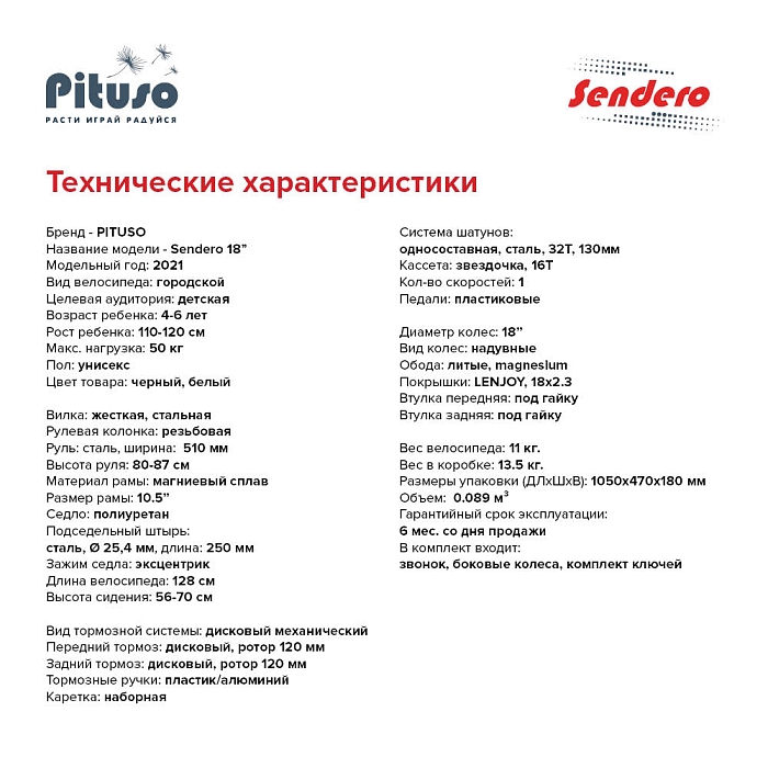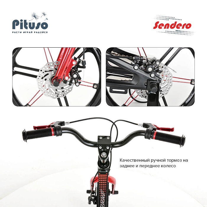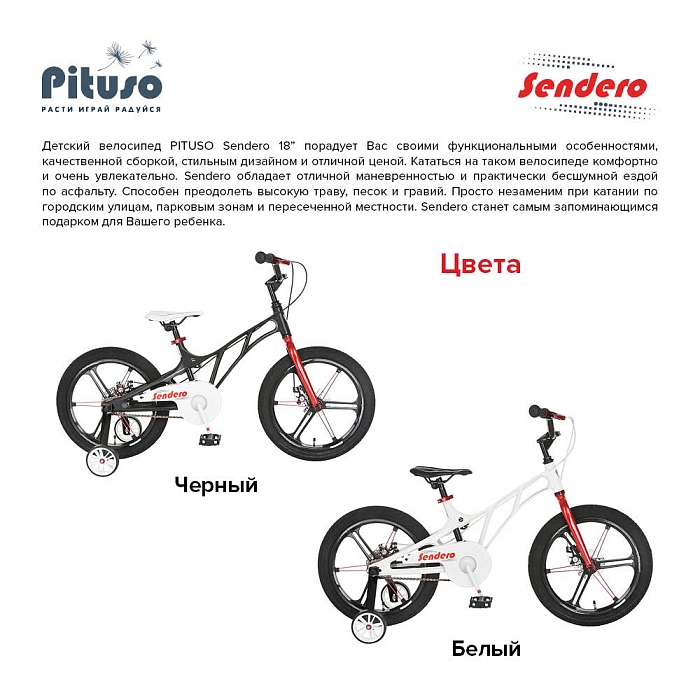 Детский велосипед PITUSO Sendero 18" порадует Вас своими функциональными особенностями, качественной сборкой, стильным дизайном и отличной ценой. Кататься на таком велосипеде комфортно и очень увлекательно. Sendero обладает отличной маневренностью и практически бесшумной ездой по асфальту. Способен преодолеть высокую траву, песок и гравий. Просто незаменим при катании по городским улицам, парковым зонам и пересеченной местности. Sendero станет самым запоминающимся подарком для Вашего ребенка.