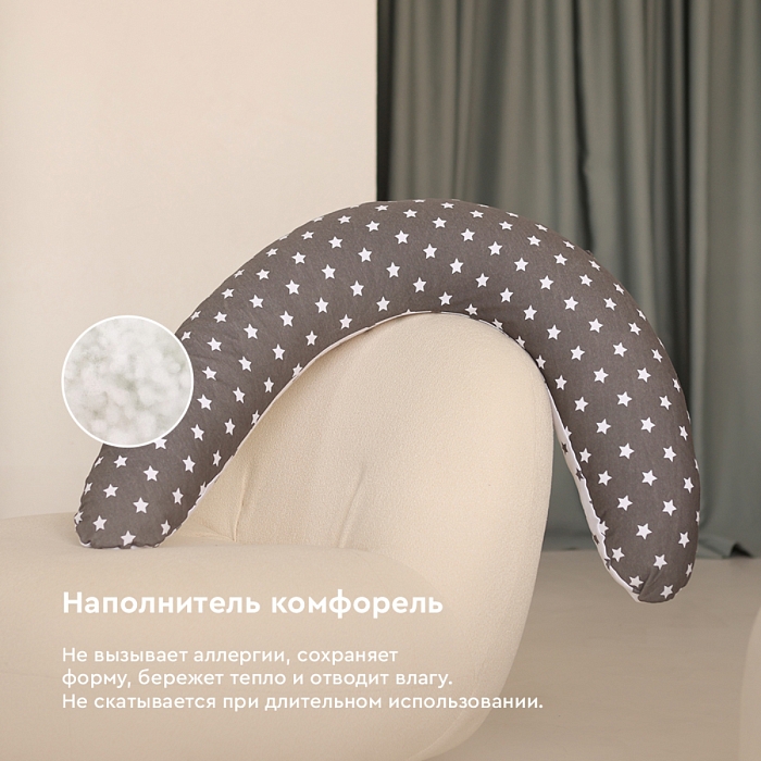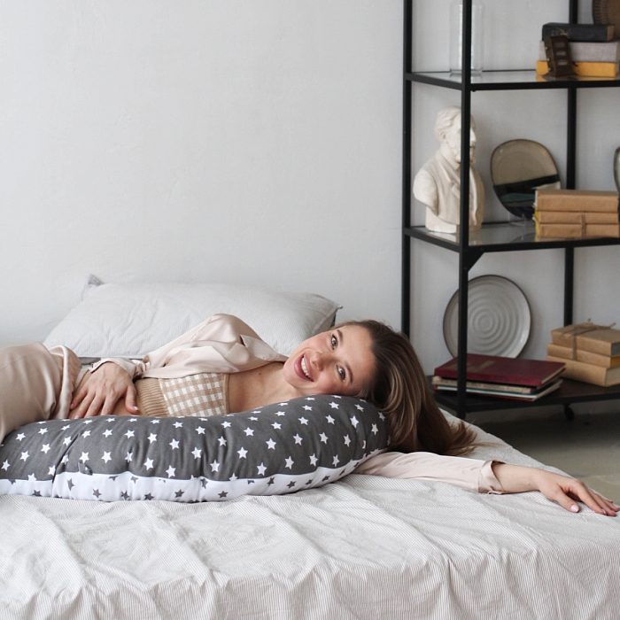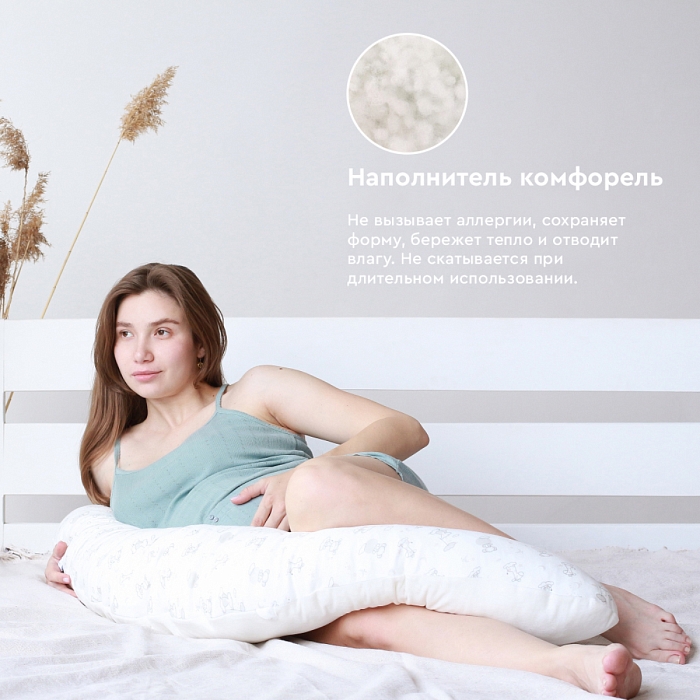 Подушка для беременных – аксессуар, который по достоинству оценит каждая будущая мама. Её удобно использовать в кровати во время отдыха, разгружая мышцы бёдер или в положении сидя для удобной поддержки поясницы. Наполнителем служит гипоаллергенный комфорель, который не сбивается в комки при длительном использовании. На нижнем чехле есть молния, которая позволяет достать наполнитель и отрегулировать плотность подушки, подстраивая её под себя.