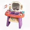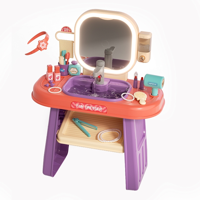 Оригинальный игровой набор состоит из пластмассового столика с мойкой и полочкой, а также большого зеркала с подсветкой.