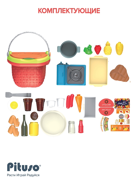 Комплектность: Корзина-1 шт.,тарелка - 1 шт, поднос-1 шт., кастрюля-1 шт., стаканчик -2шт., плитка (имитация) -1шт, щипцы-1шт., продукты и напитки-20шт.