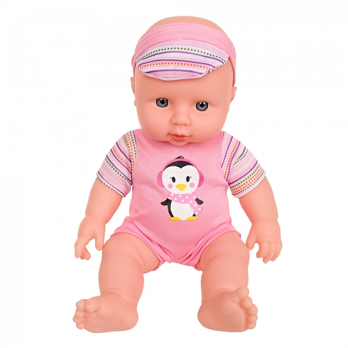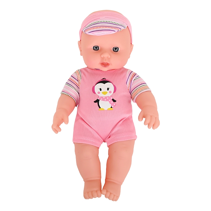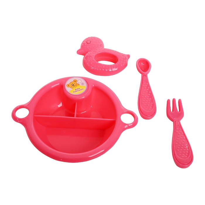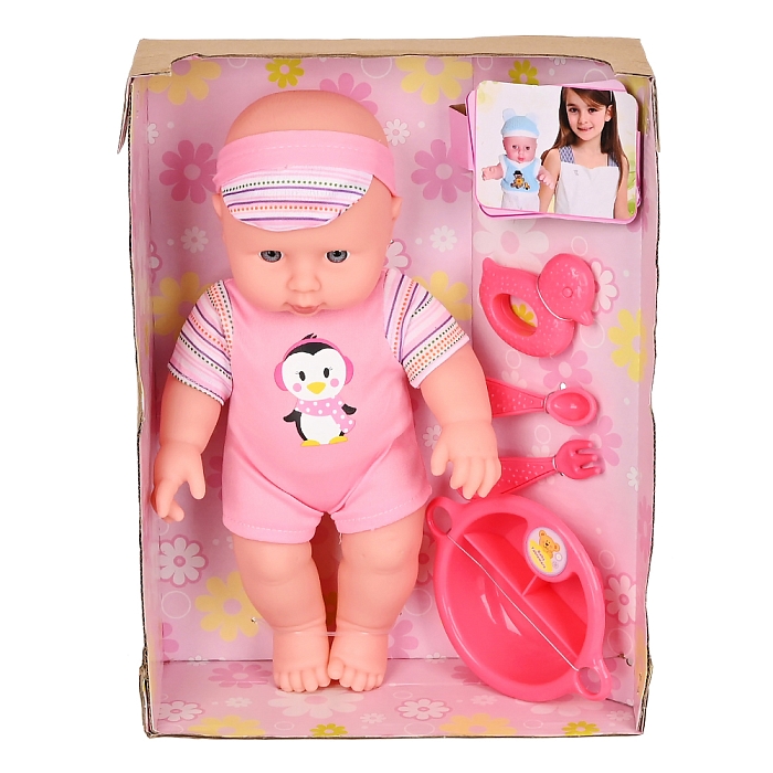 В комплекте: Пупс с одеждой - 1 шт., игрушка-погремушка -1 шт., тарелка-1шт., ложка - 1 шт., вилка-1 шт.