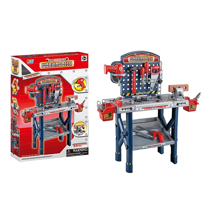 Рабочий стол с отверстиями для крепления винтов, дрель, пила, молоток, гаечный ключ, отвертка и другие аксессуары сделают игру юного мастера не забываемой;