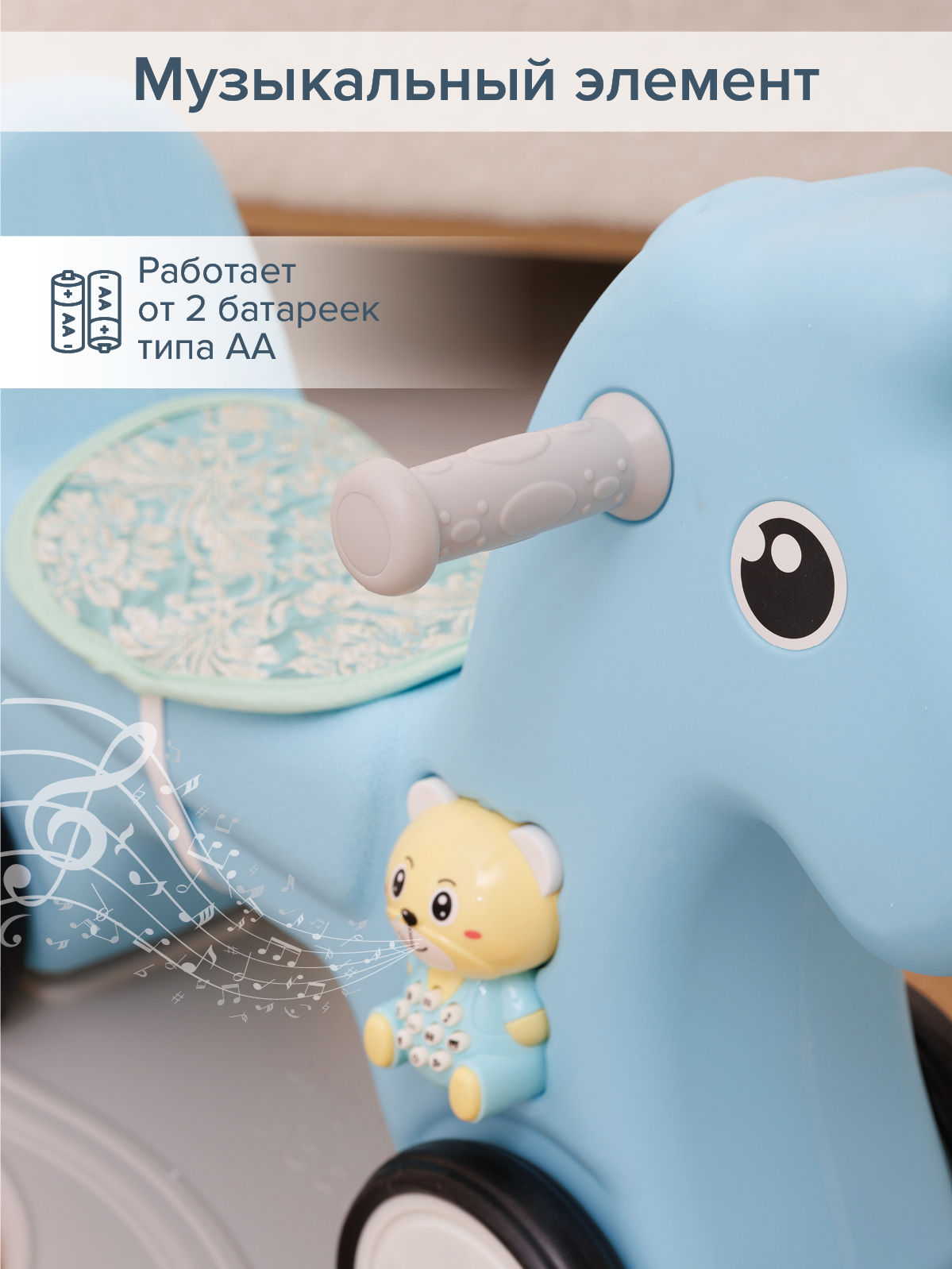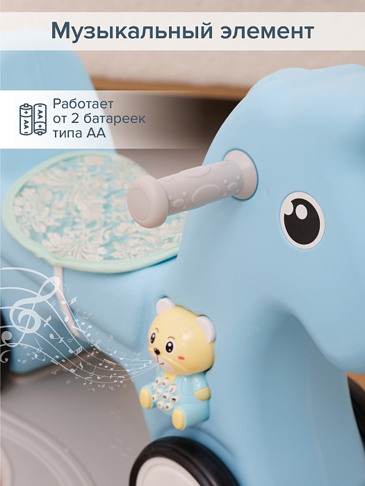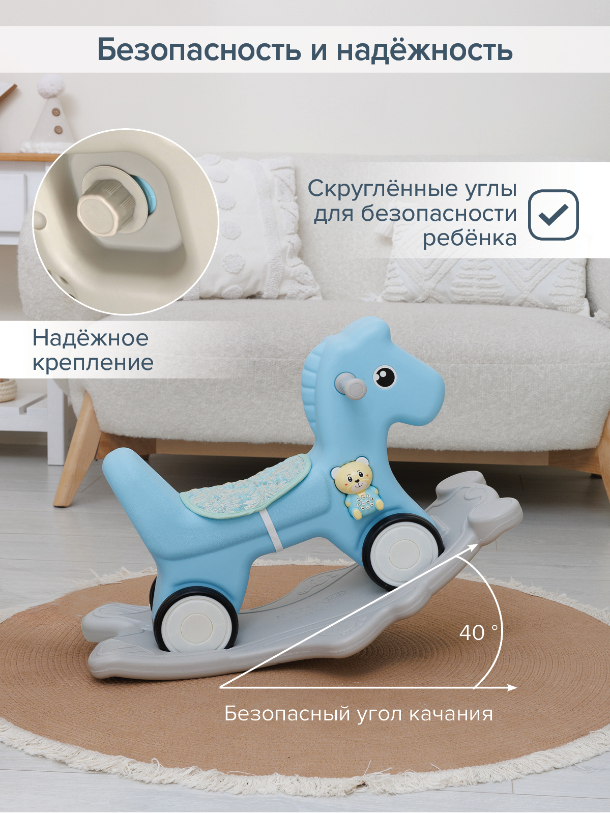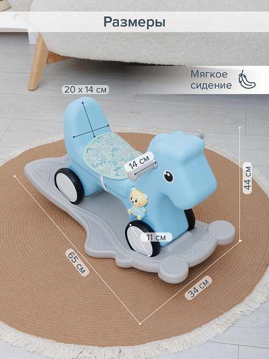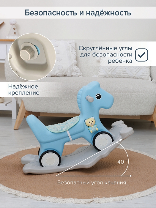 Также качалка оснащена специальными блокирующими выступами на поддоне, защищающими от опрокидывания, мягким седлом, ручками на голове лошадки и музыкальным элементом.